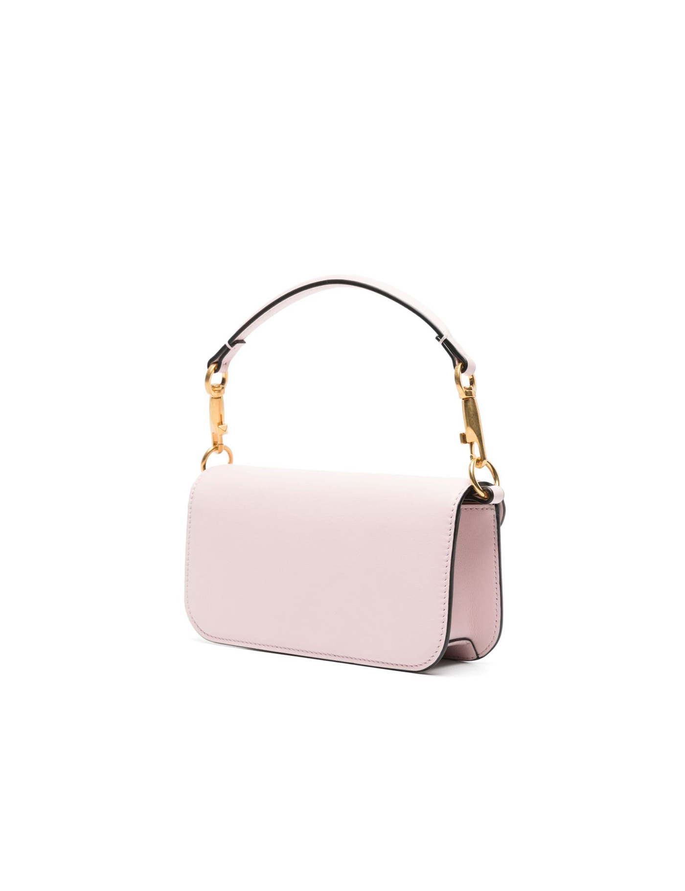 small Locò leather shoulder bag from VALENTINO GARAVANI featuring light pink, calf leather, gold-tone hardware, VLogo Signature, gold-tone Rockstud detailing, internal logo stamp, foldover top with magnetic fastening, single detachable top handle, detachable chain-link shoulder strap, main compartment and internal slip pocket.