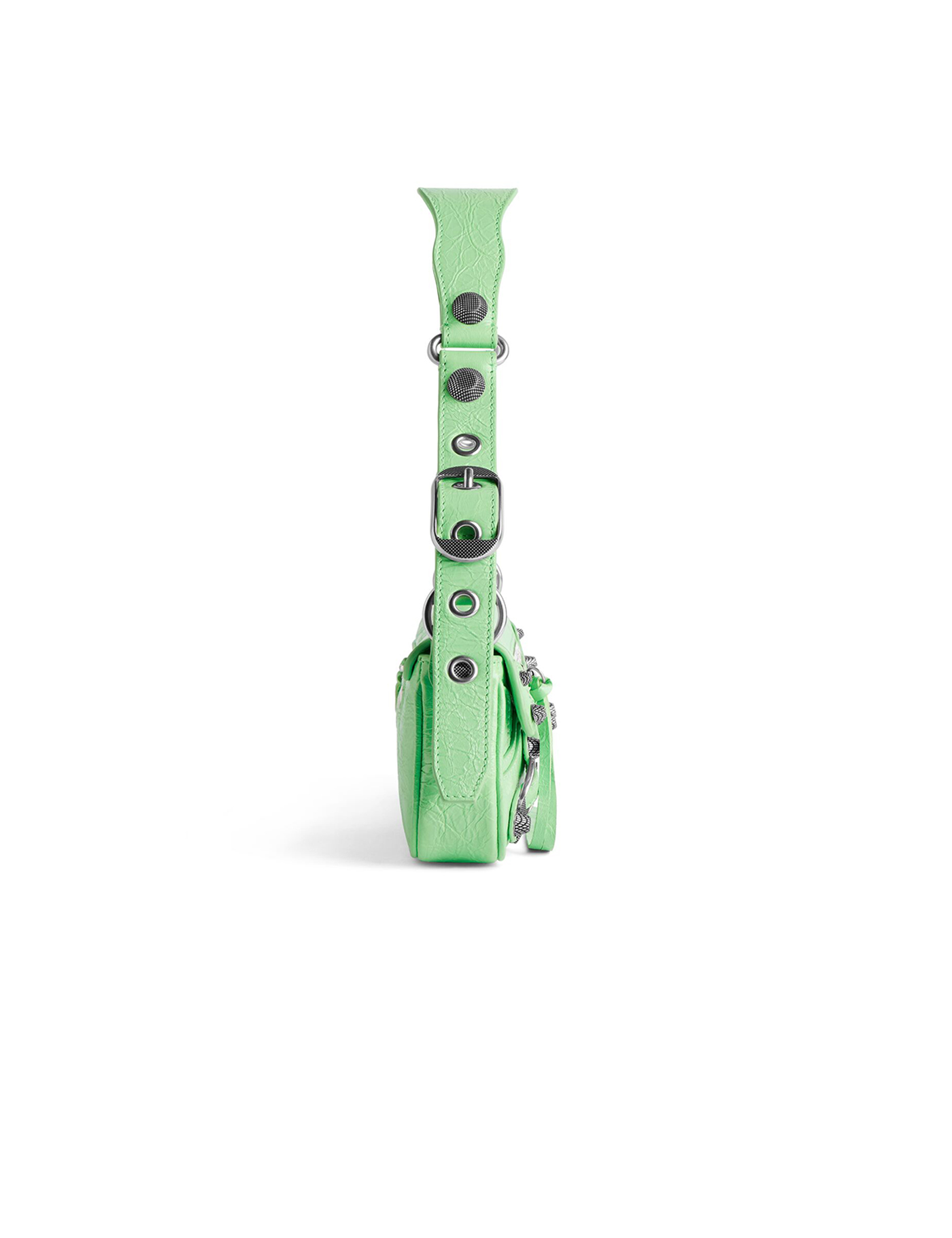 Balenciaga’s Le Cagole Sling XS bag in mint green wrinkled effect leather featuring an adjustable handle, flap with zip pocket and concealed magnetic fastening, back zip pocket and engraved silver-tone metal hardware studs and buckles.