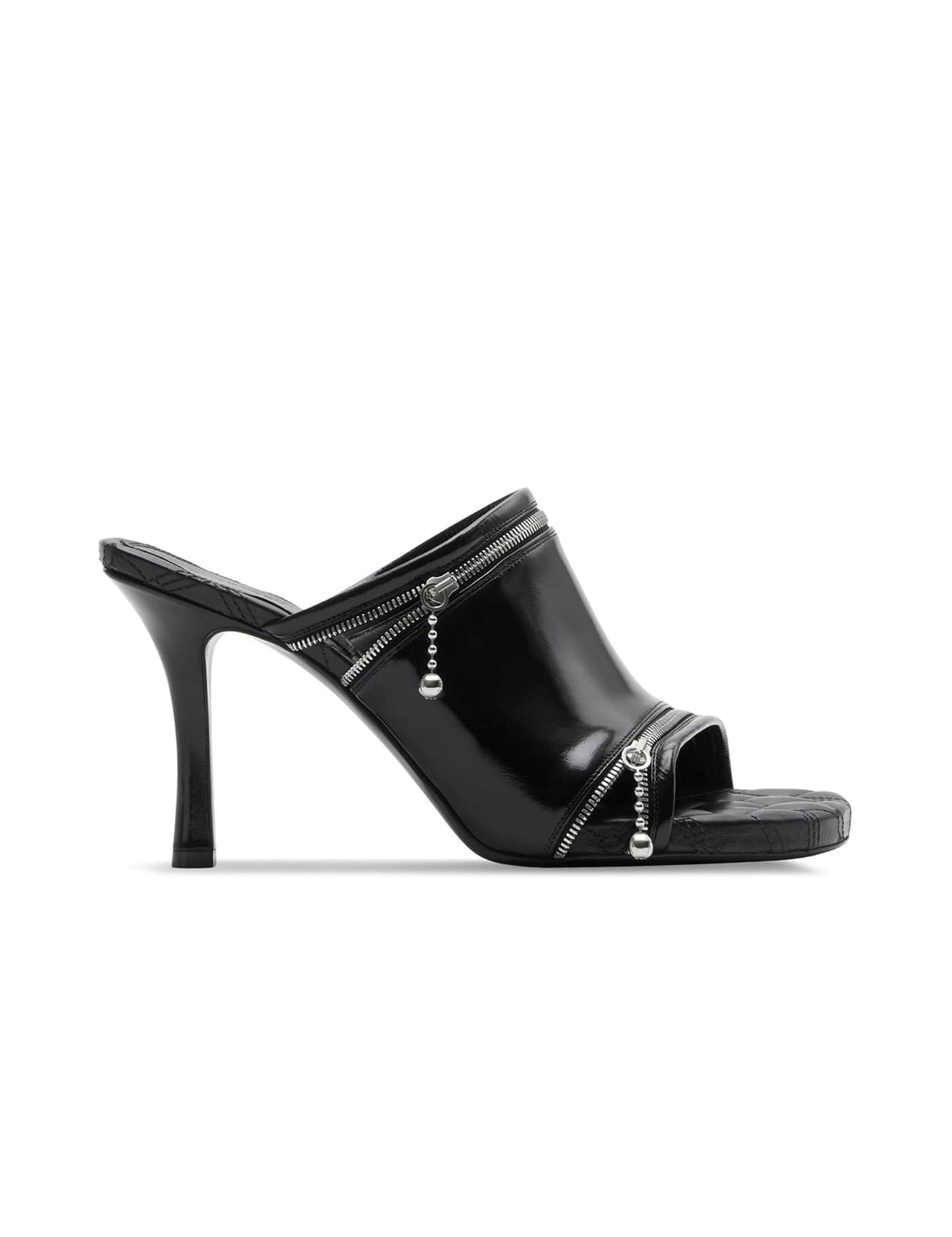 Peep mules by Burberry crafted in glossy leather complete with two silver-tone metal zip openings. Quilted leather insole, covered stiletto heel, leather sole with contrasting engraved Equestrian Knight Design.