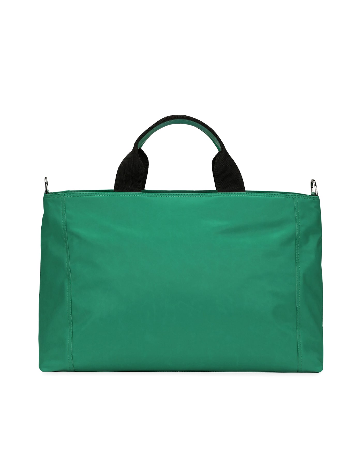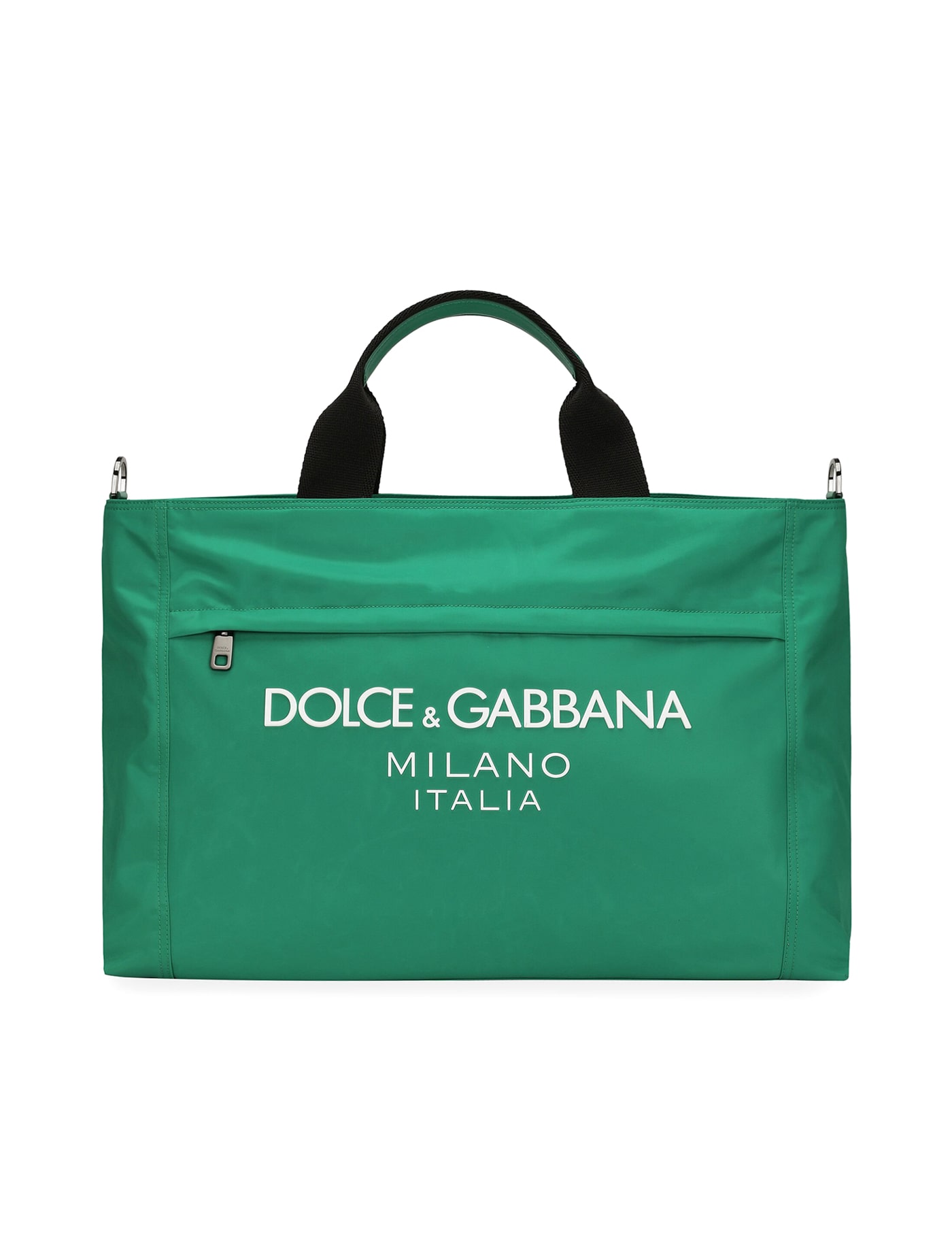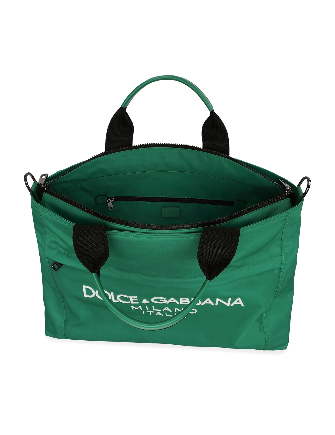 Nylon duffle bag by Dolce & Gabbana featuring contrasting rubberized logo on front and leather details. Double-slider branded zipper closure, nylon-lined interior with one zippered pocket and two patch pockets. Fabric double top handle with leather reinforcement, adjustable and removable fabric shoulder strap. Silver-finished metalware.