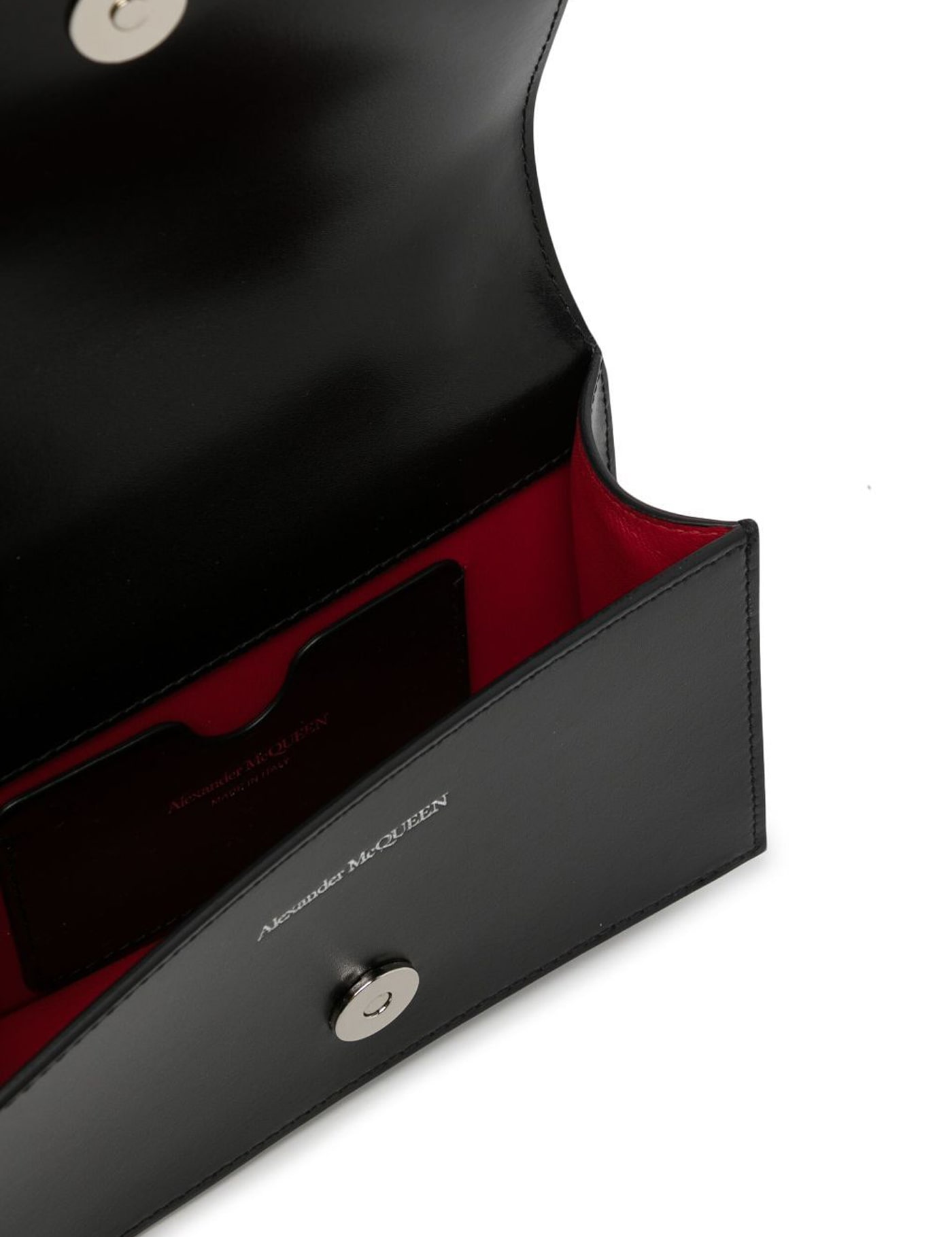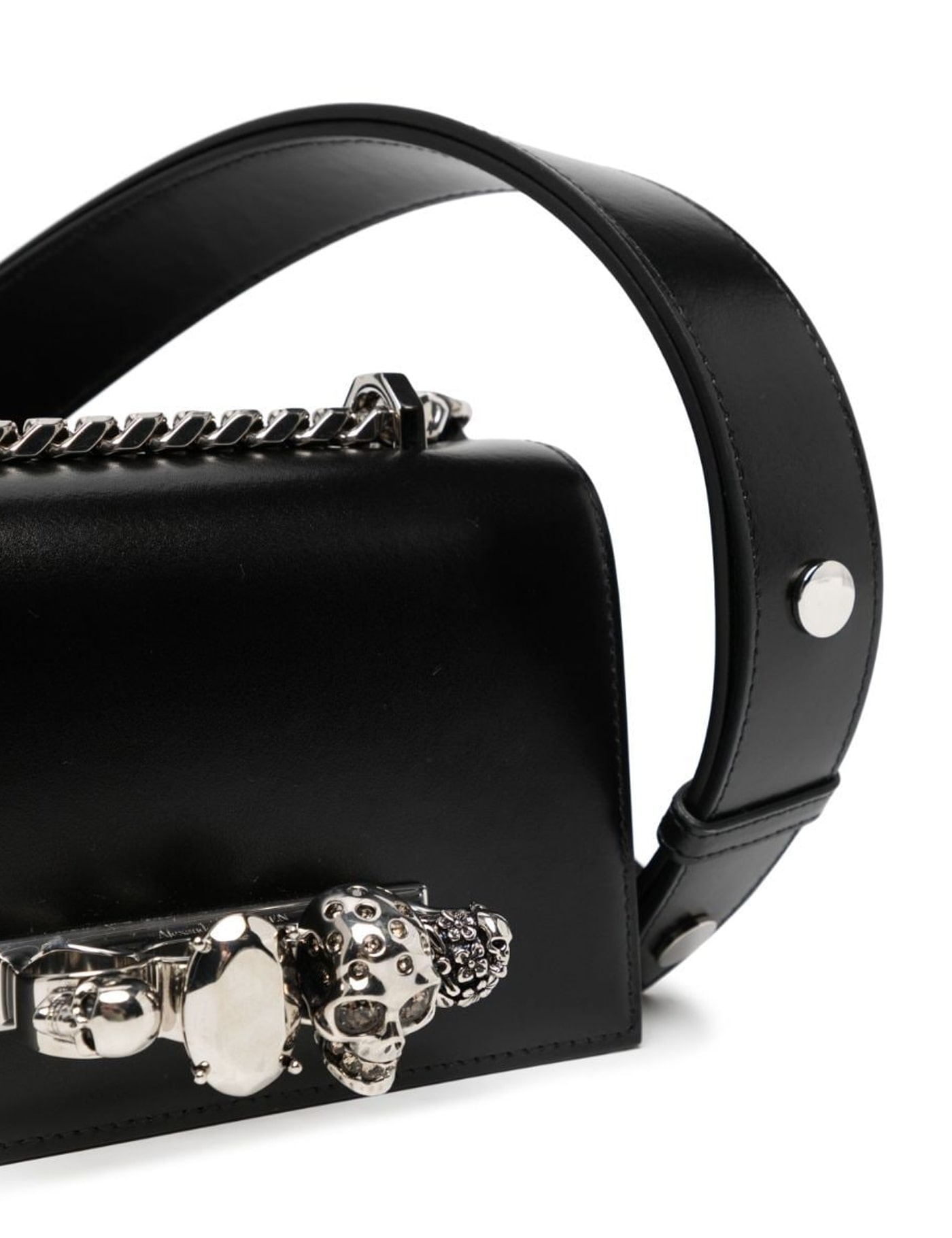 Leather mini 'Jewelled Satchel' bag by Alexander McQueen with four-ring jeweled handle, decorated with the iconic Skull and Swarovski crystals, at front. Adjustable leather strap, flap with magnetic button, silver-printed logo, contrasting leather interior, credit card slot. Silver-tone metal hardware.