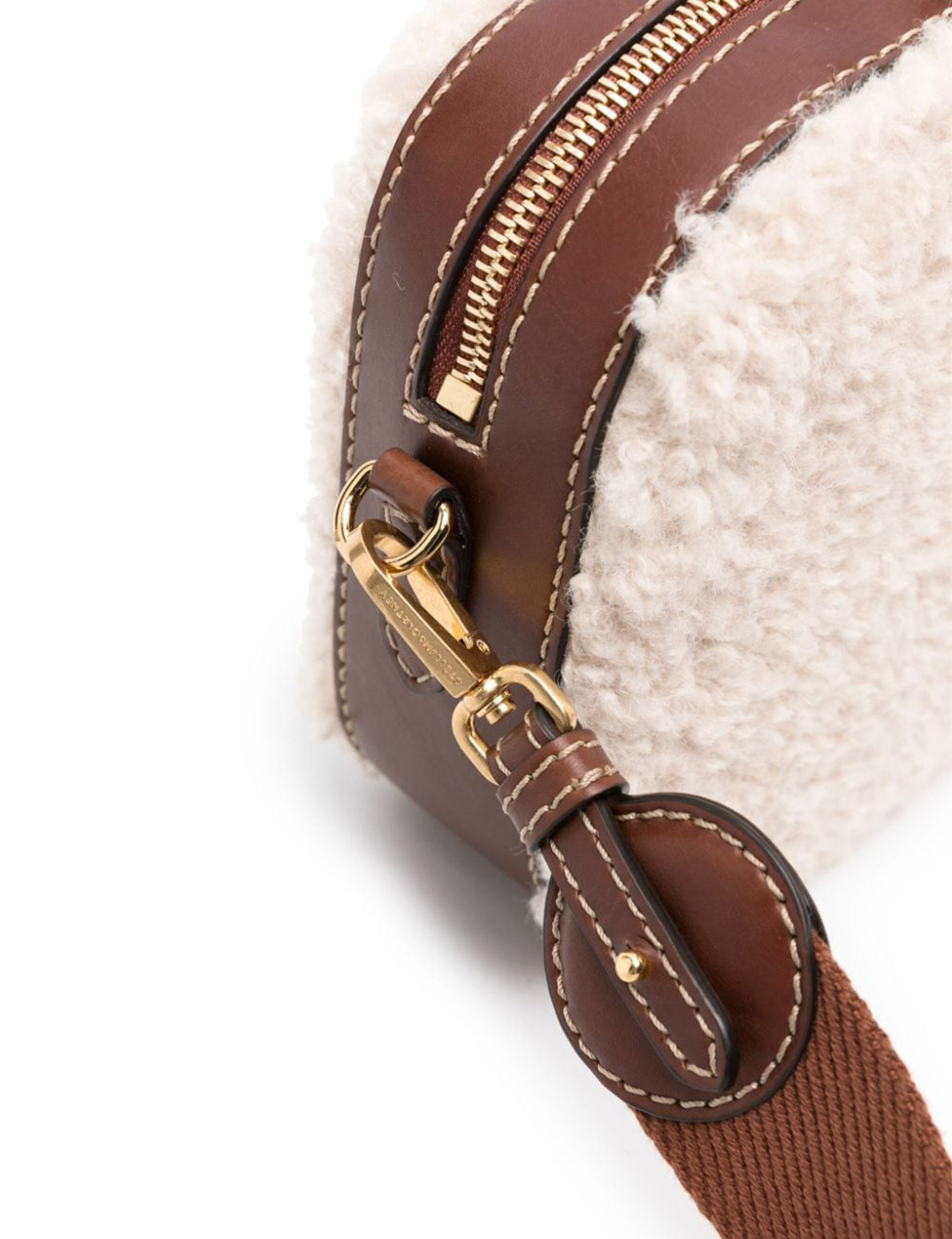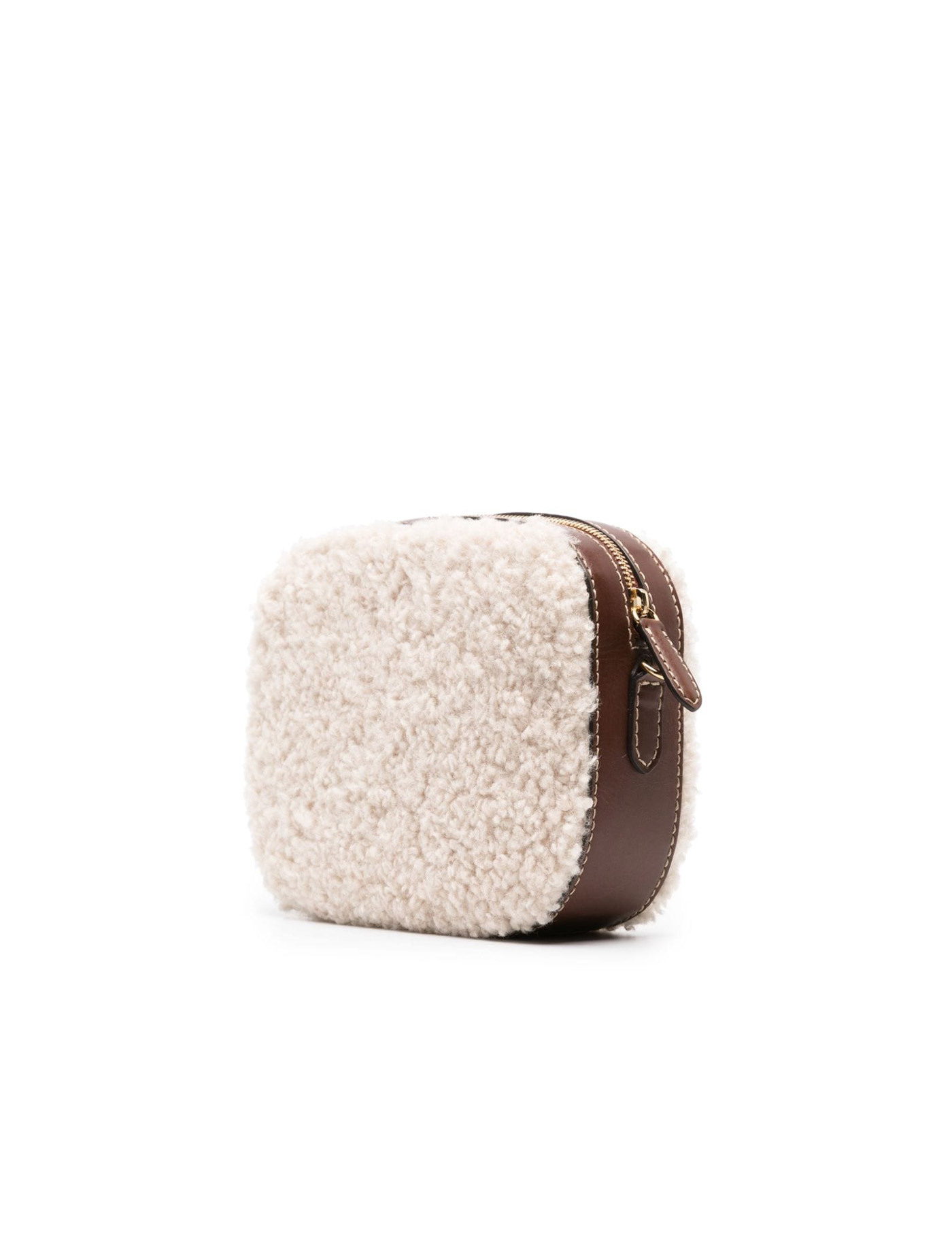 Stella McCartney camera bag in faux shearling with fauc leather logo patch. It features an adjustable and removable webbing strap with logo lettering in gold micro studs, zip closure, faux suede leather lining, one inner slip pocket. Gold-tone metalware.