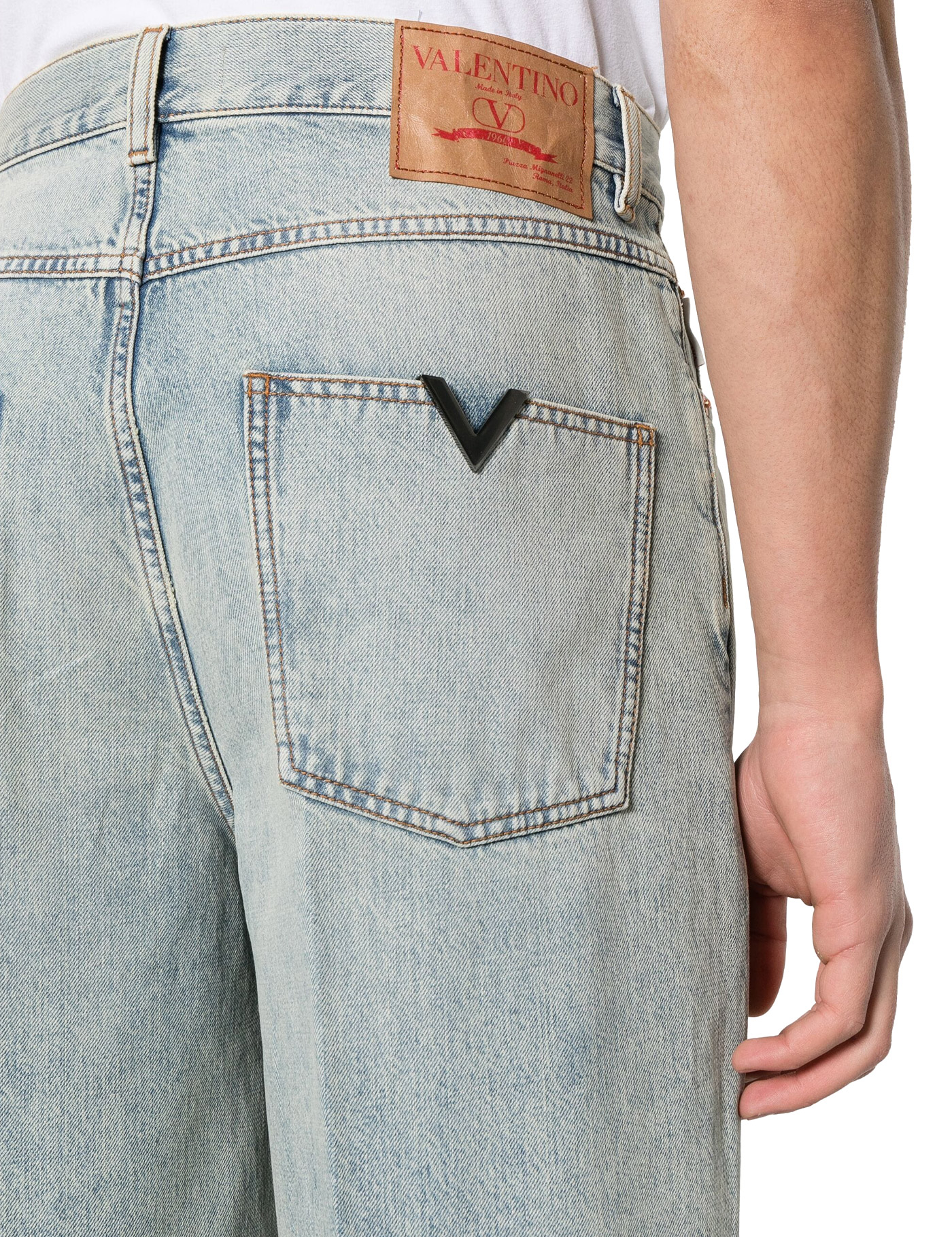 Valentino five-pocket jeans in vintage light wash denim with a metal V detail on the back pocket. Cut to an oversized fit with straight leg, they are finished with belt loops and button fly. The model is 187 cm tall and wears a size 31.