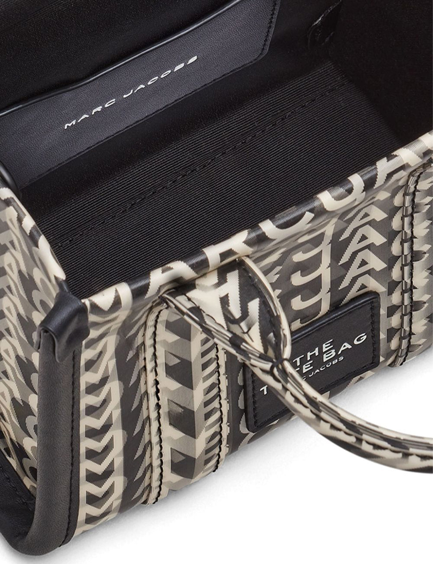 The Mini Tote Bag by Marc Jacobs with lenticular-effect monogram and leather applique logo patch. Double handles, detachable and adjustable shoulder strap, side handle and zipper closure. Fabric interior with one card slot and tone-on-tone metalware.