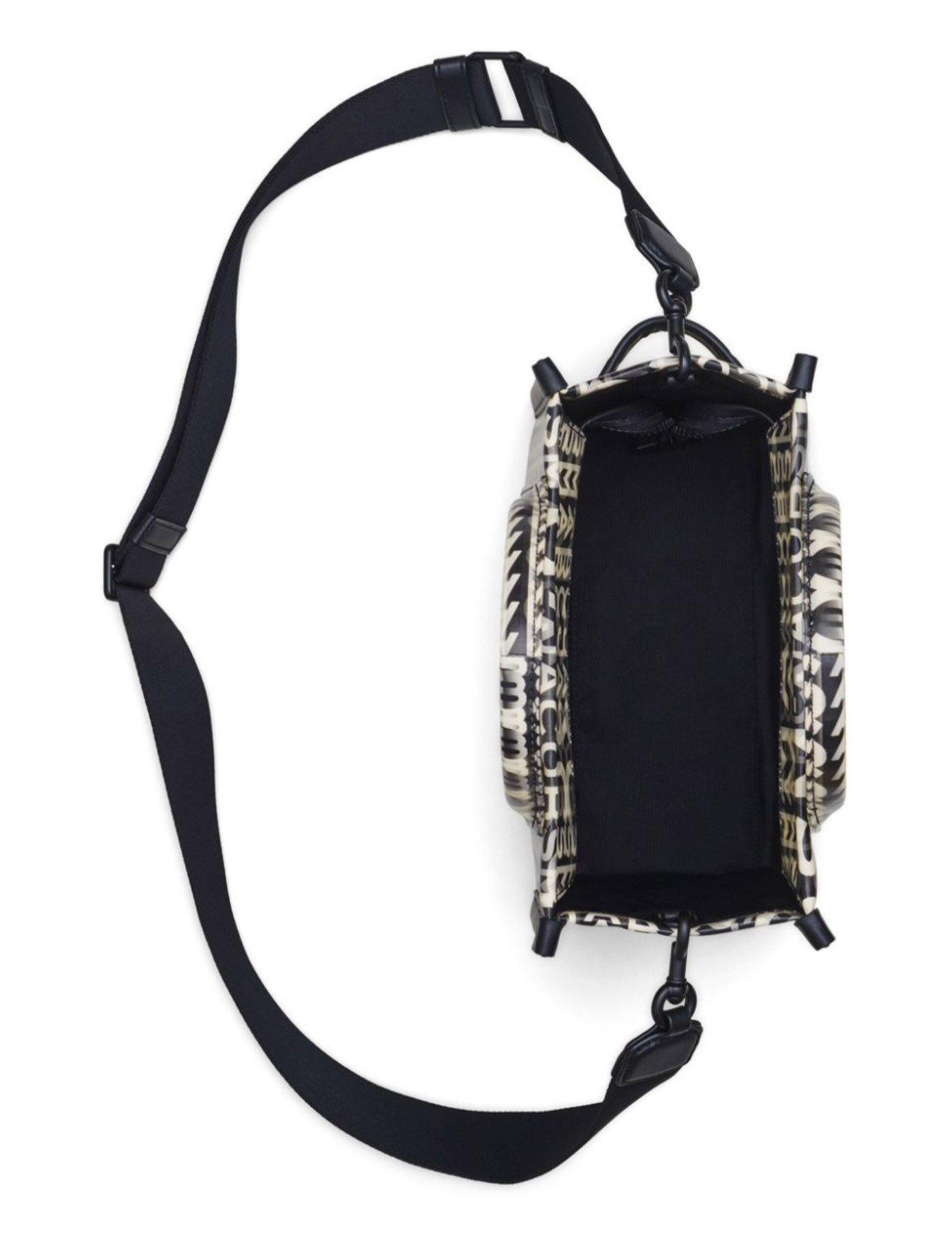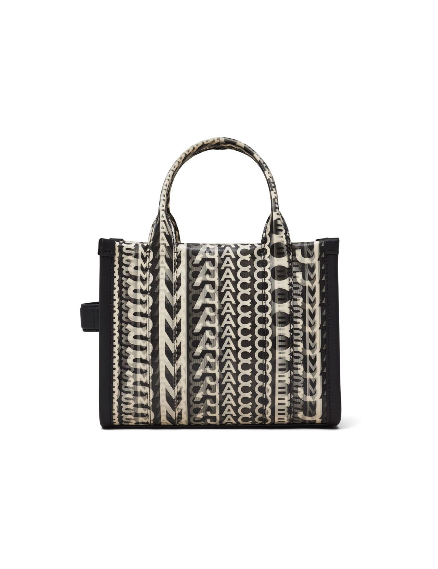 The Mini Tote Bag by Marc Jacobs with lenticular-effect monogram and leather applique logo patch. Double handles, detachable and adjustable shoulder strap, side handle and zipper closure. Fabric interior with one card slot and tone-on-tone metalware.