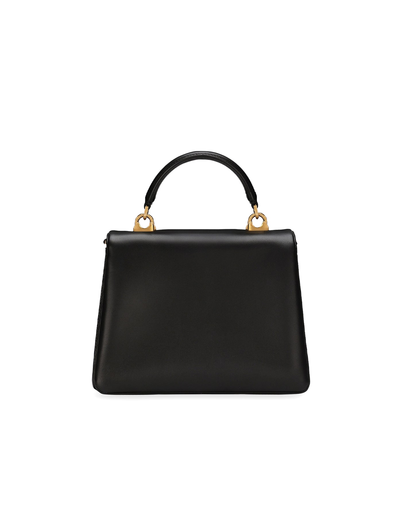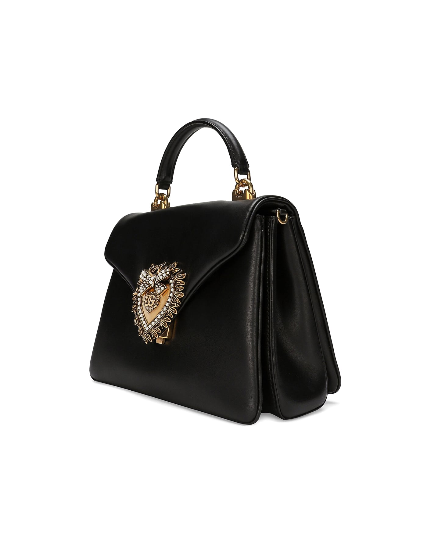 Devotion handbag made of plongé nappa leather with iconic heart appliqué on the flap. Interlocking closure, interior with three gusseted compartments, one zipper pocket and one credit card slot, and adjustable, detachable shoulder strap. Gold-finished metalware.