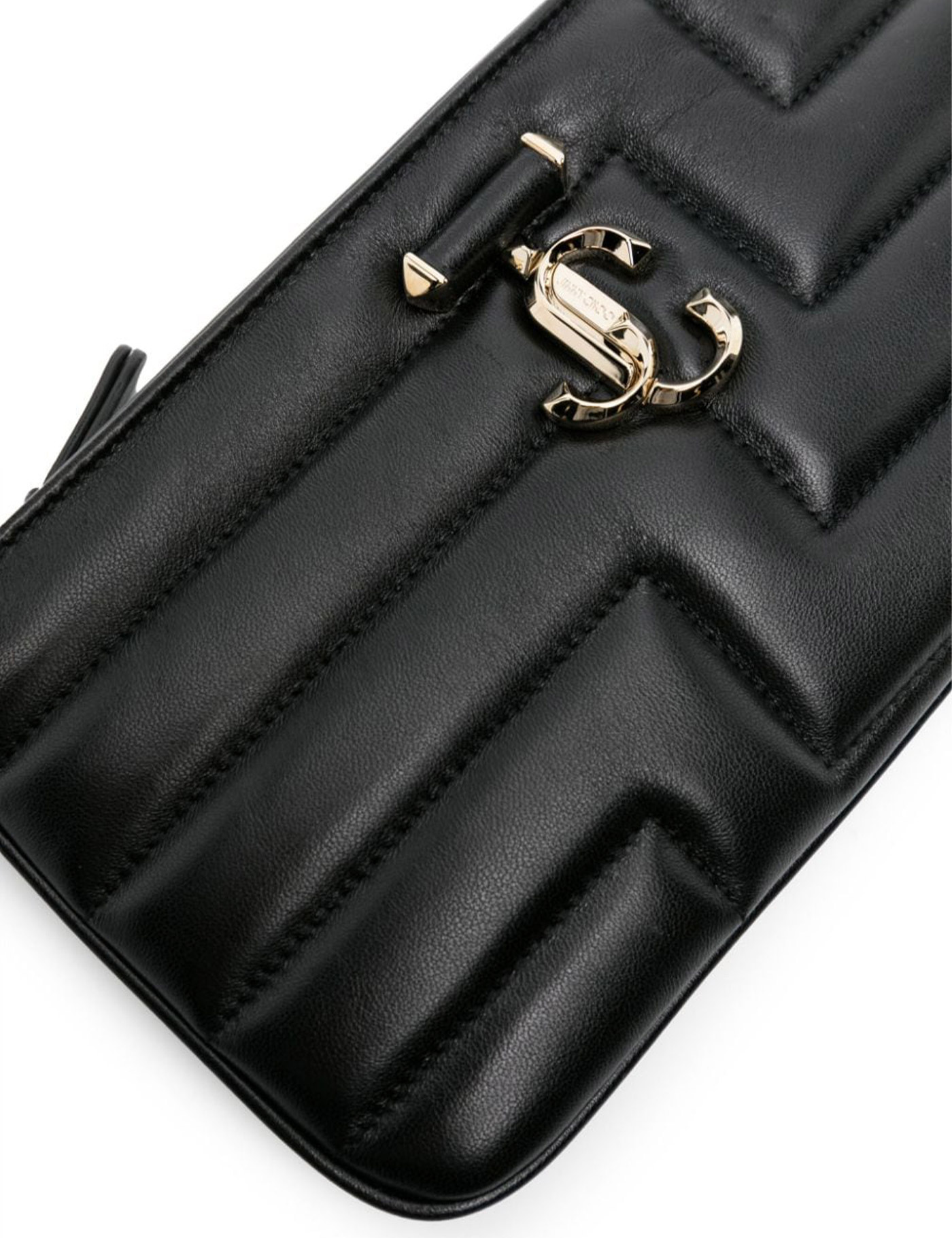 Jimmy Choo shoulder bag crafted in quilted leather and gold metal monogram. Zipper closure, satin interior with one open pocket and chain handle with leather insert. Gold-finished metalware.