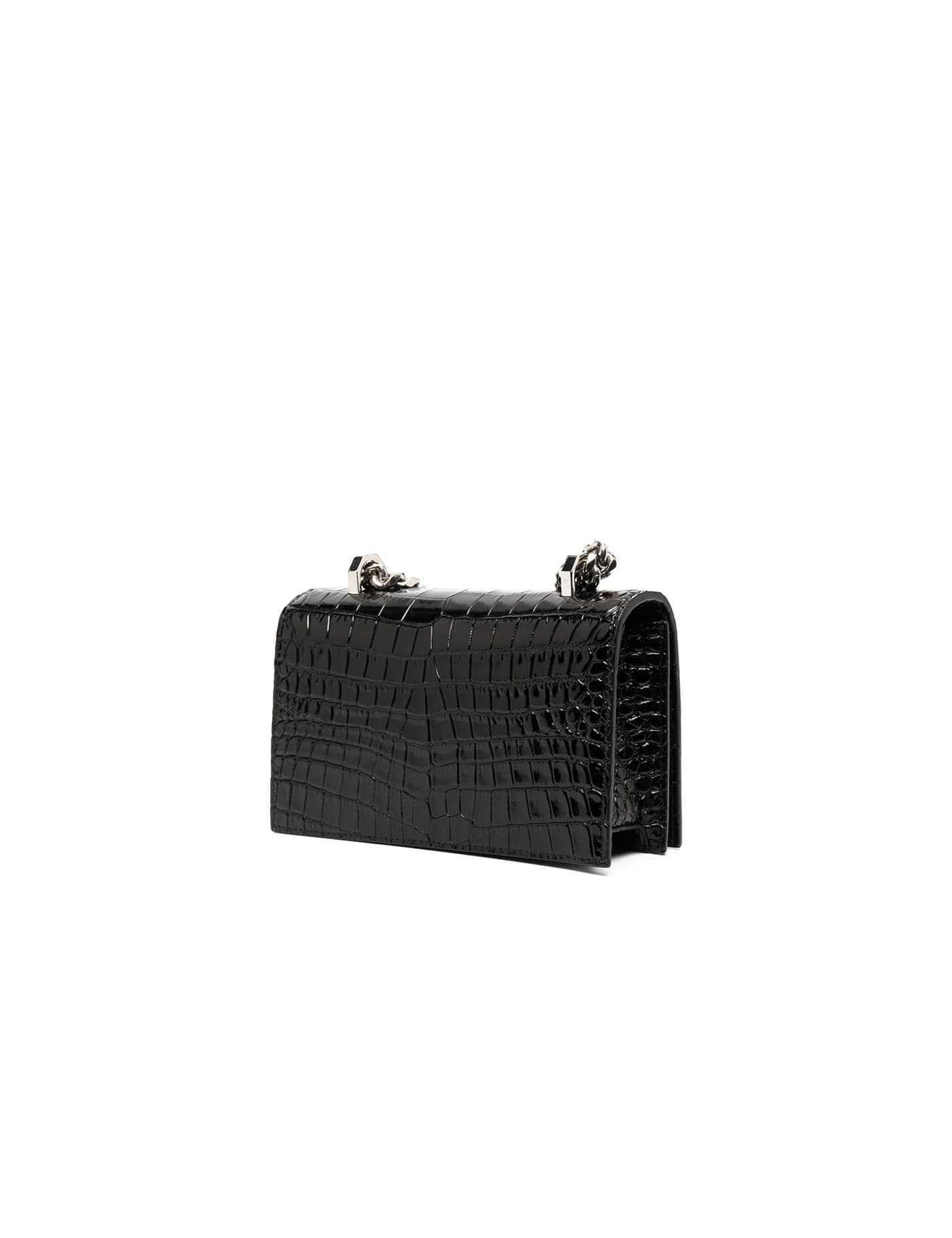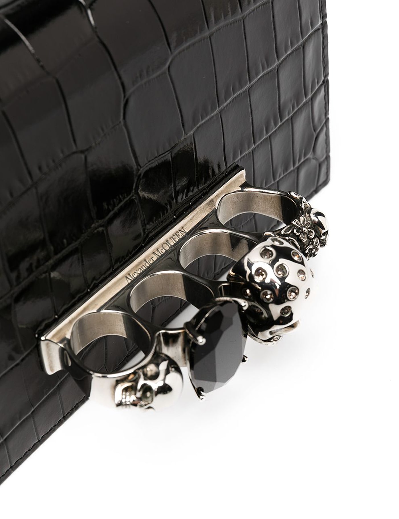 Jewelled Satchel mini bag by Alexander McQueen in croco-embossed leather, characterized by the front metal four ring handle with engraved logo, embedded crystals and embossed Skull. Sliding chain shoulder strap with adjustable leather insert, convertible into a double handle. Flap with magnetic button closure, suede interior, one inner leather credit card pocket and silver-tone lettering logo print under the flap. Silver-finished metalware.