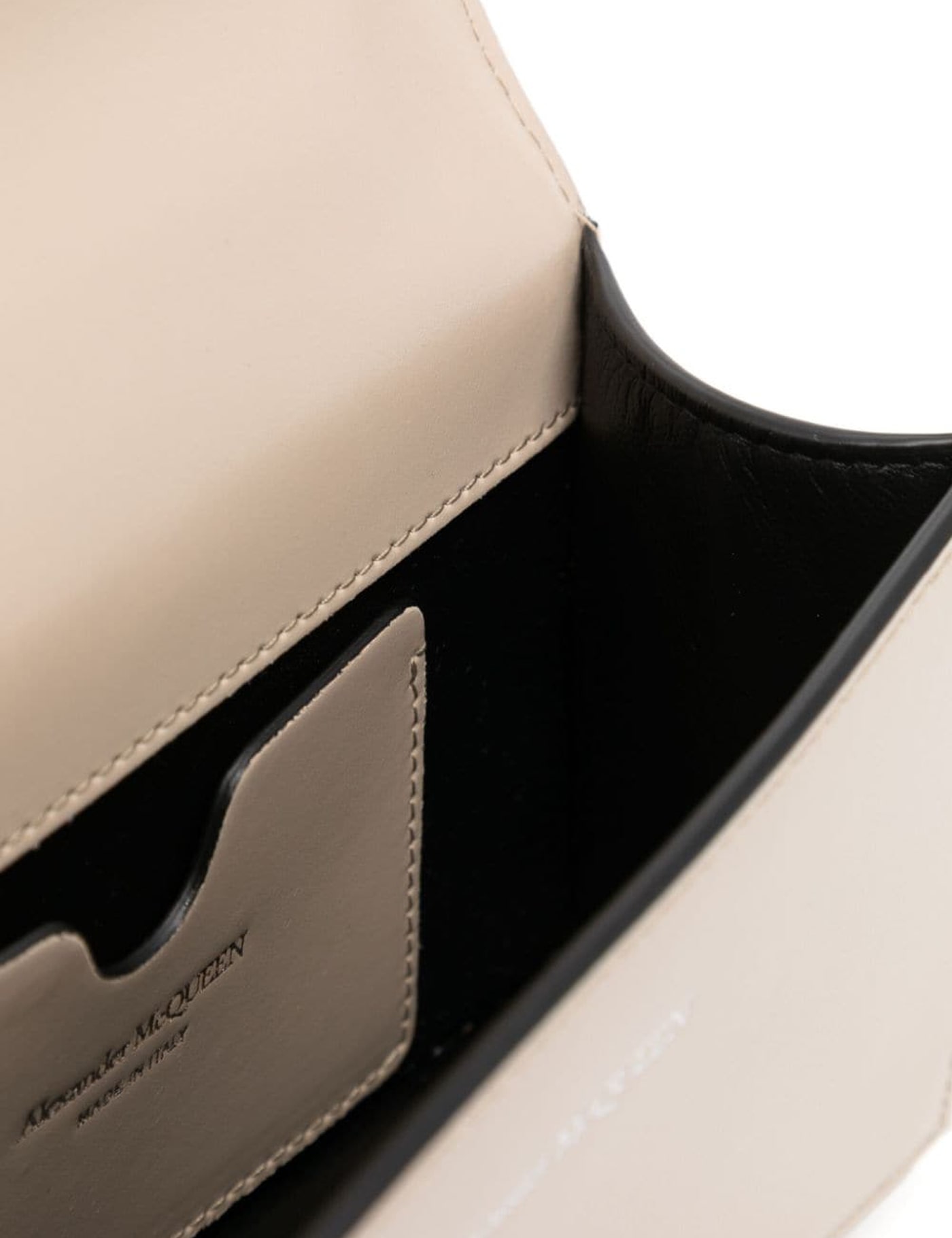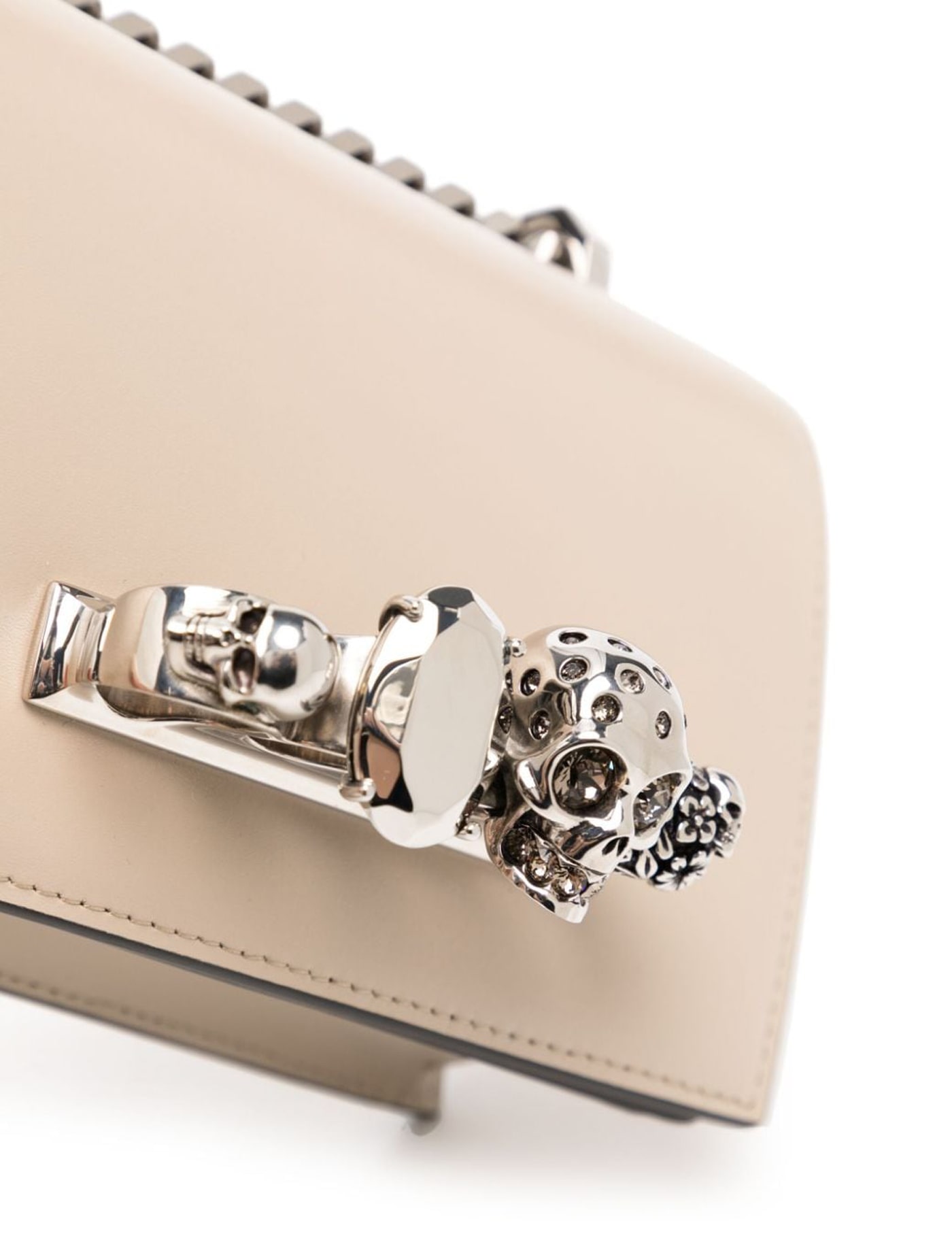 Leather mini 'Jewelled Satchel' bag by Alexander McQueen with four-ring jeweled handle, decorated with the iconic Skull and Swarovski crystals, at front. Adjustable leather strap, flap with magnetic button, silver-printed logo, contrasting leather interior, credit card slot. Silver-tone metal hardware.