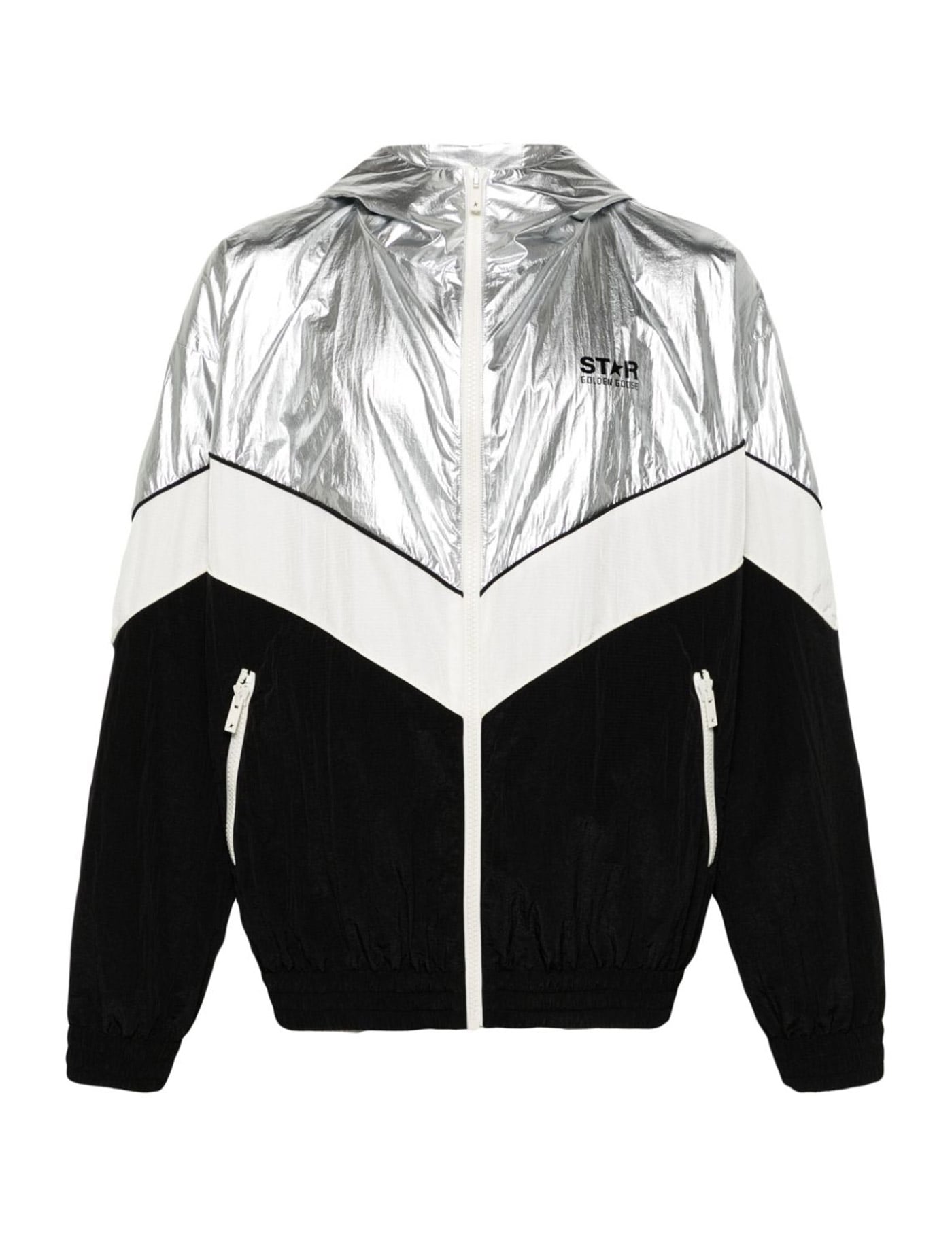 Hooded jacket from the Star collection by Golden Goose, crafted in nylon ripstop with a patchwork design finished with tonal piping. It features zipper closure and pockets, elasticated hem and cuffs. Branded with logo print on the chest, lined. Loose fit with dropped shoulders. The model is 187 cm tall and wears size IT 48.