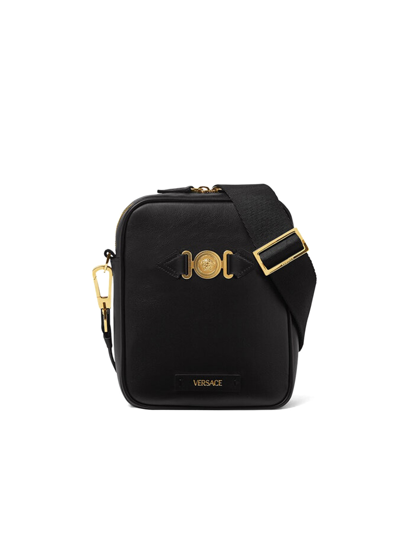 LEATHER MEDUSA SHOULDER BAG FROM VERSACE, ADJUSTABLE AND REMOVABLE WEBING SHOULDER STRAP, TOP TURN-AROUND CLOSURE WITH DOUBLE-SLIDER ZIPPER, GEOMETRIC DESIGN, ICONIC BRAND MONOGRAM PRINTED IN CONTRAST ON FRONT, ICONIC MEDUSA PLAQUE APPLIQUE ON FRONT.