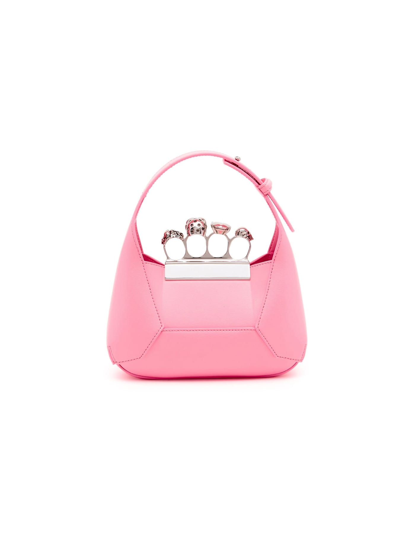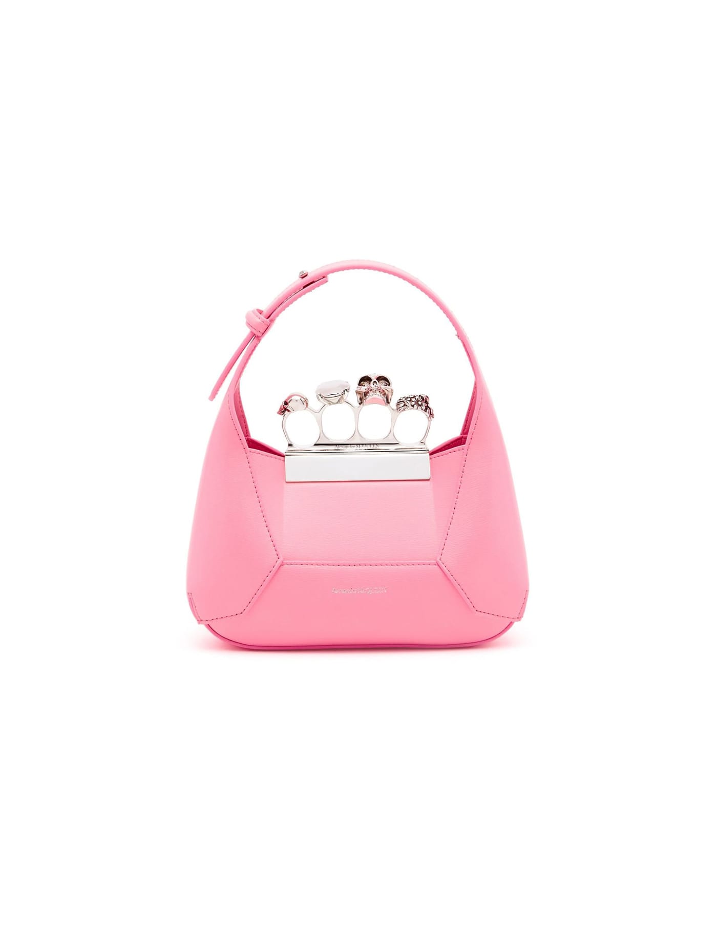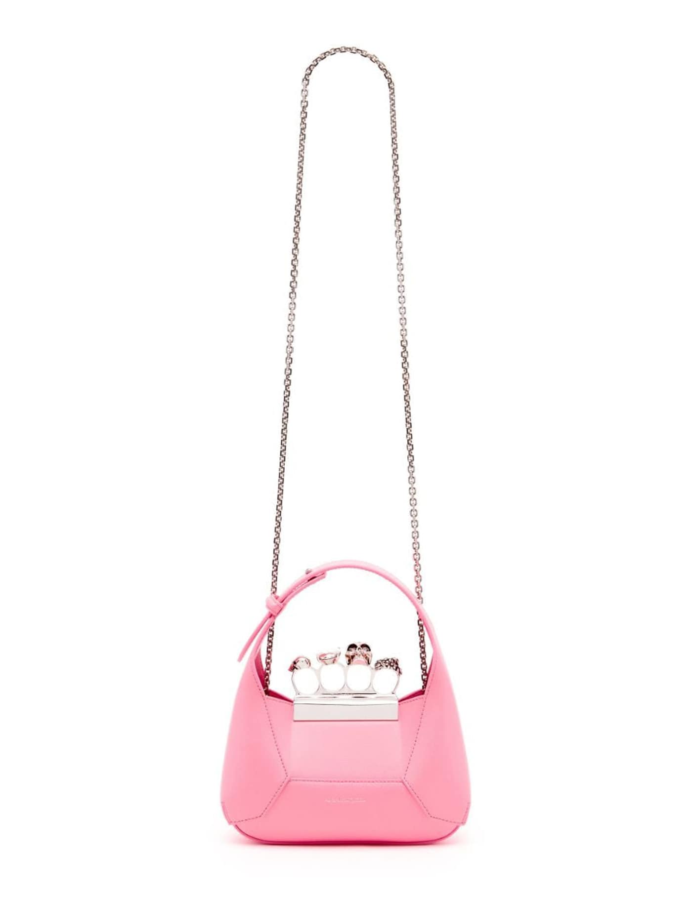 Jewelled Hobo mini bag from Alexander McQueen featuring flamingo pink, calf leather, multifaceted body, logo-engraved silver-tone hardware, Swarovski crystal embellishment, concealed magnetic fastening, signature Four Ring handle, adjustable shoulder strap, detachable chain-link shoulder strap and main compartment. DEPTH: 8.0 Centimetres