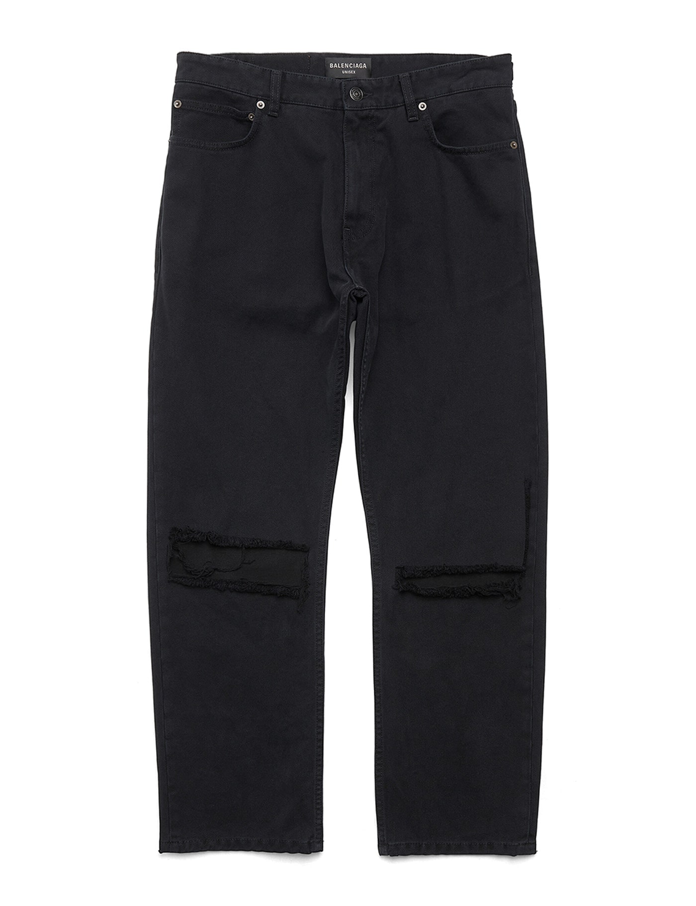 Black denim jeans from Balenciaga featuring regular fit, classic five pockets, belt loops, rips detail and button and zip closure.