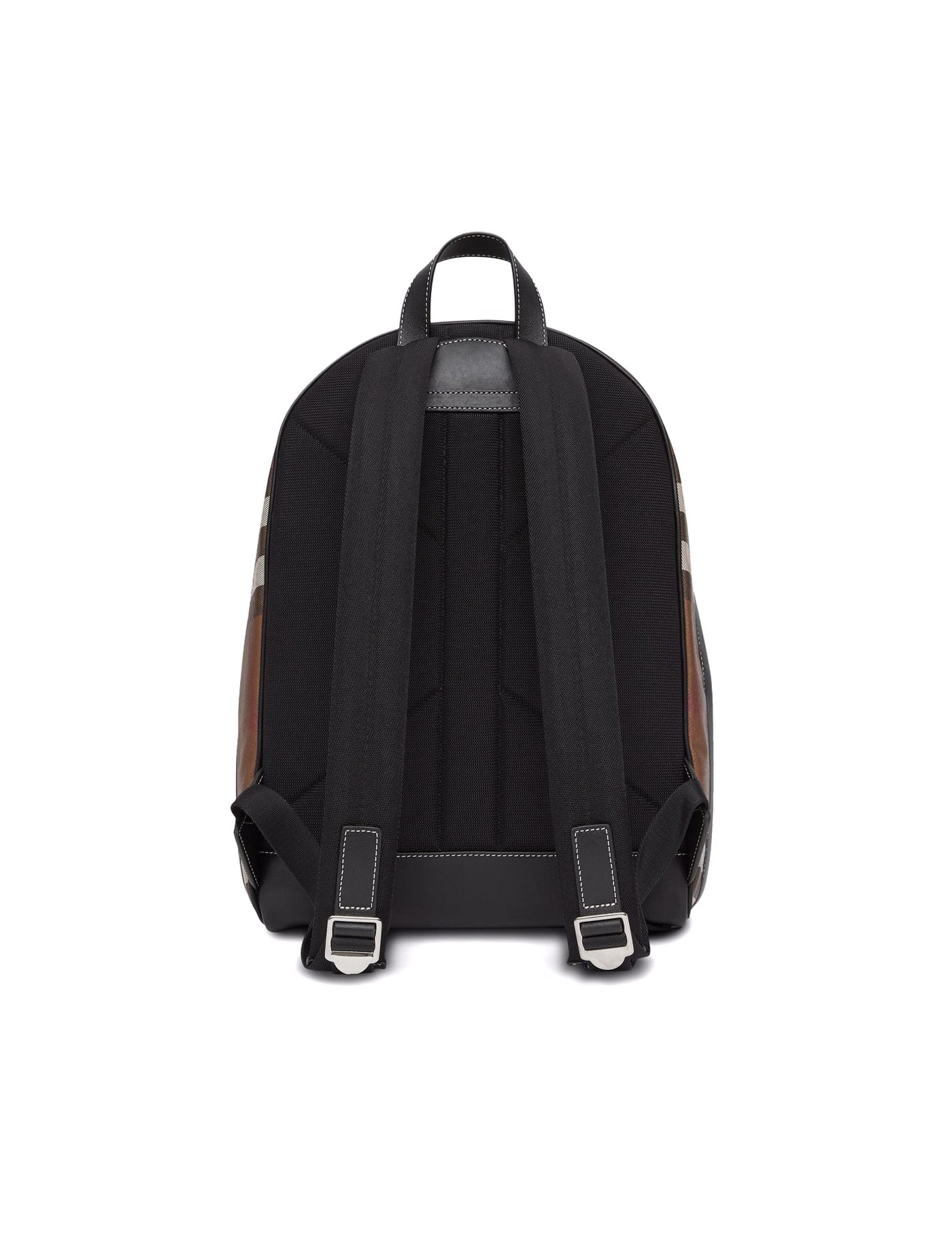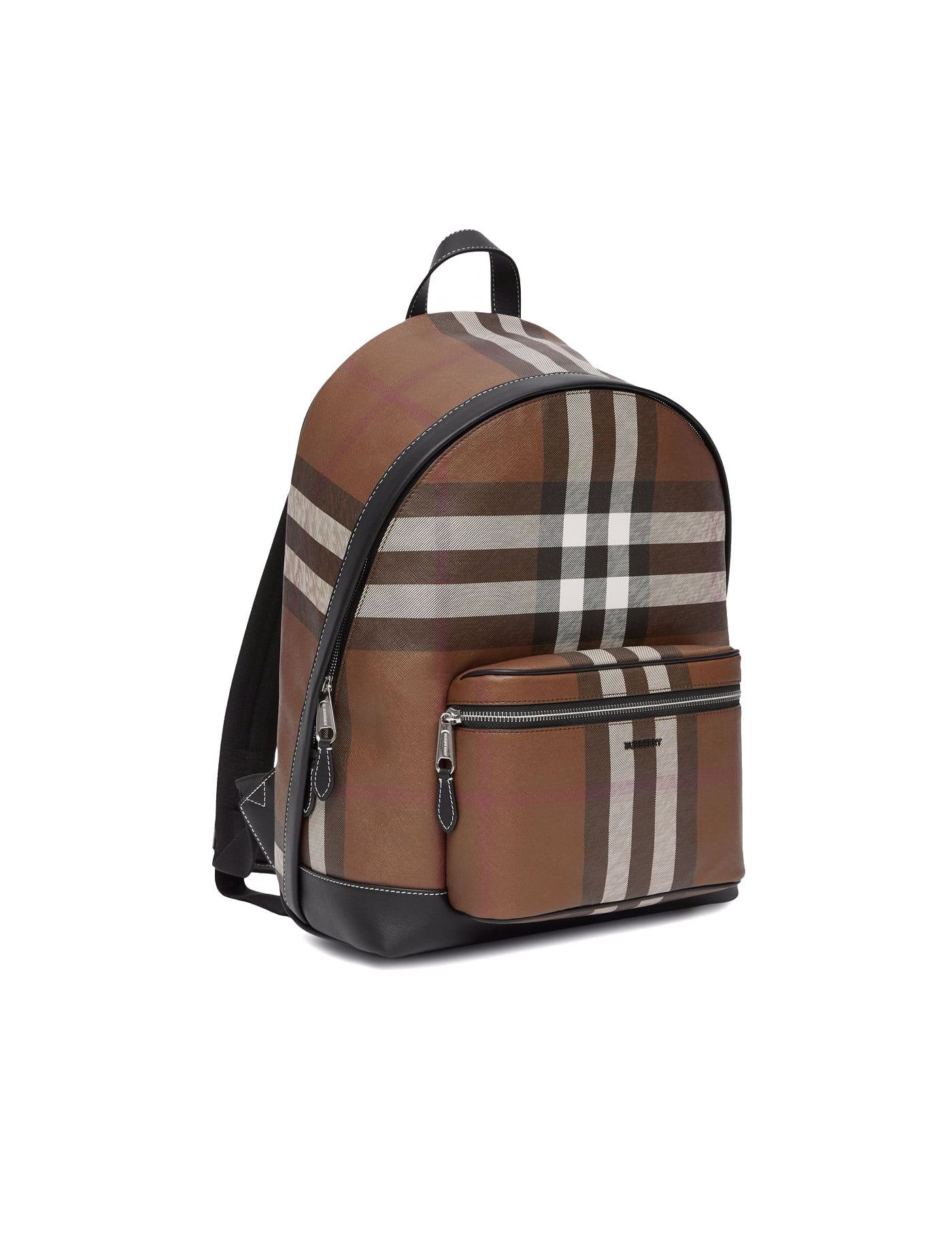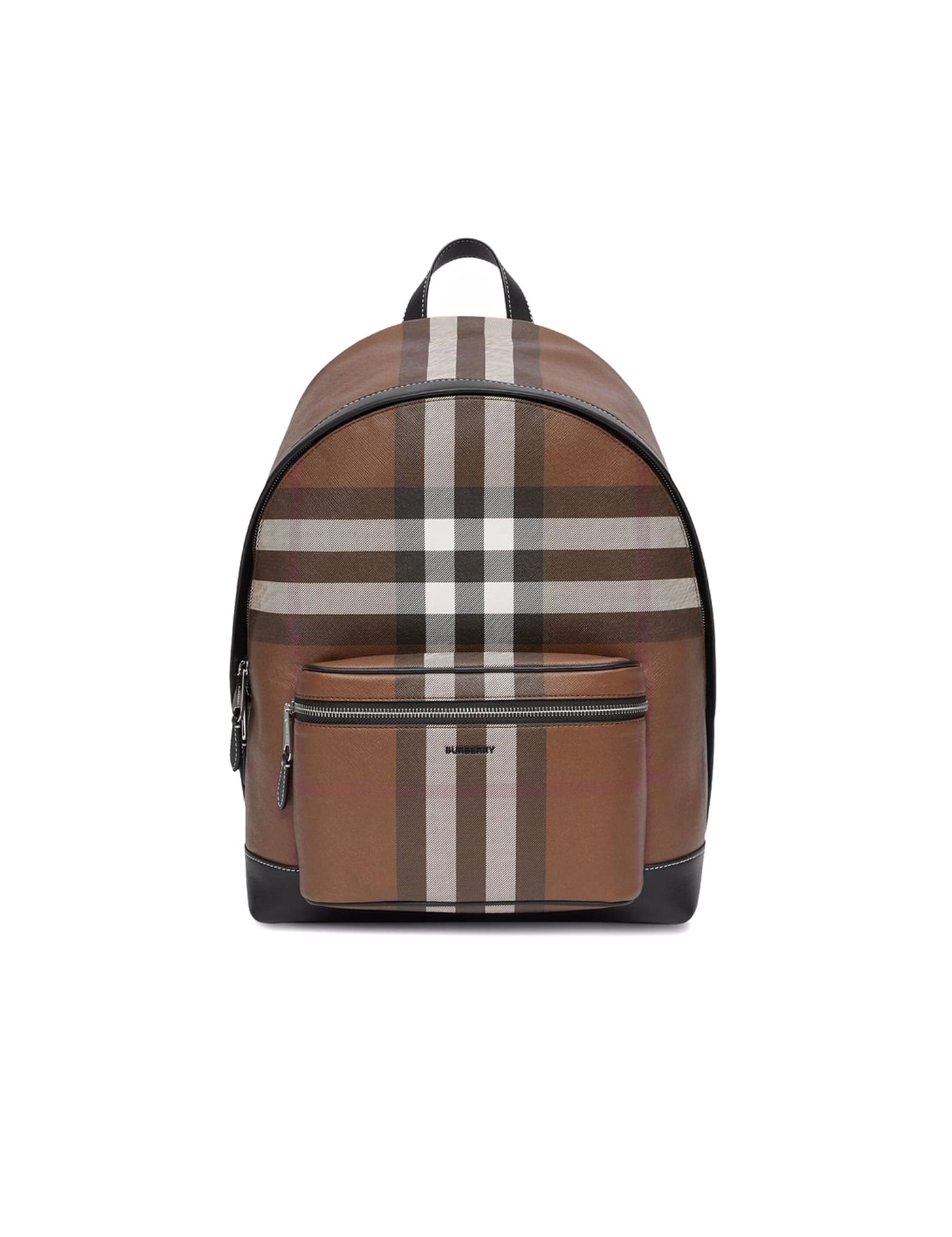 Dark birch brown check-print backpack from BURBERRY featuring leather trim, check print, logo lettering, single top handle, front zip-fastening pocket, adjustable shoulder straps, top zip fastening, main compartment, internal laptop pocket and internal zip-fastening pocket.