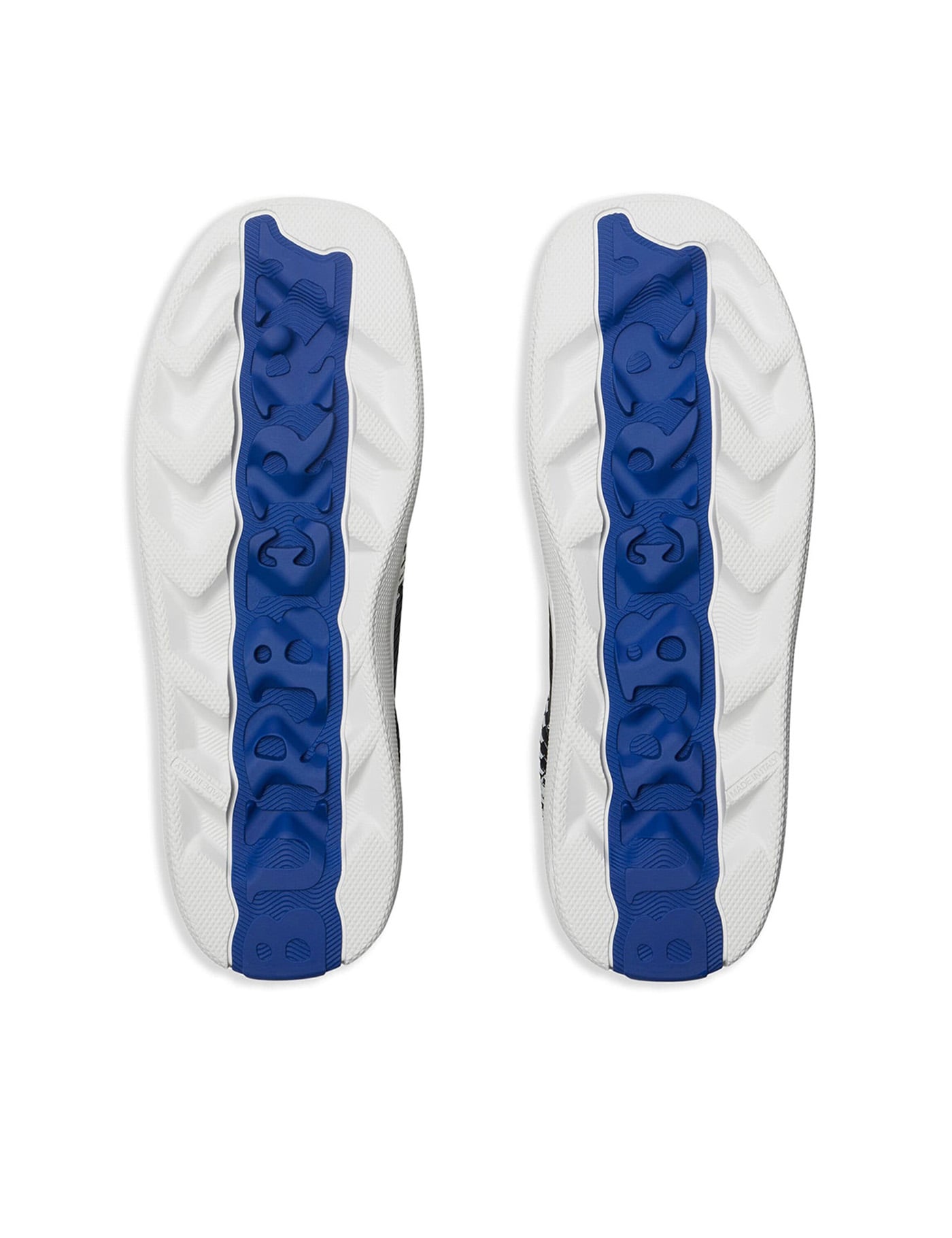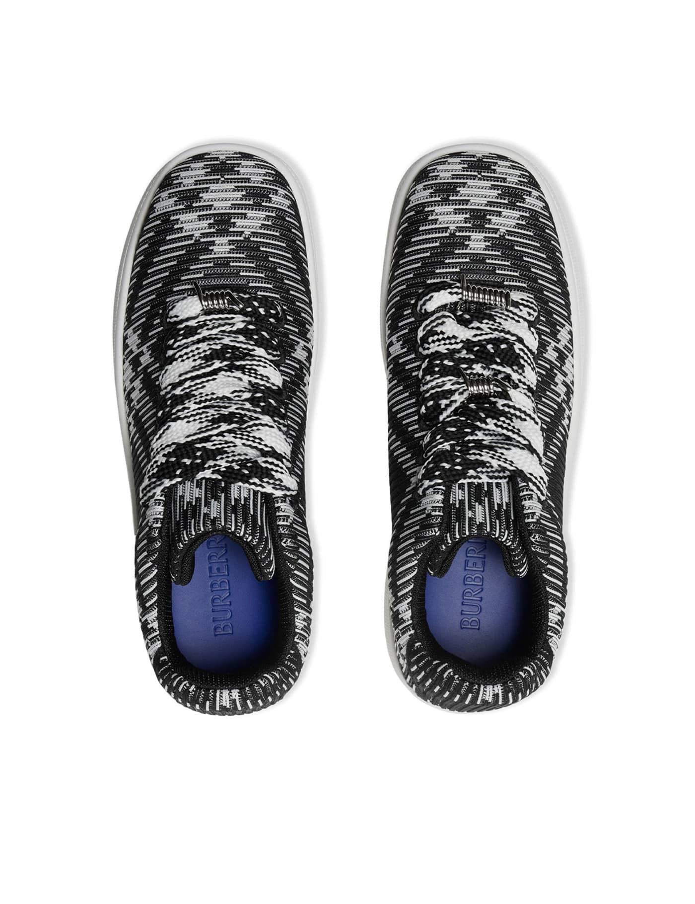 Burberry’s ribbed knit sneakers featuring a check motif in shades of black and white, rounded toe, front laces with silver-tone metal details and rubber sole.