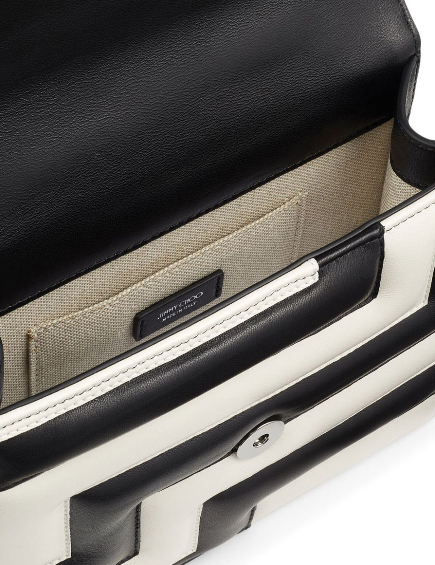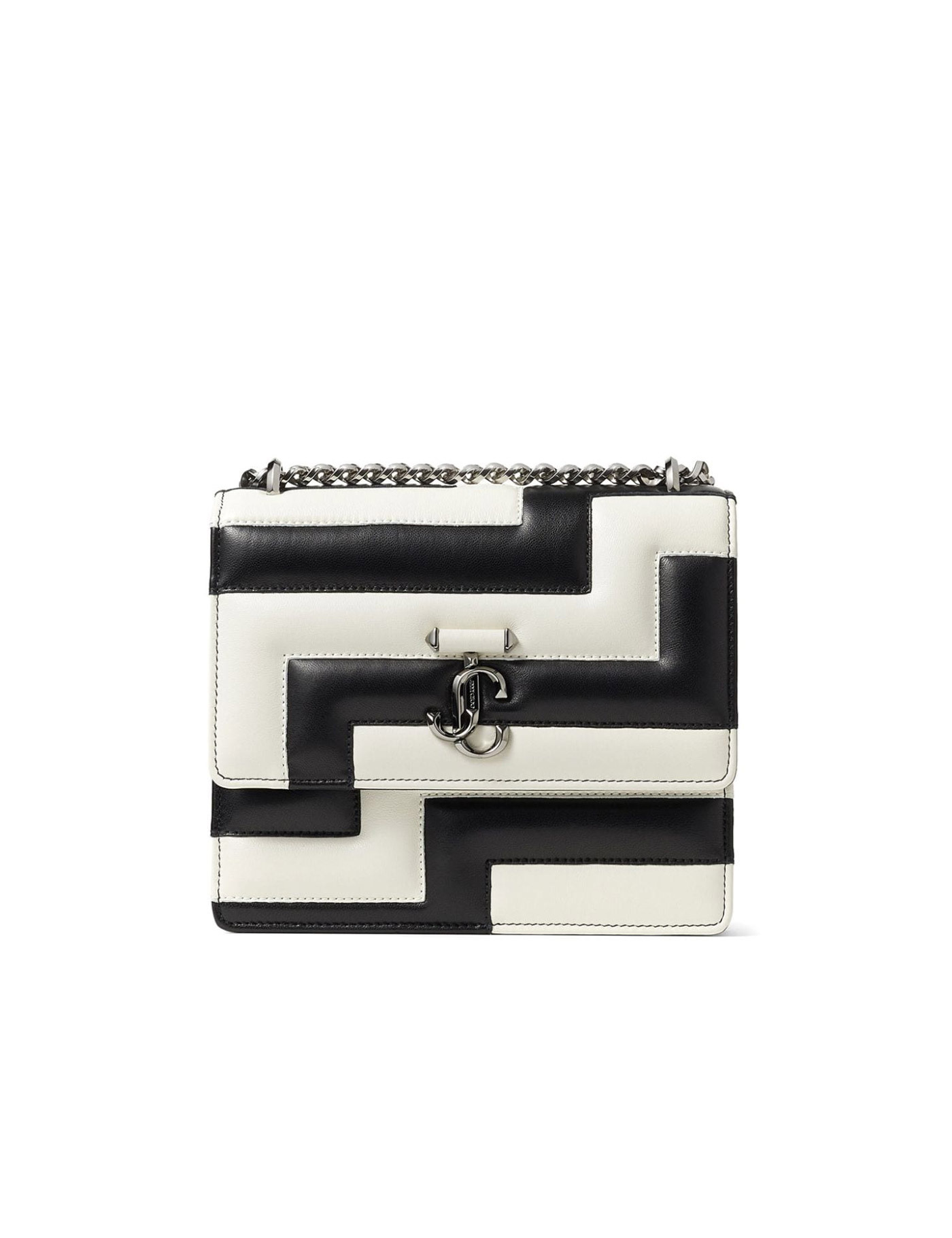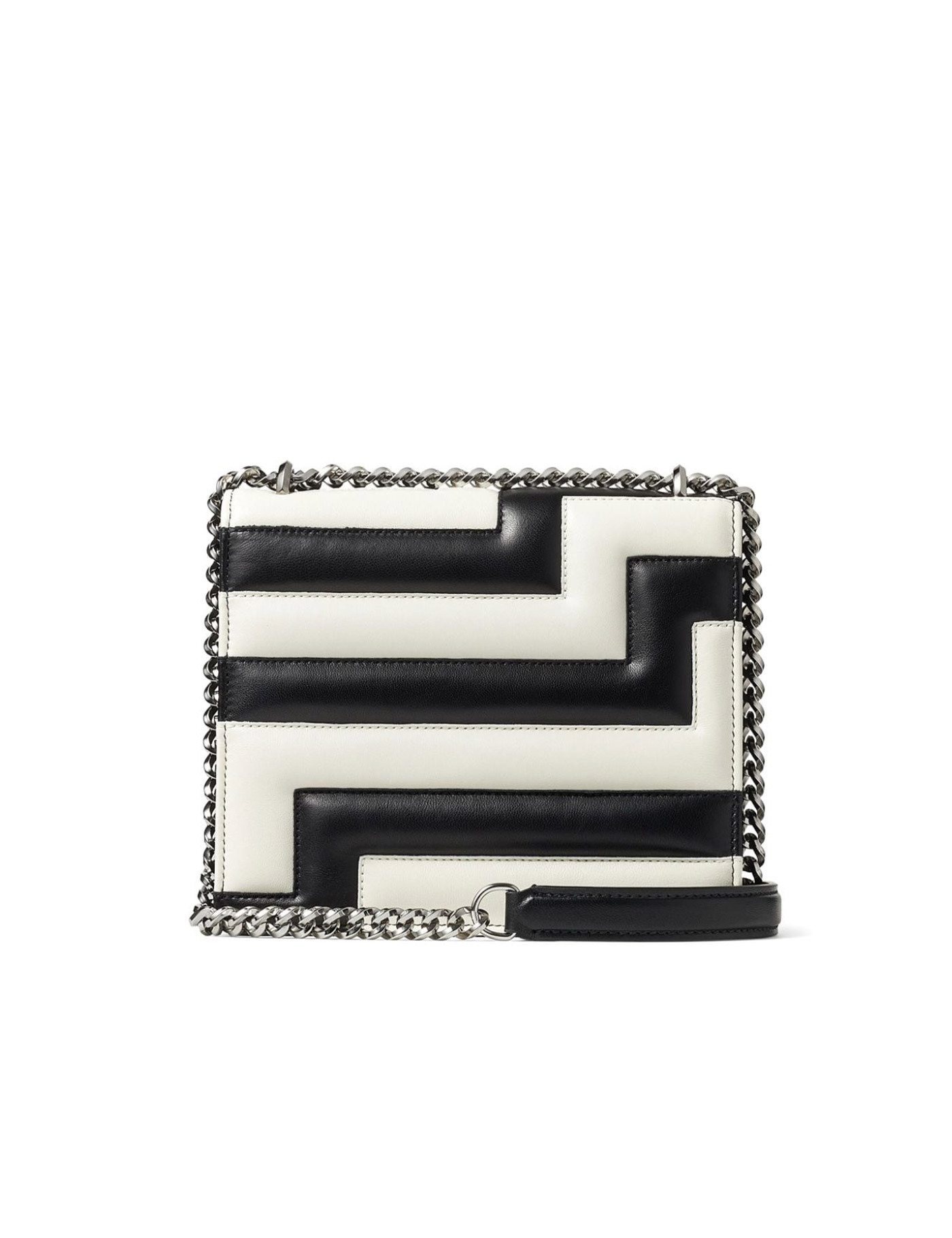 Black and white leather shoulder bag with quilted effect. Chain shoulder strap. Interior flat pocket. Flap closure with button. JC metal logo on front. Width:20 Height:19 Depth:5.5