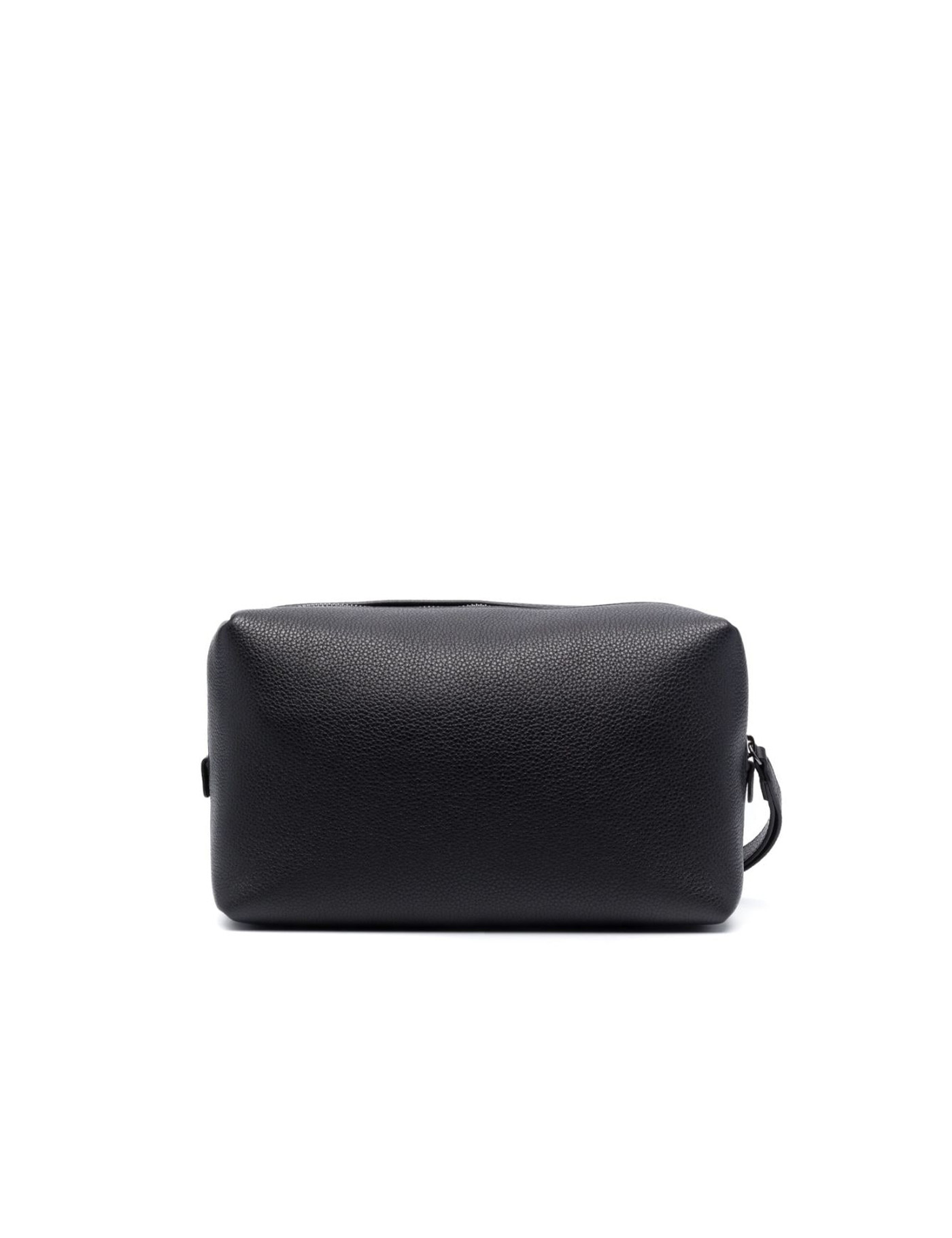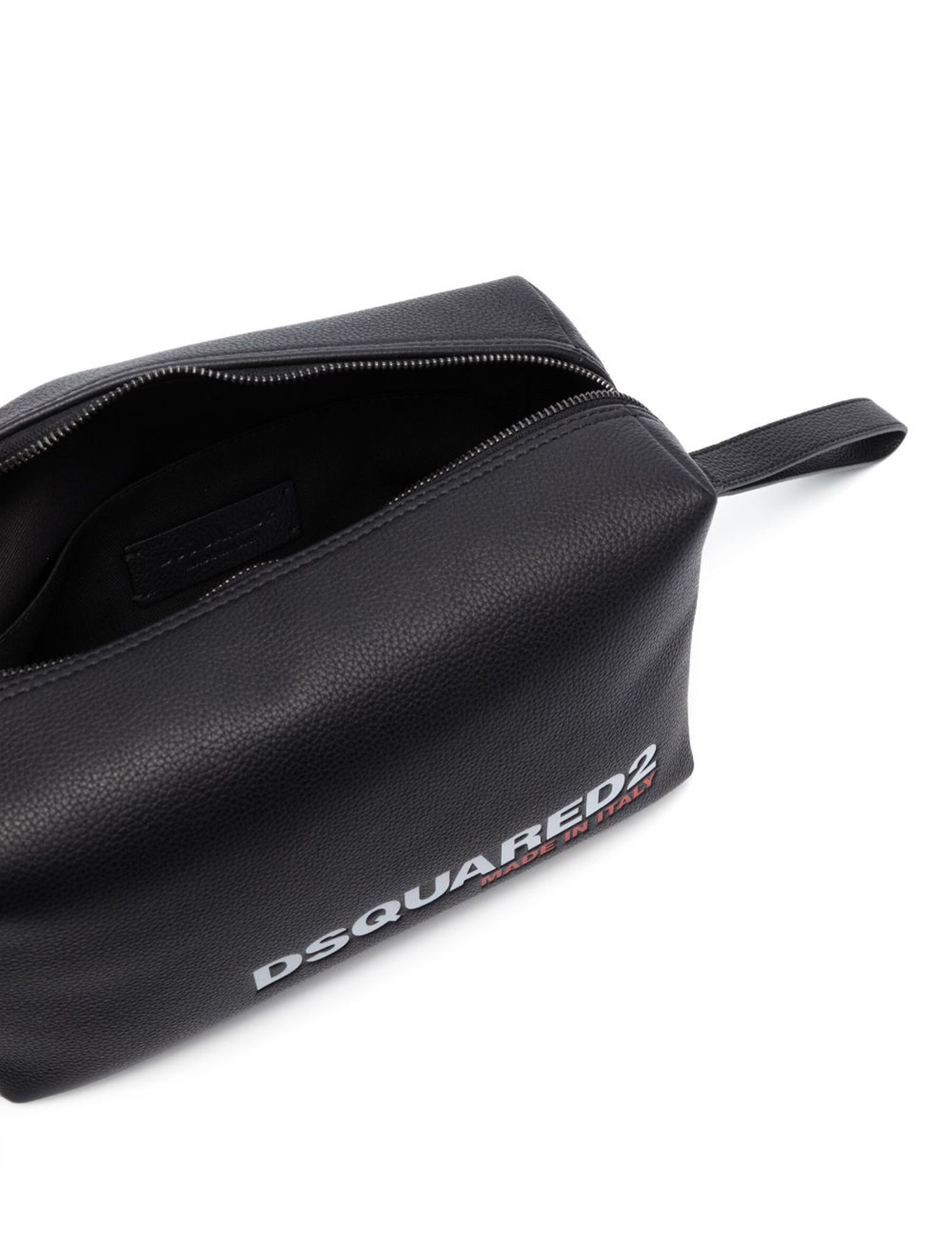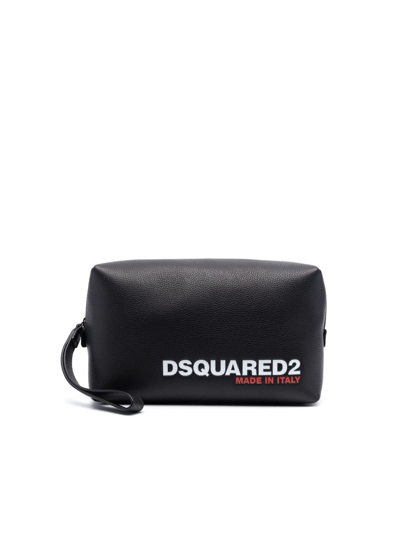 Leather beauty case by Dsquared2. Top zip fastening. Logo print to the front. Wrist strap