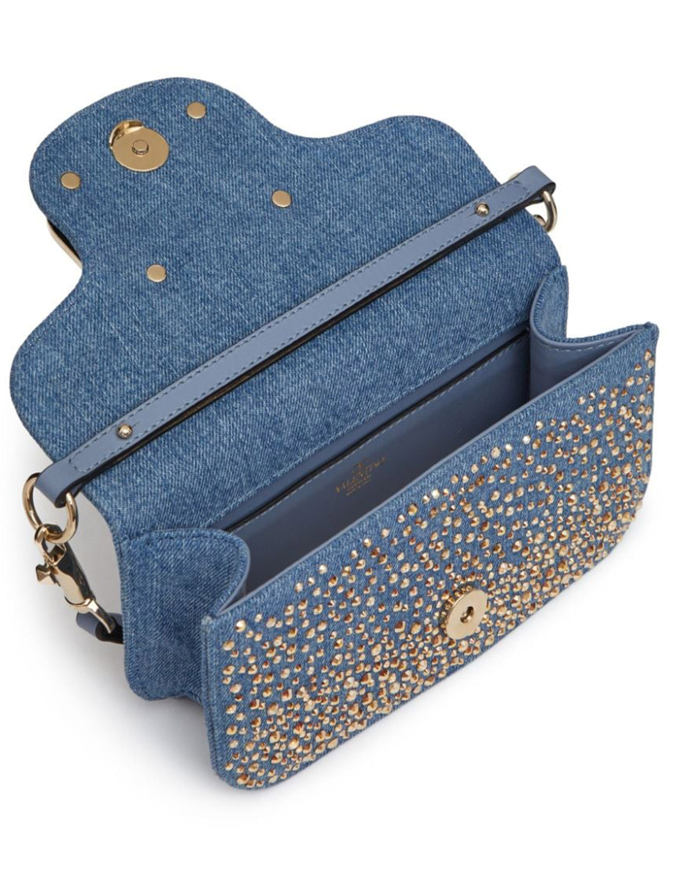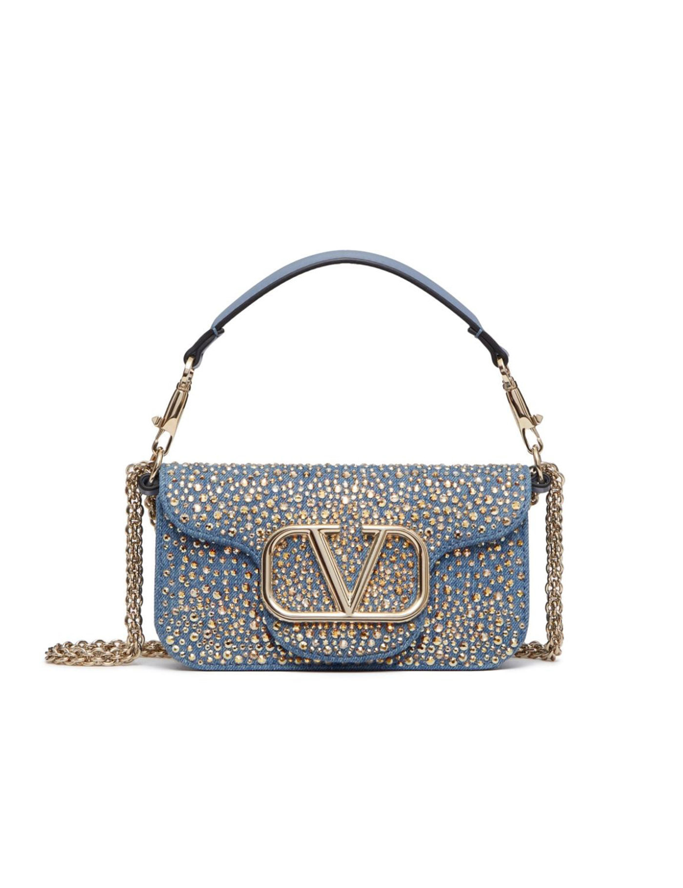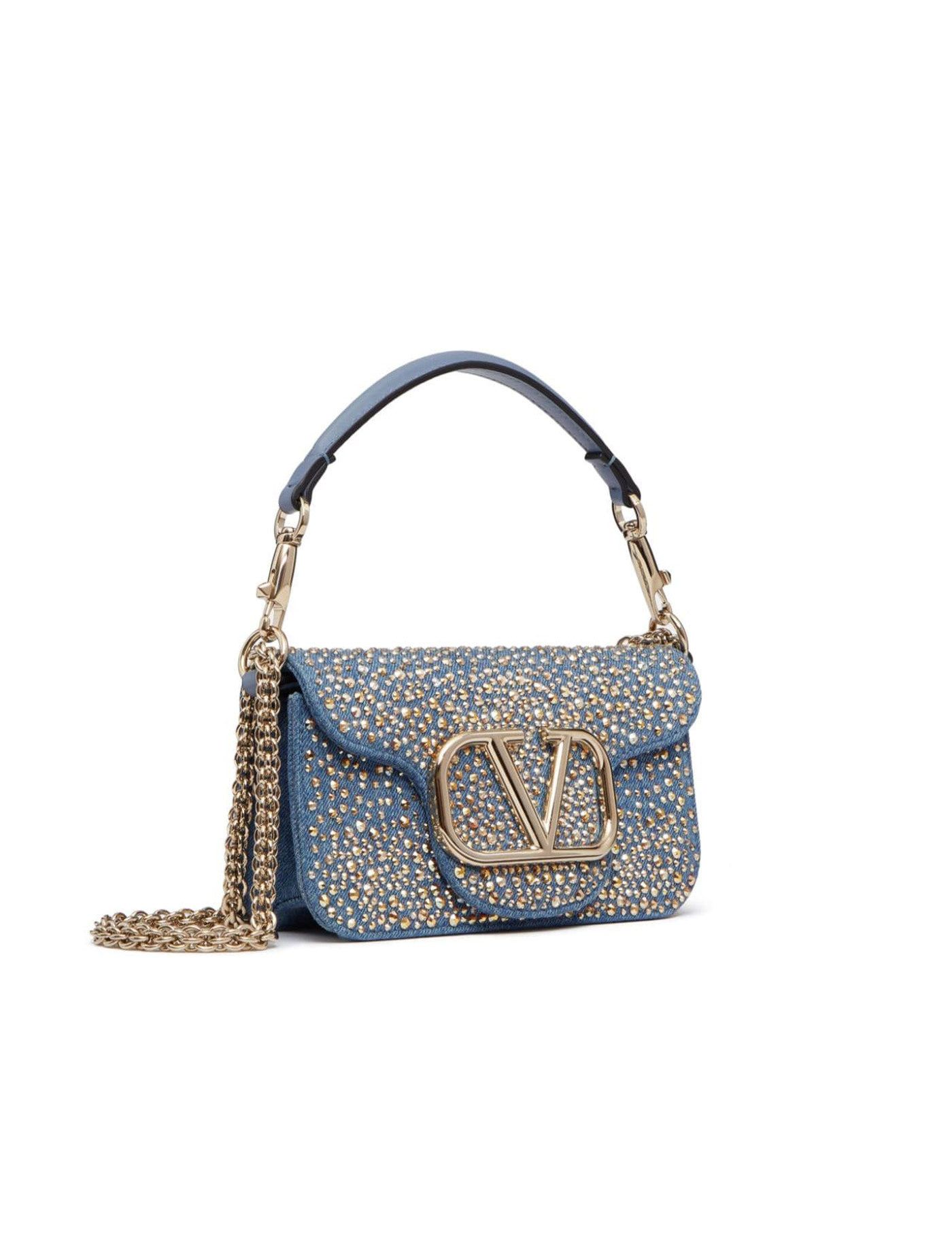 The Locò handbag by Valentino Garavani is made of cotton denim with all-over applied rhinestones and a metal Vlogo on the flap. It features a magnetic closure, leather interior with an open pocket, and removable chain handle and shoulder strap. The metallic accessories have a palladium finish.