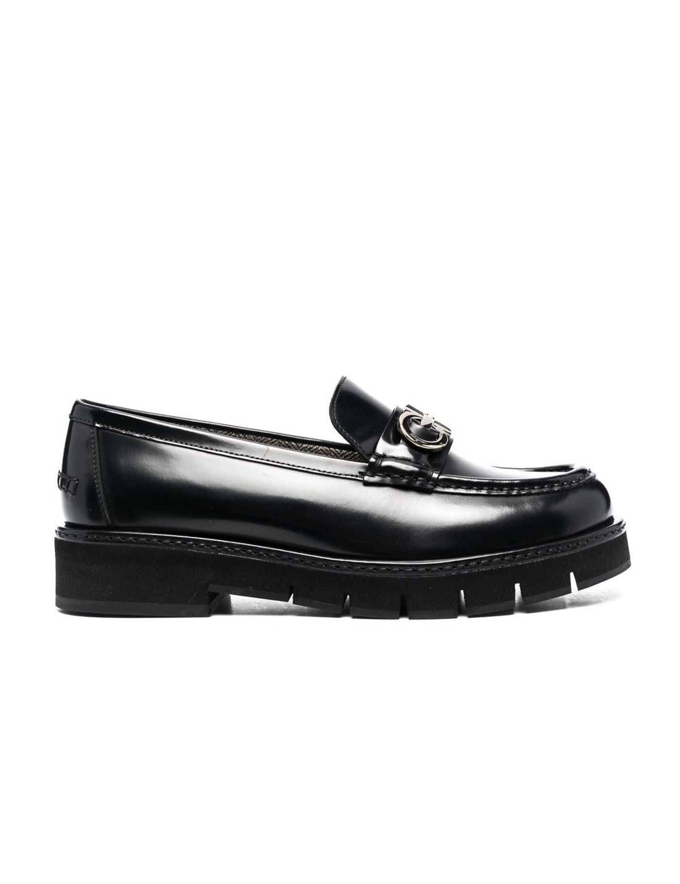 jet black calf leather slip-on style Gancini plaque round toe branded insole flat rubber sole