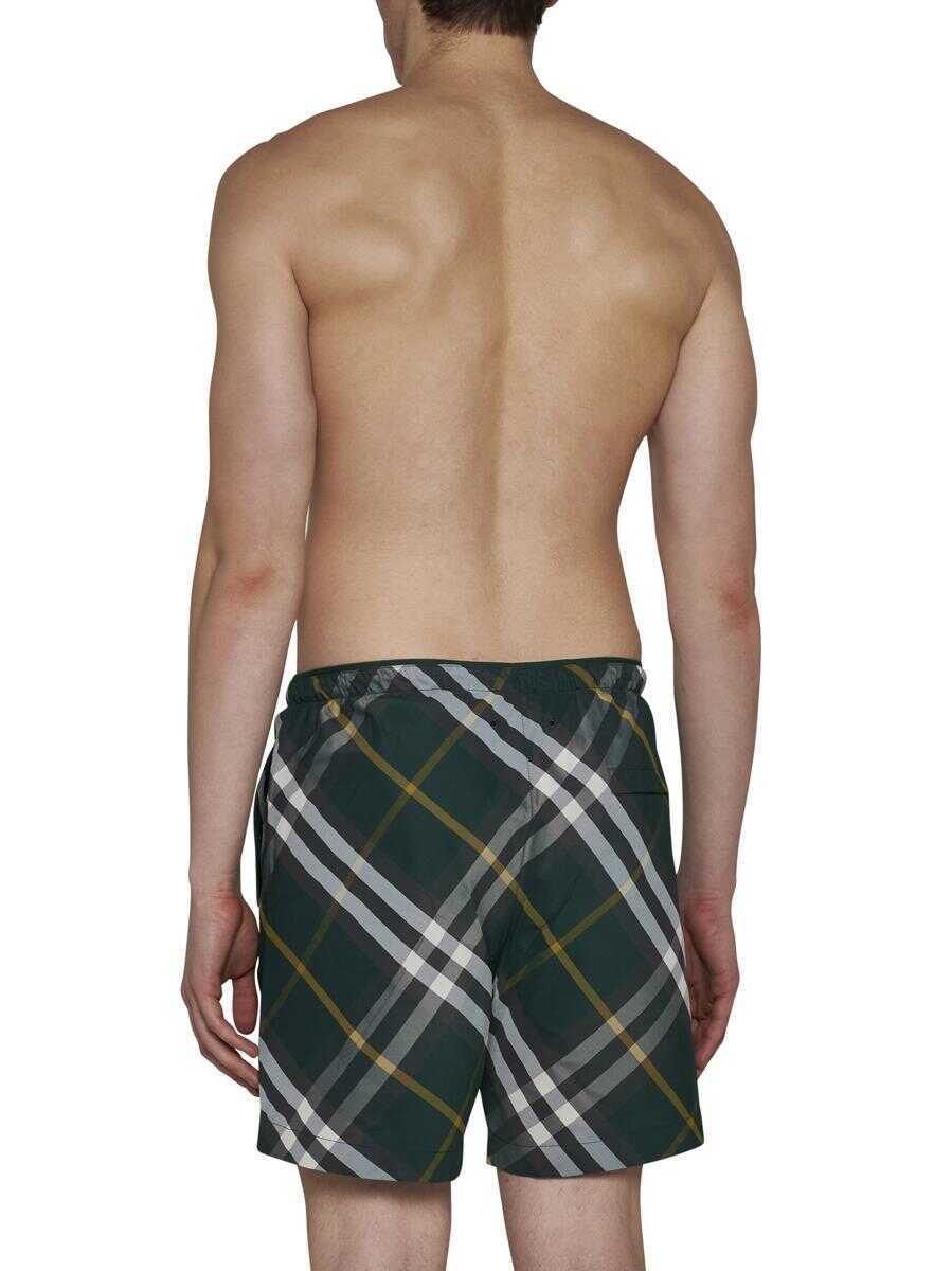 Burberry’s check print swim shorts in shades of green featuring elasticated waist, side pockets and back welt pocket.