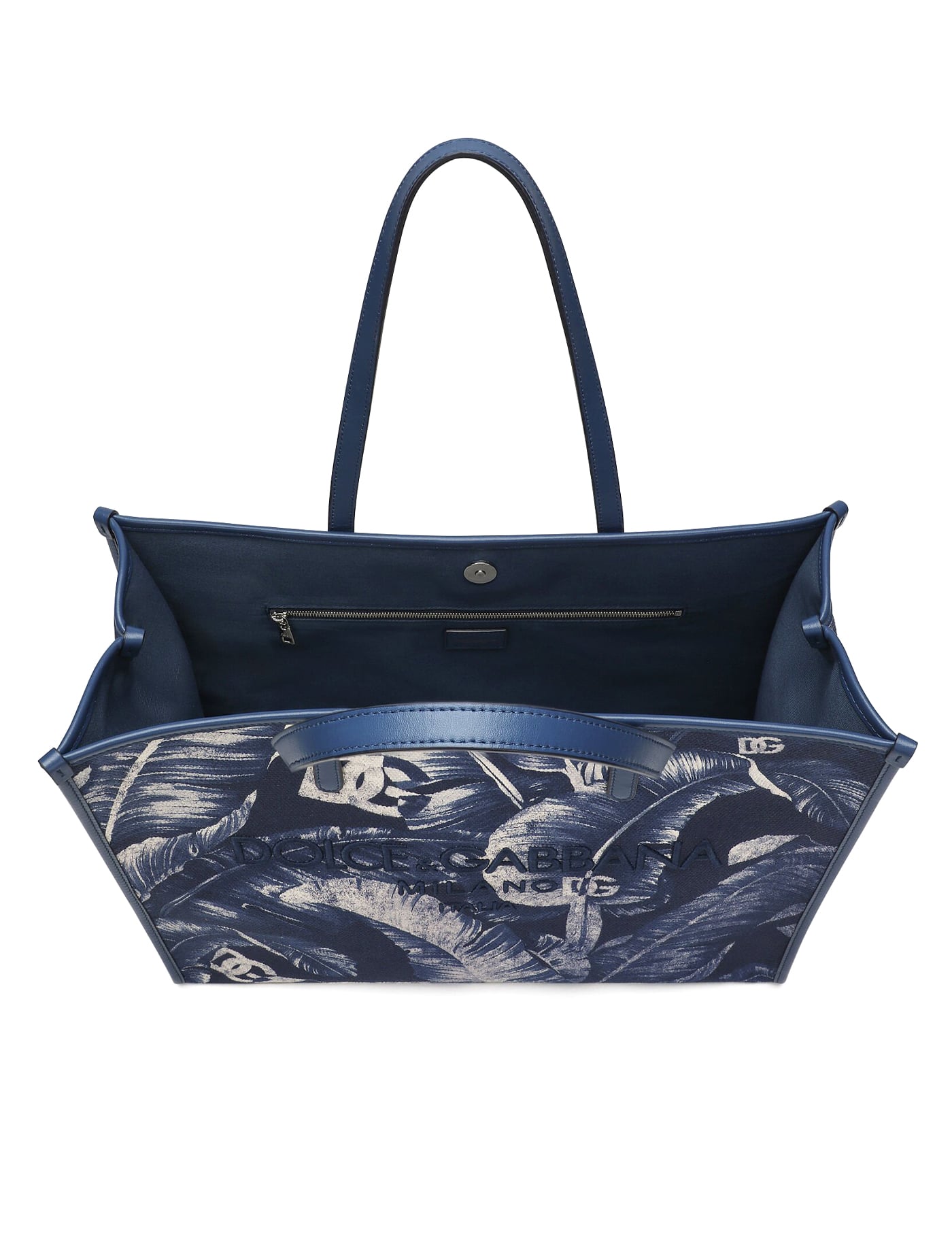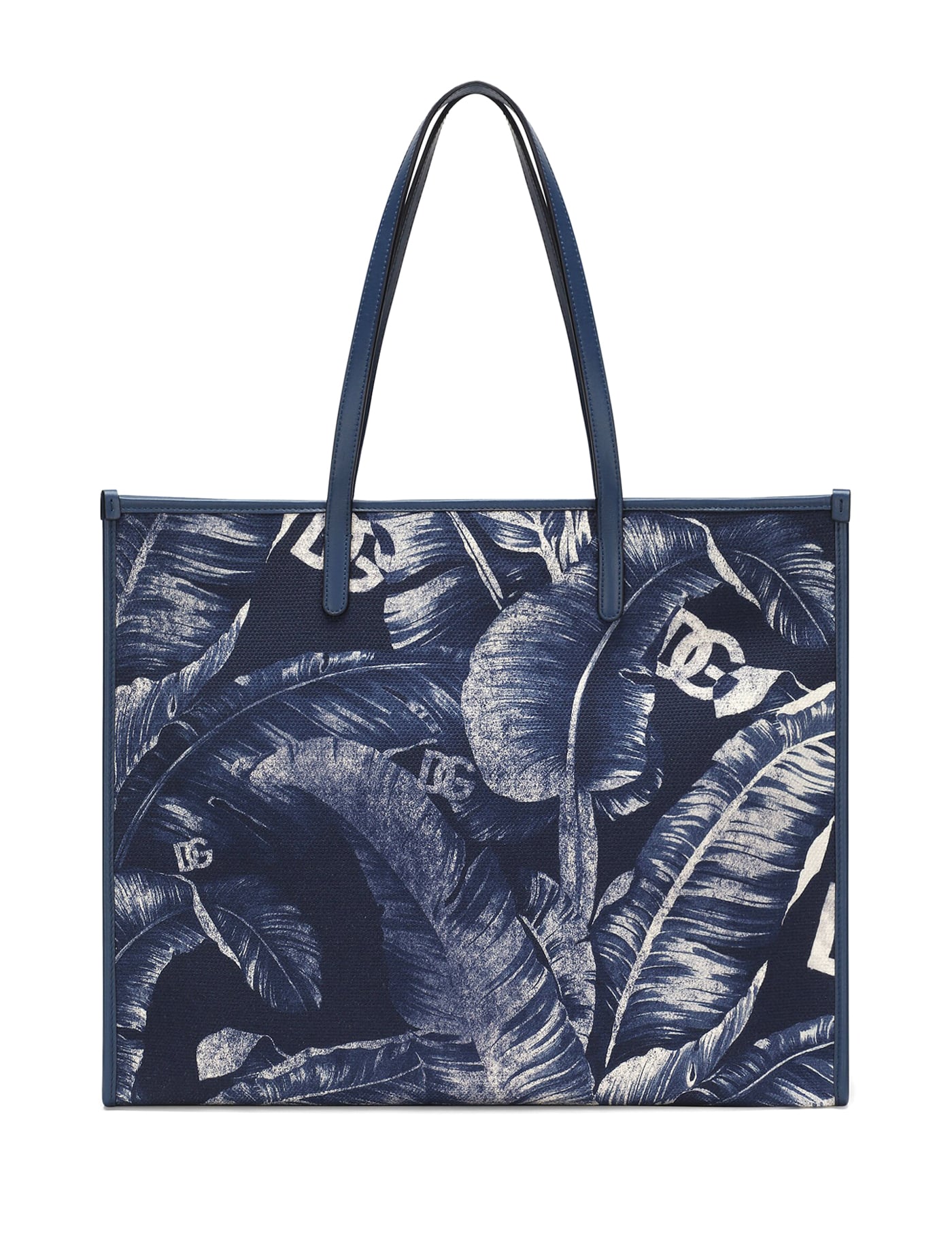 Midnight blue/cream white cotton leather trim canvas leaf print embroidered logo to the front two top handles magnetic fastening main compartment internal logo patch internal zip-fastening pocket