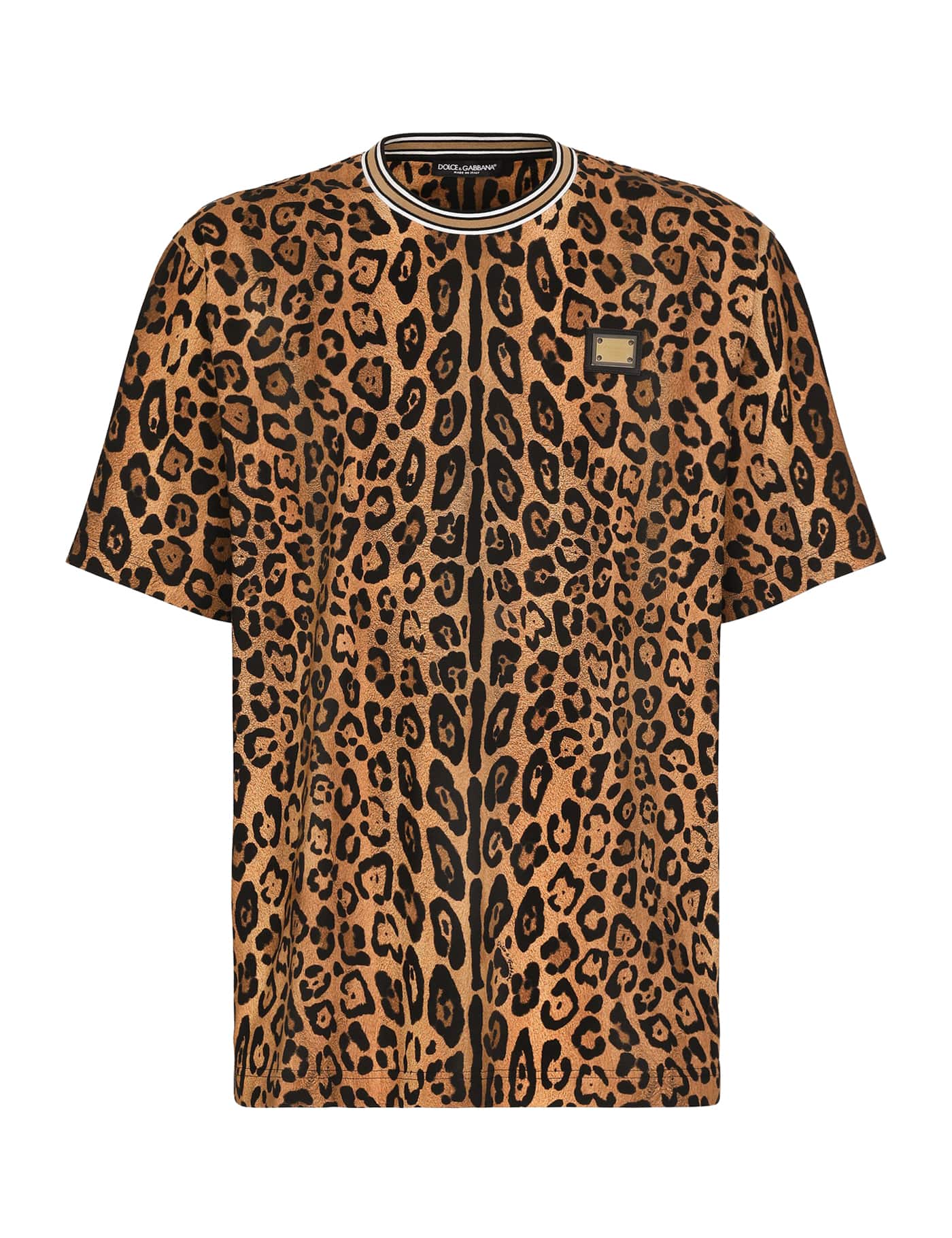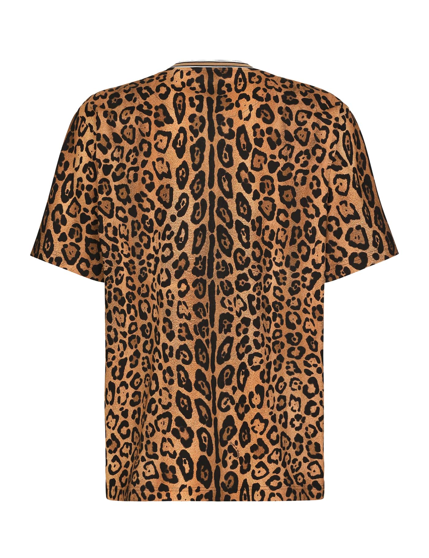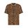 Brown cotton jersey texture all-over leopard print gold-tone logo plaque to the chest stripe trim crew neck short sleeves straight hem
