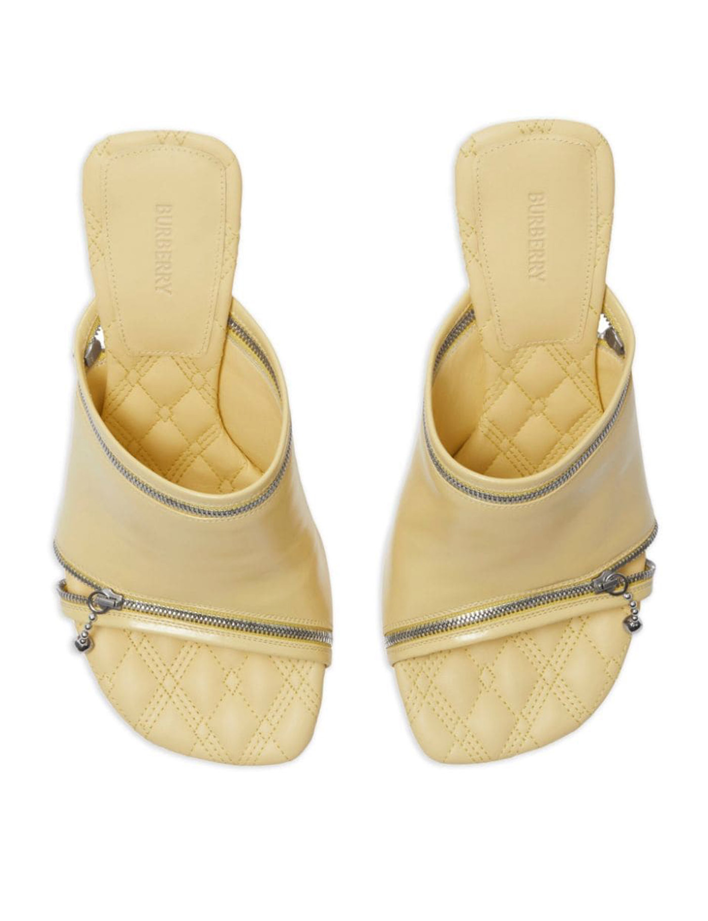 Peep mules by Burberry crafted in glossy leather complete with two silver-tone metal zip openings. Quilted leather insole, covered stiletto heel, leather sole with contrasting engraved Equestrian Knight Design.