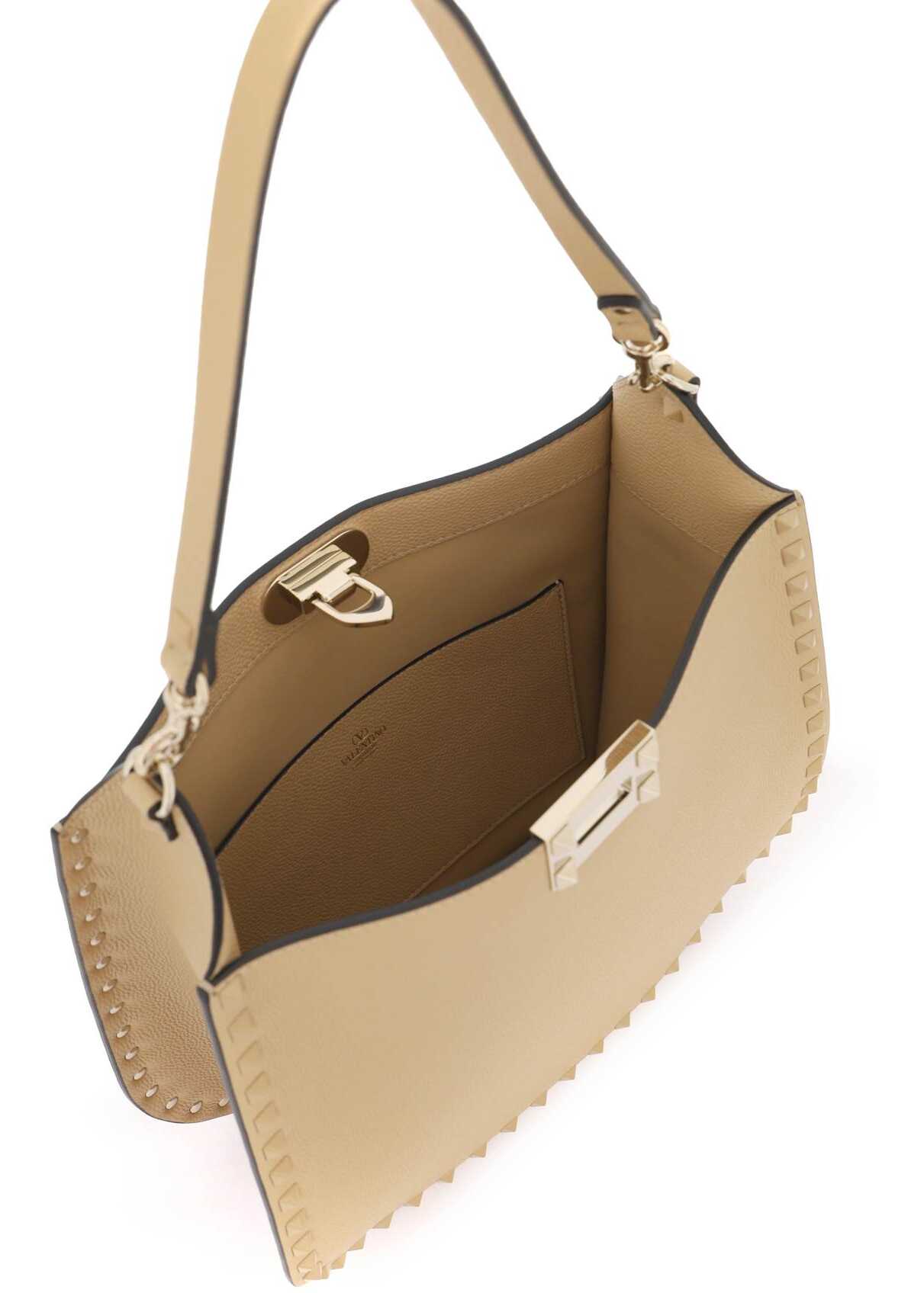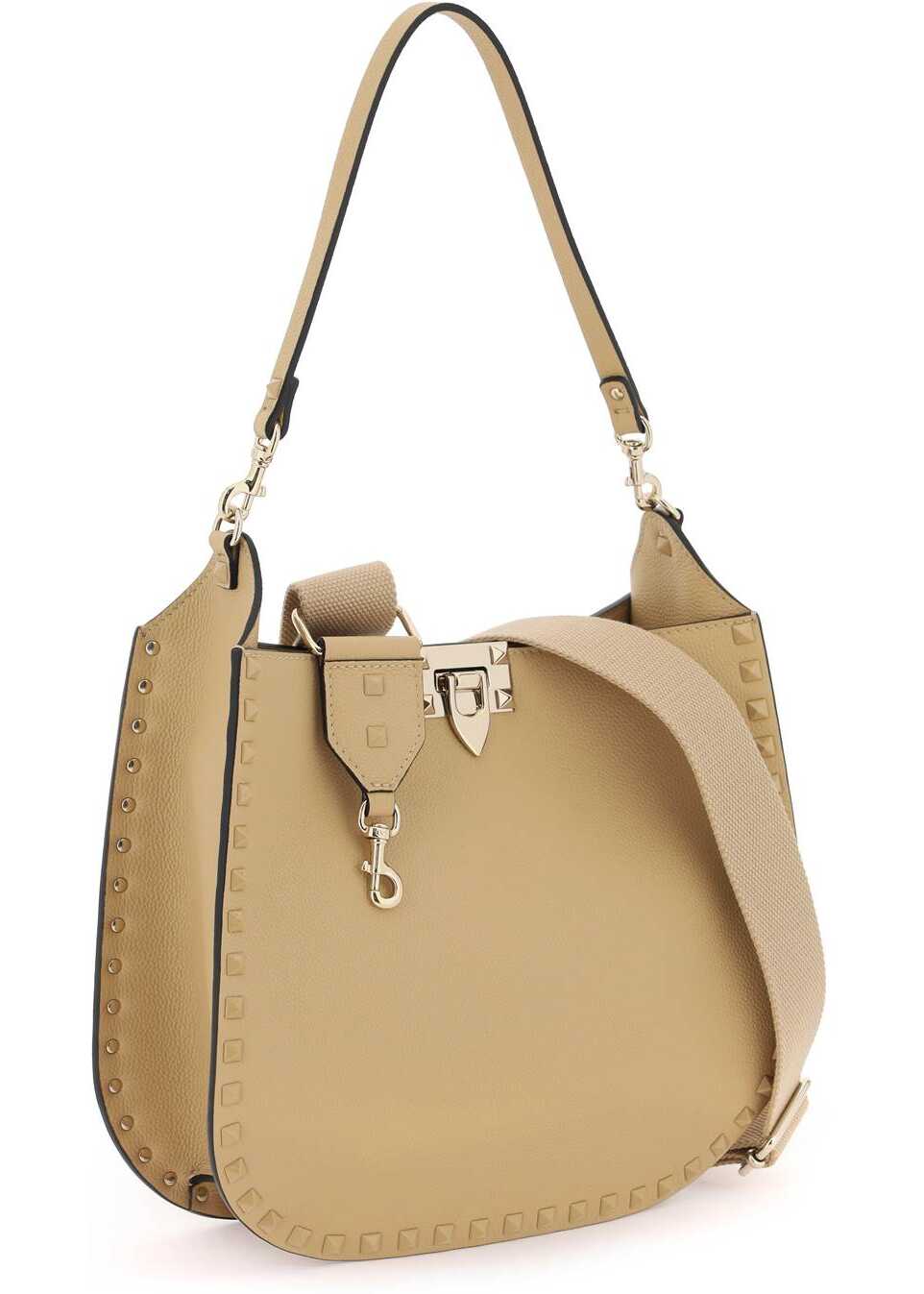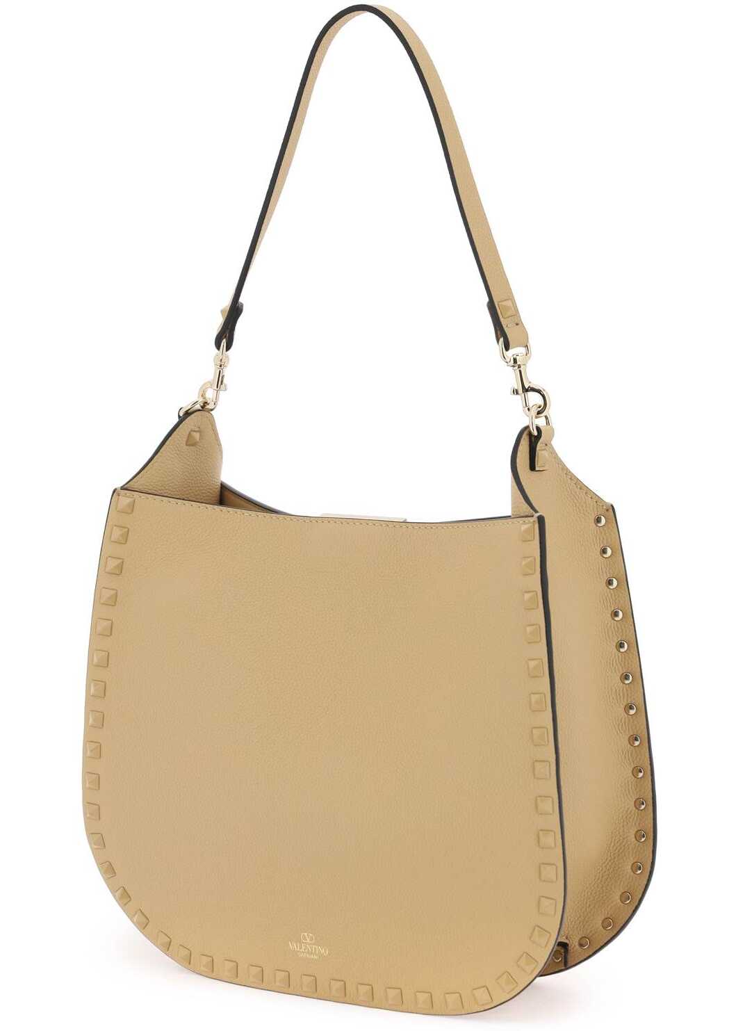The Valentino Garavani hobo bag is made of hammered leather with iconic tone-on-tone enameled studs applied on the edges. It features a hook closure and a smooth leather interior with an open pocket. The bag comes with a removable handle and an adjustable and removable fabric shoulder strap decorated with micro studs. The metallic accessories have a platinum finish.
