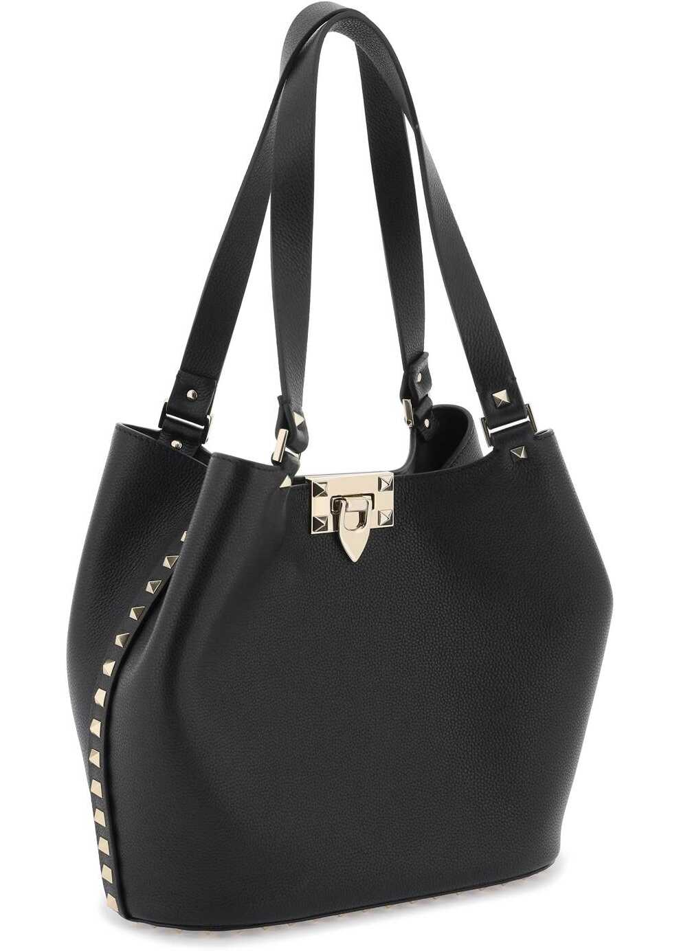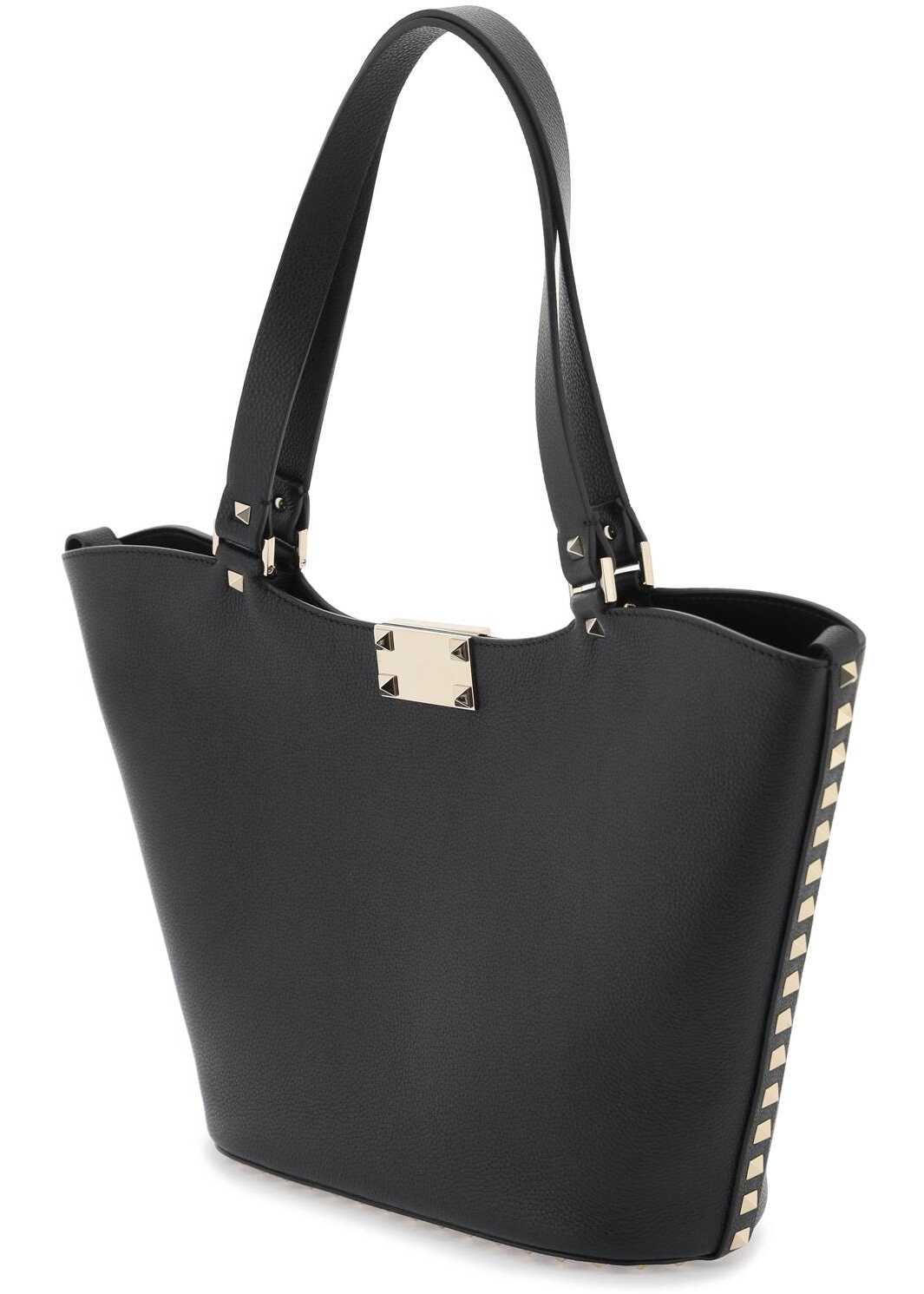 Valentino Garavani tote bag made of hammered leather and embellished with iconic platinum studs on profiles and base. Double handle, closure with hook, smooth leather interior with an open pocket and carabiner to adjust the width.