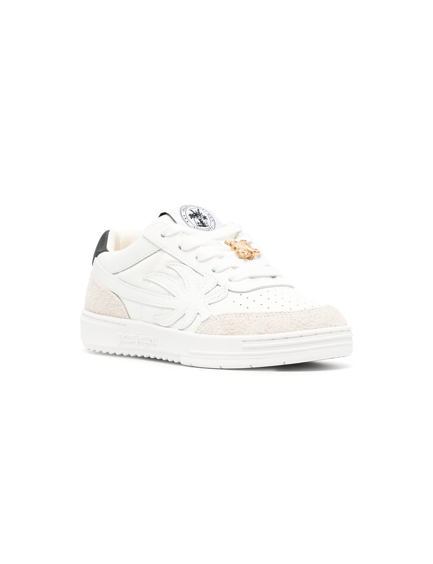The Palm Beach University sneakers by Palm Angels are made of smooth quilted leather with suede inserts and an iconic tonal leather palm tree applied on the side. Perforated toe, removable monogram in golden metal on the laces, logo printed on the contrasting spoiler, logo label on the tongue. Fabric interior with removable leather insole and serrated rubber sole.