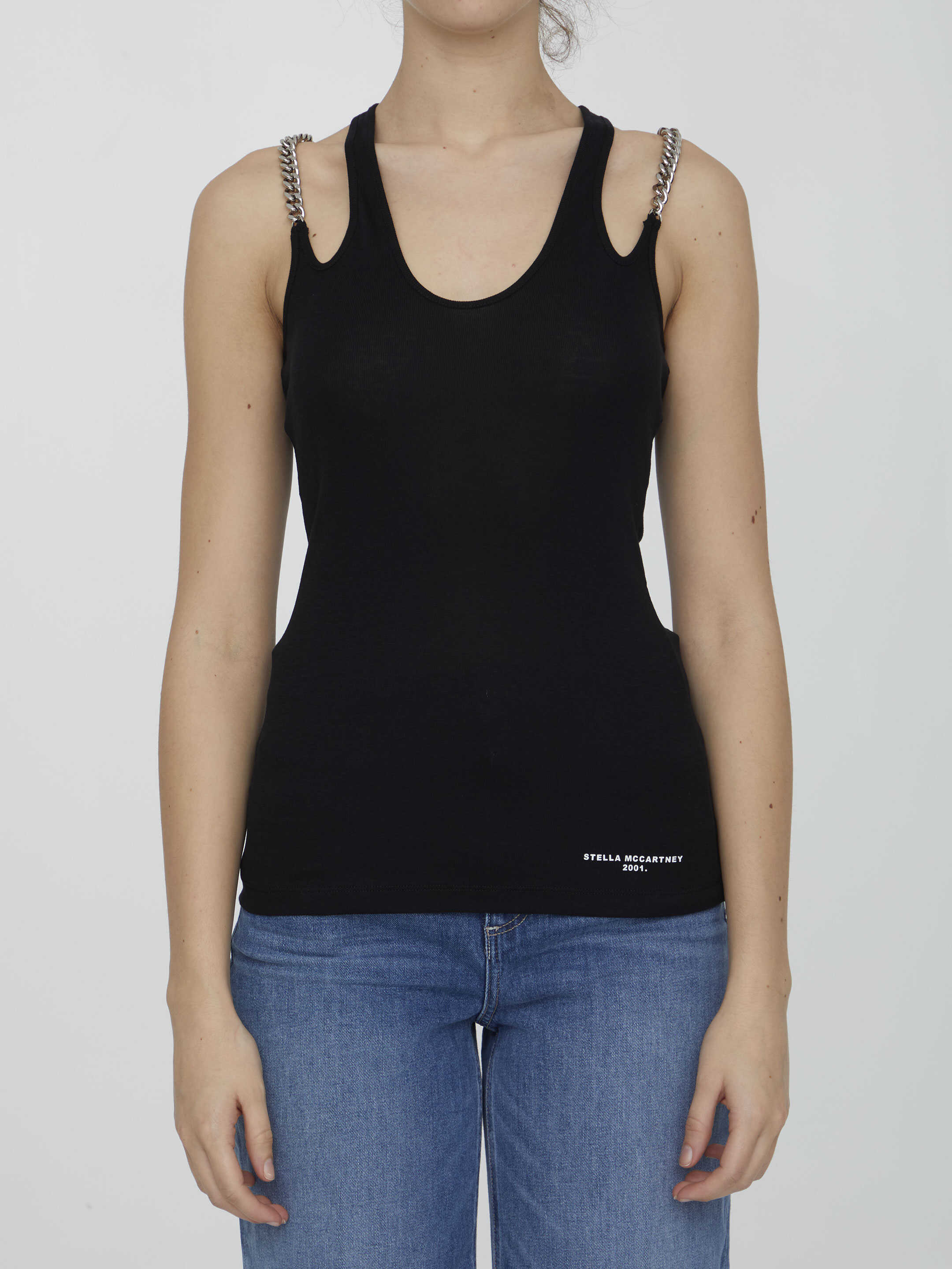 Falabella top in black cotton blend with fabric shoulder straps and silver diamond-cut chain shoulder straps. Stella McCartney logo printed on hem. Fitted cut.