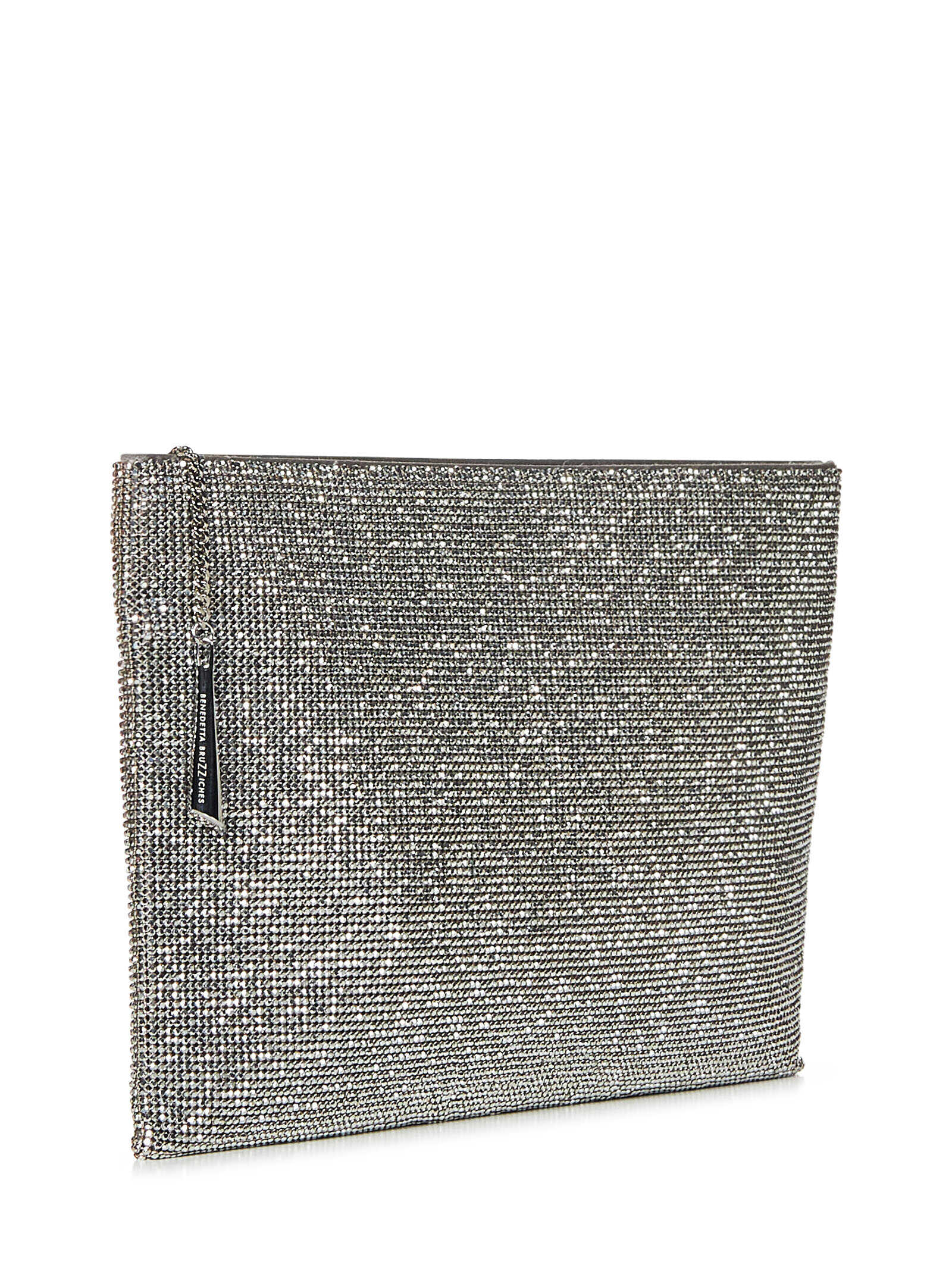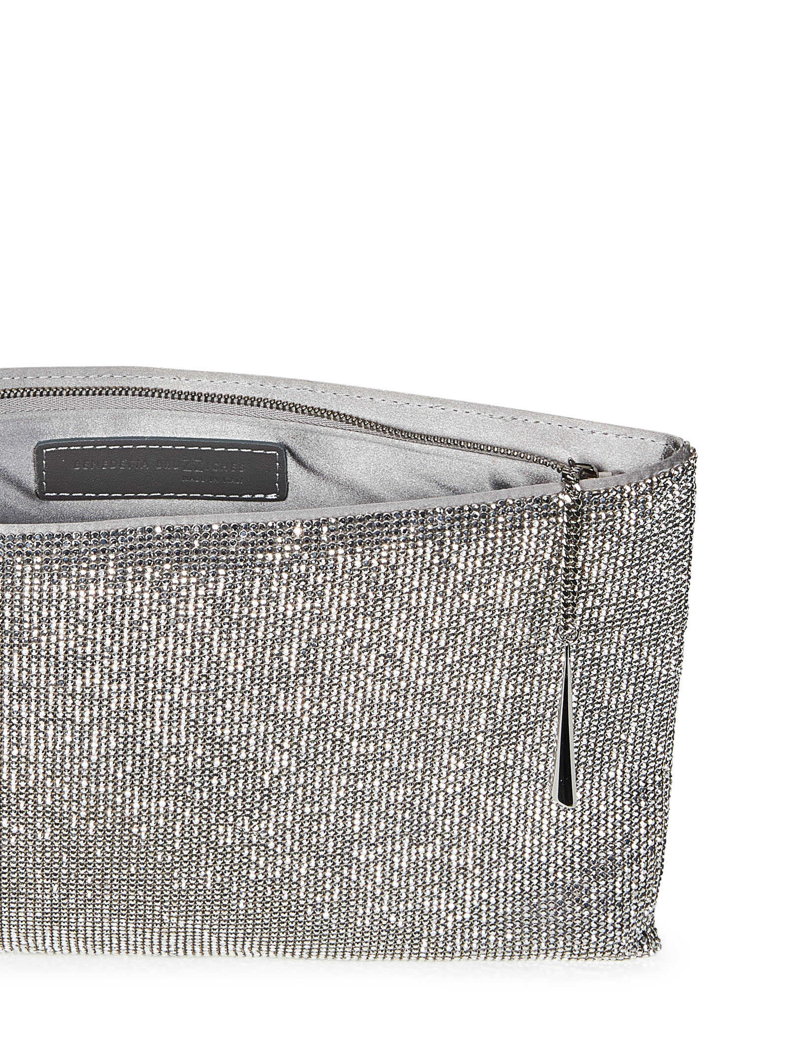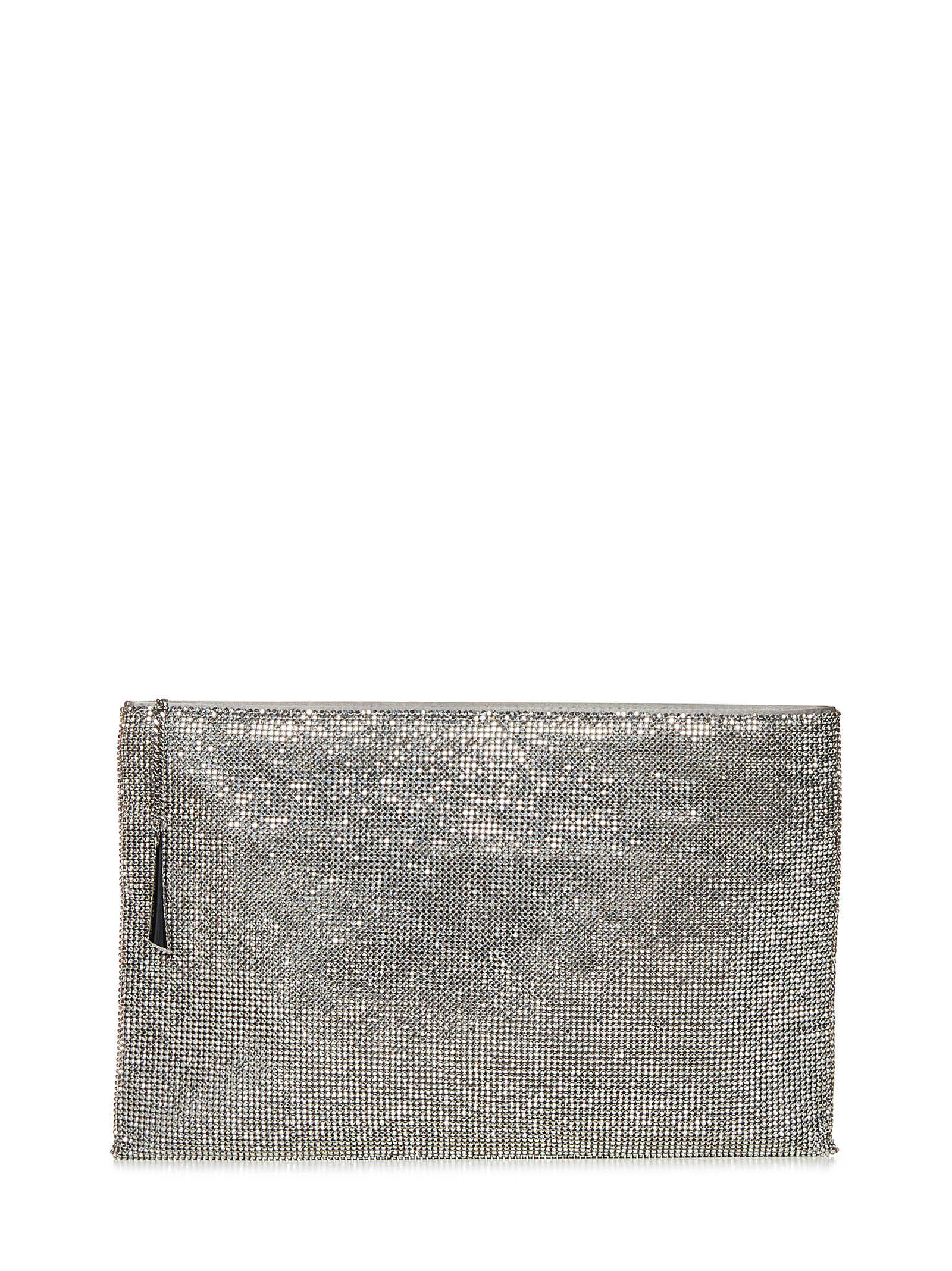 Silver crystal mesh clutch with silk satin lining and zip closure.