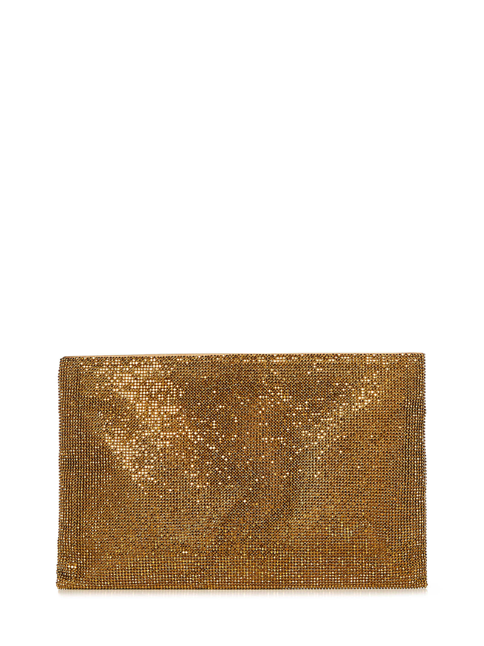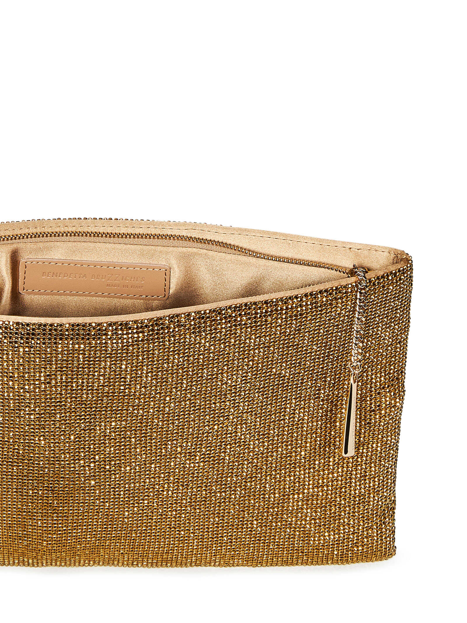 Gold clutch in silk satin and crystal mesh with zip closure.