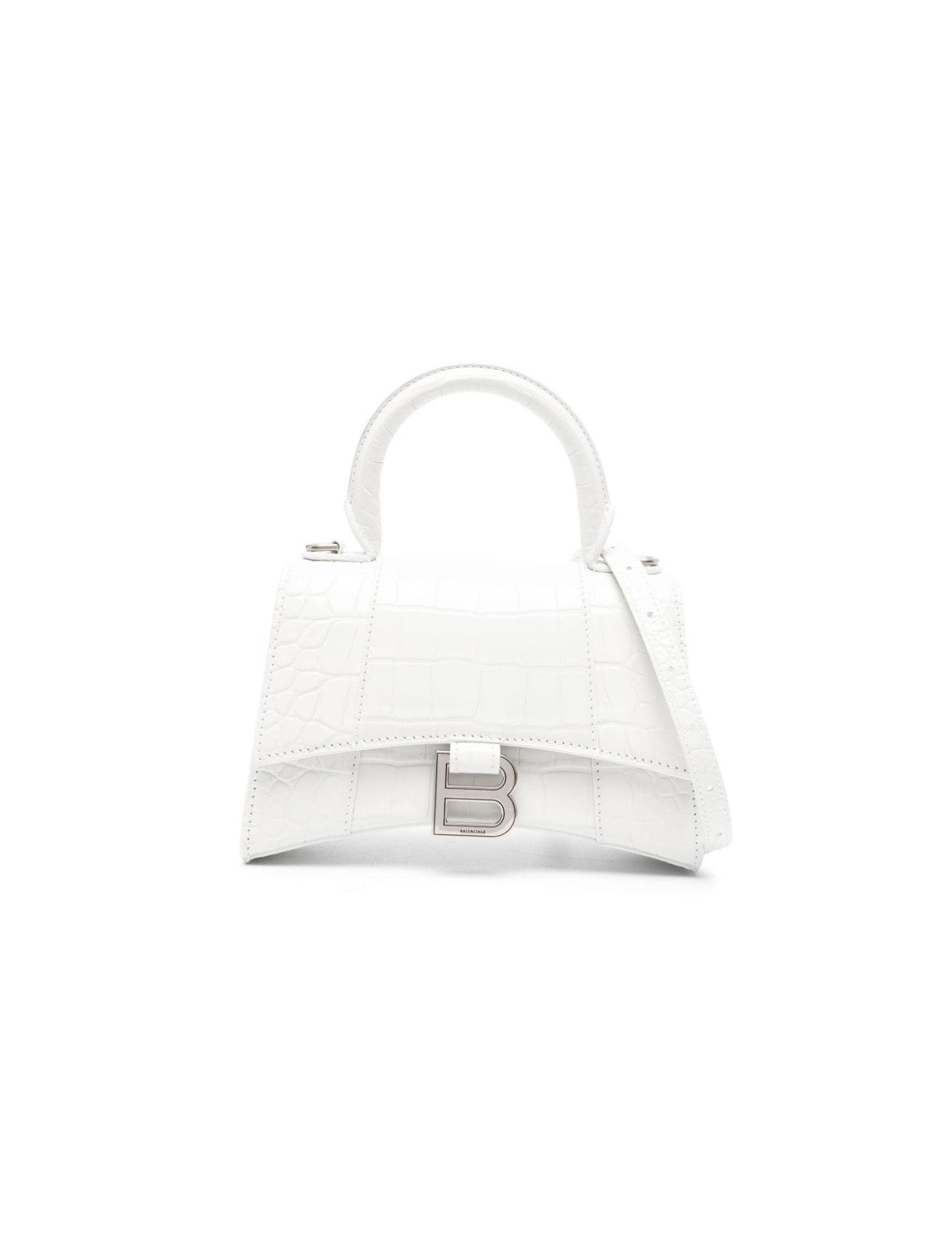 White handbag, hourglass, with handle, with adjustable and removable shoulder strap, magnetic closure, rear pocket, silver finishes.