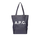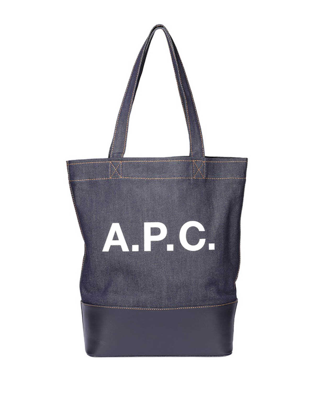 A.P.C. Denim bag, smooth leather bottom, contrasting printed logo on the front, denim handles, inside pocket with metal zip. Measurements: 42 x 30 x 13 cm.