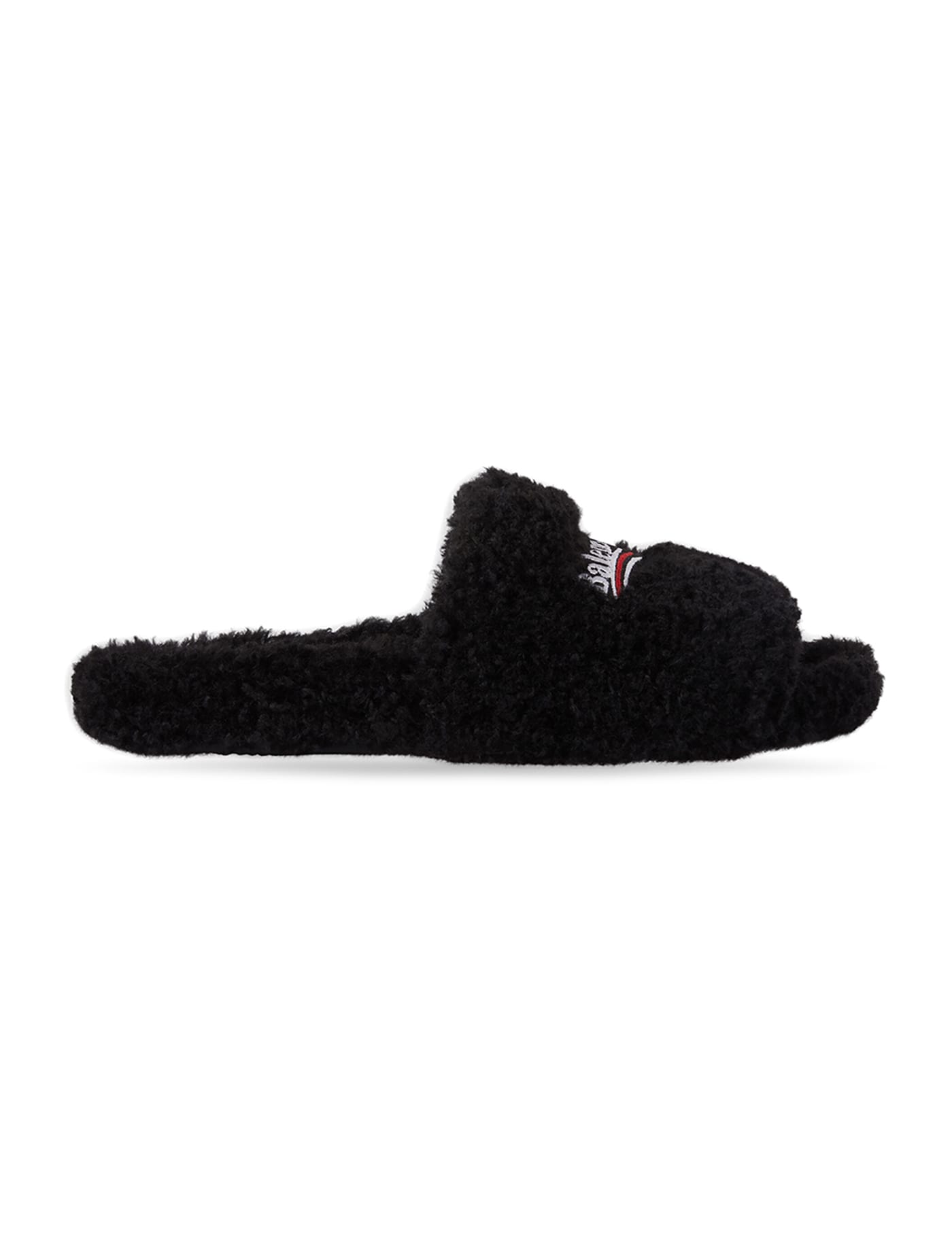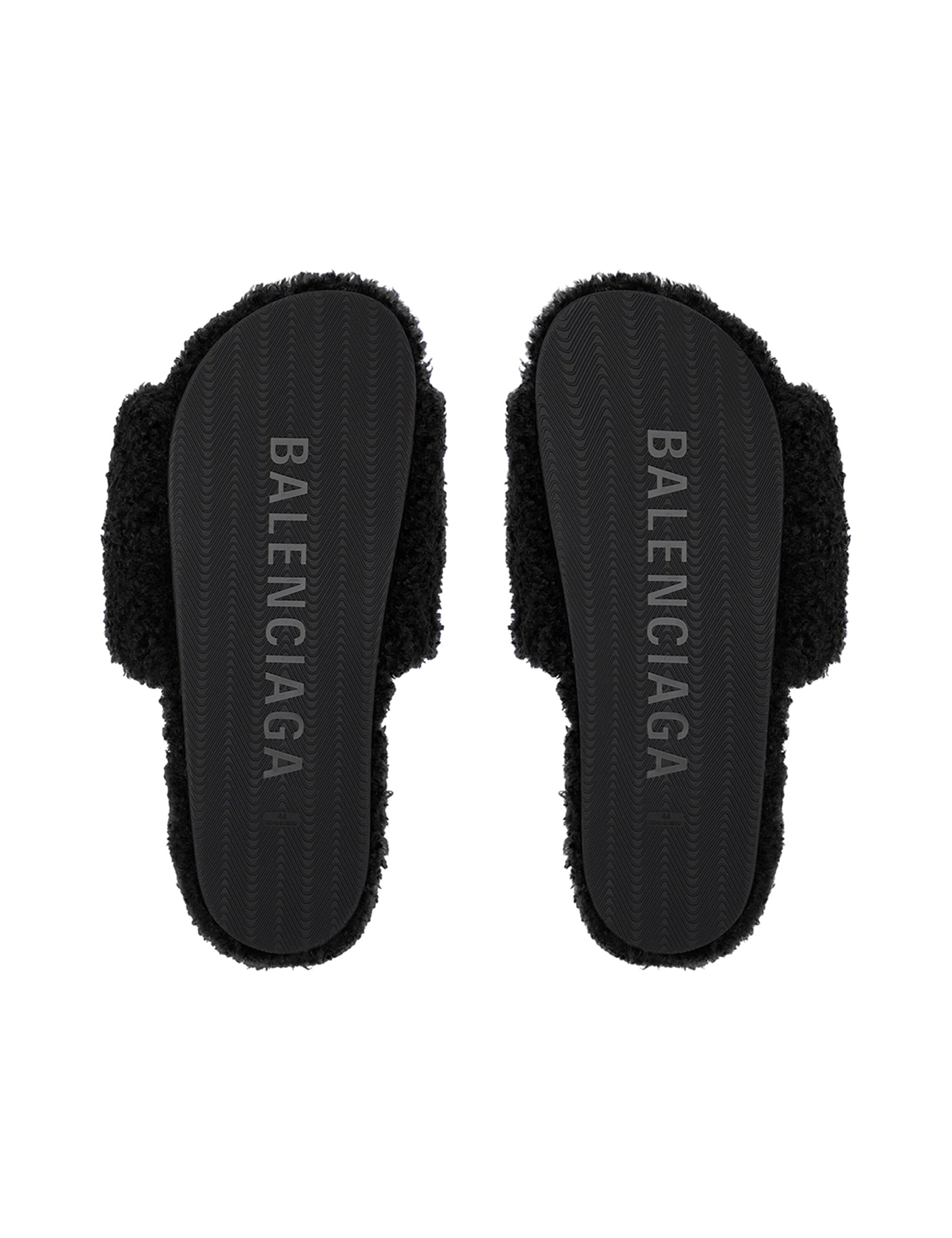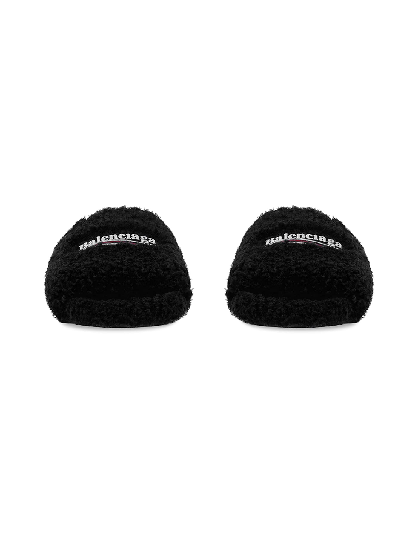Black faux shearling campaign-logo faux-shearling slides from BALENCIAGA featuring embroidered logo, slip-on style, open toe and rubber sole.