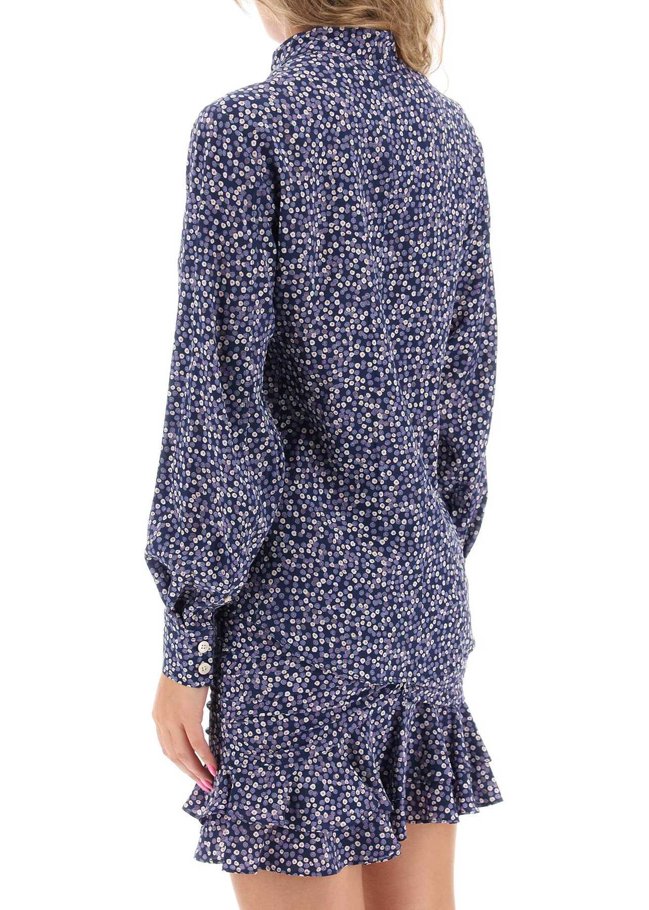 Isabel Marant Ilda shirt made of stretch silk crêpe decorated with a micro floral pattern. It features mandarin collar, concealed button closure, two-button cuffs, rounded hem. Wide sleeves, regular fit. The model is 177 cm tall and wears a size FR 34.