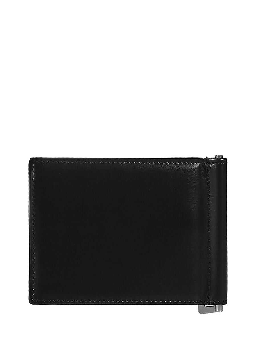 Black leather card holder from Saint Laurent featuring frontal silver tone logo and inside pockets.