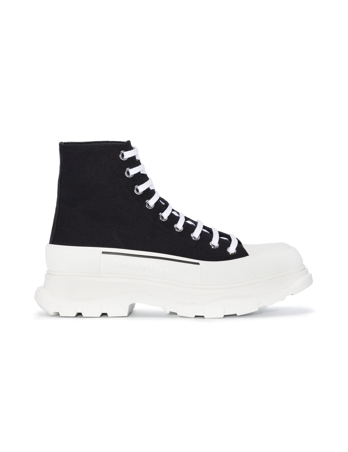 Cotton Sack Sneakers by Alexander McQueen featuring a structured round toe, an ankle-high style, a lace-up front closure, and a textured rubber platform sole.