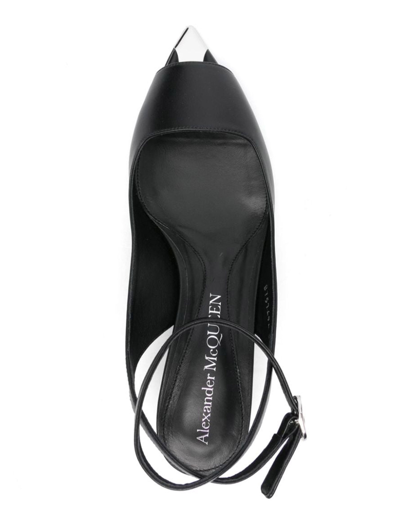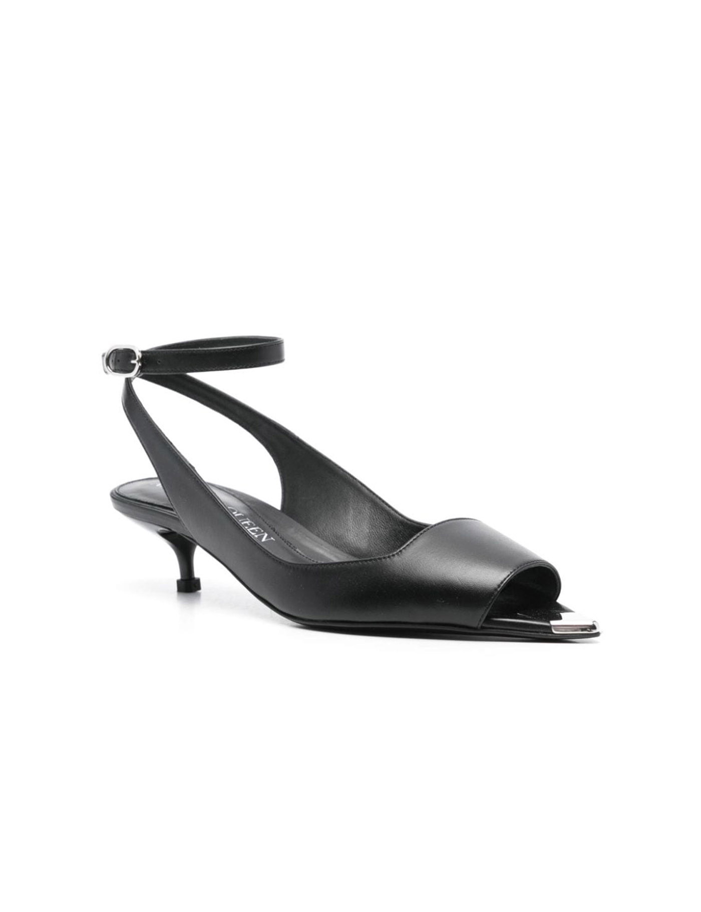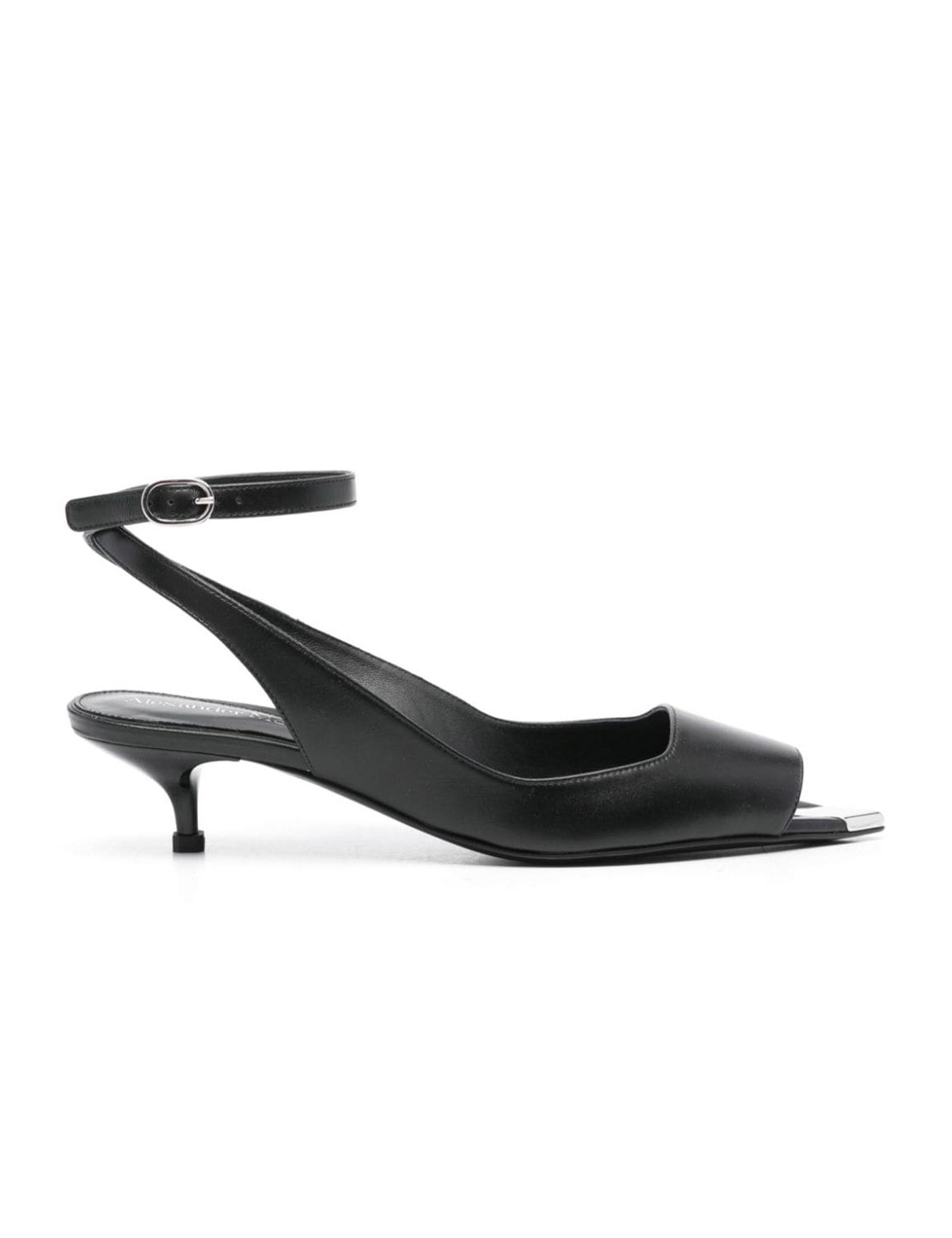 Punk 40mm leather sandals from Alexander McQueen featuring black, leather, silver-tone hardware, metal toecap, pointed toe, buckle-fastening ankle strap, branded insole and kitten heel. HEEL: 5.0 Centimetres