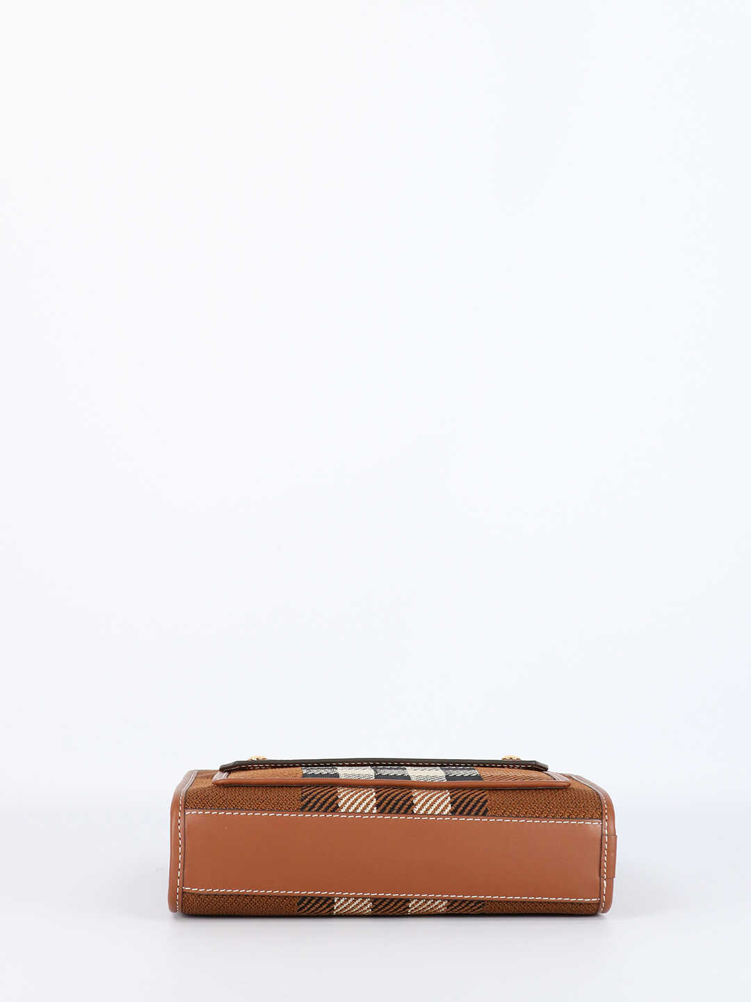 Mini Pocket bag with Check pattern and topstitched leather trims. It features a front pocket with logo-engraved press studs, permanent handles, detachable shoulder strap and one interior zip pocket.