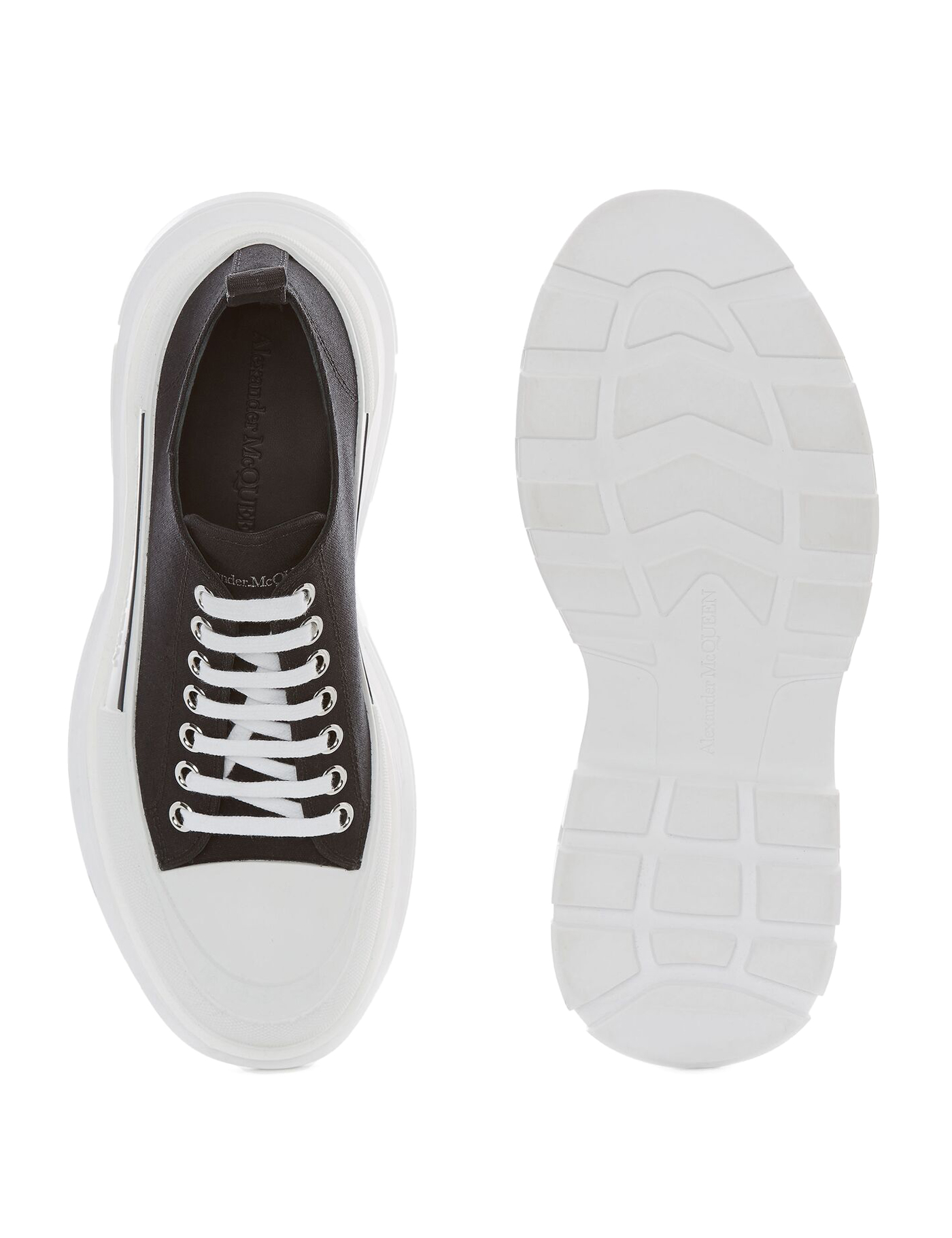 Sneakers by Alexander McQueen, fabric upper, iconic textured rubber sole with brand signature embossed on side panel, heel pull for easy on and off, textured round rubber toe, lace-up front closure.