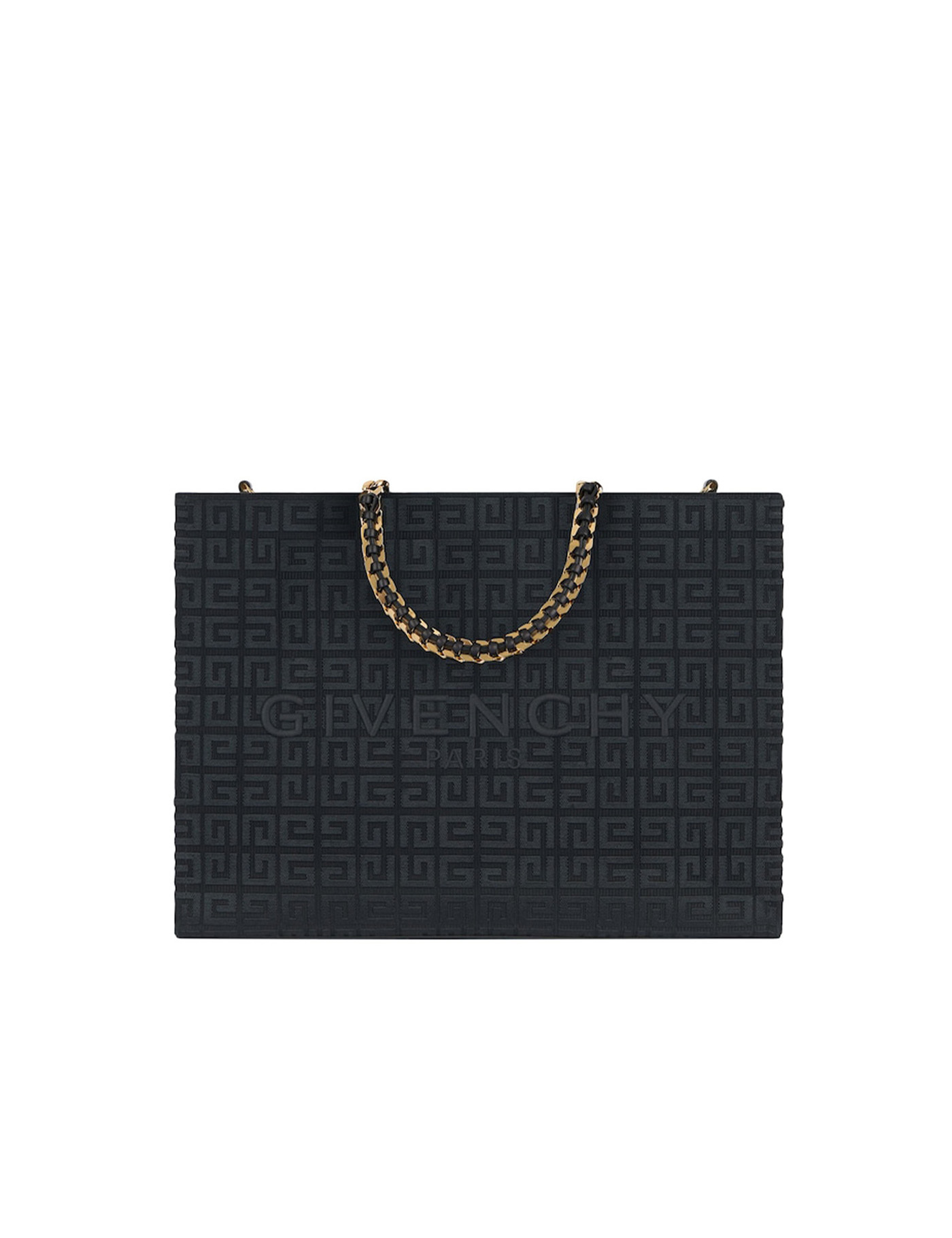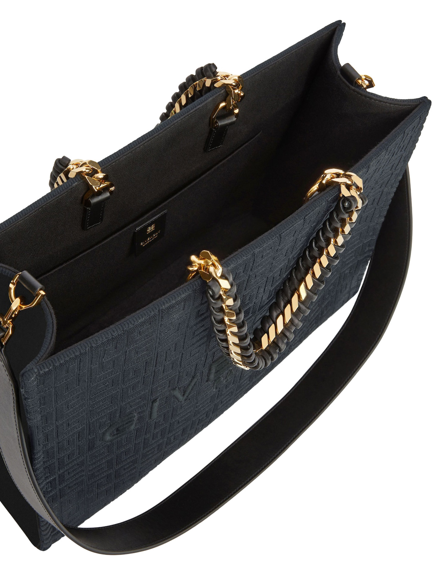 - Material: 79% cotton, 14% acrylic, 7% fiber - Color: black - Cotton lined interior - Leather trim - Other details: all-over 4G motif and Givenchy lettering in center - Removable leather shoulder strap - Shoulder strap length: 41 cm - Made in Italy - Dust bag - Item number: BB50QPB1LS001 - Dimensions: 37 x 26 x 14 cm -.