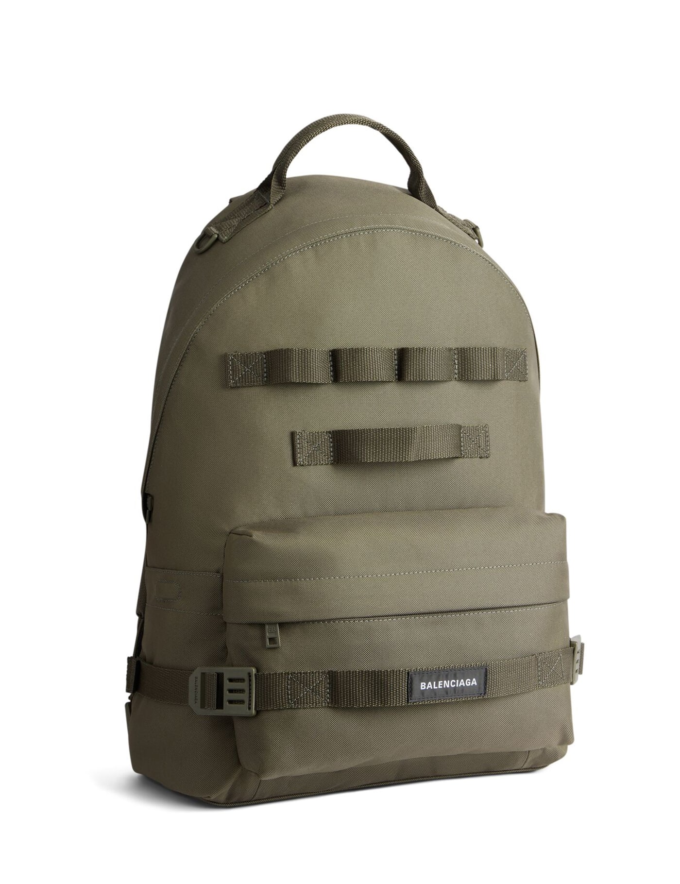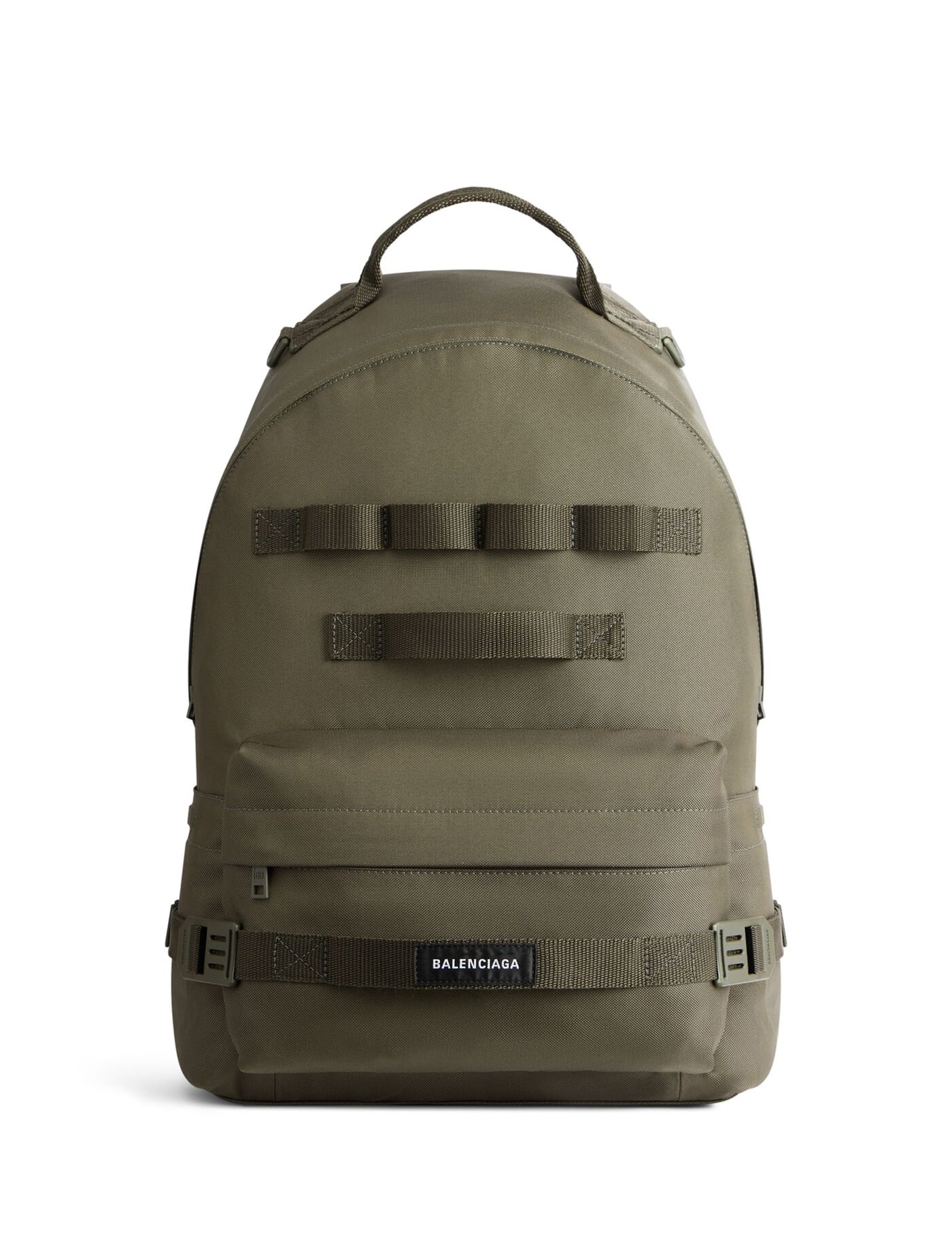 Army Backpack by Balenciaga, top closure with double-slider zipper, two pockets on side panels, padded shoulder straps, padded and rigid back, elastic straps on front, iconic brand monogram embroidered in contrasting color on front, maxi adjustable shoulder strap to carry it over the shoulder.