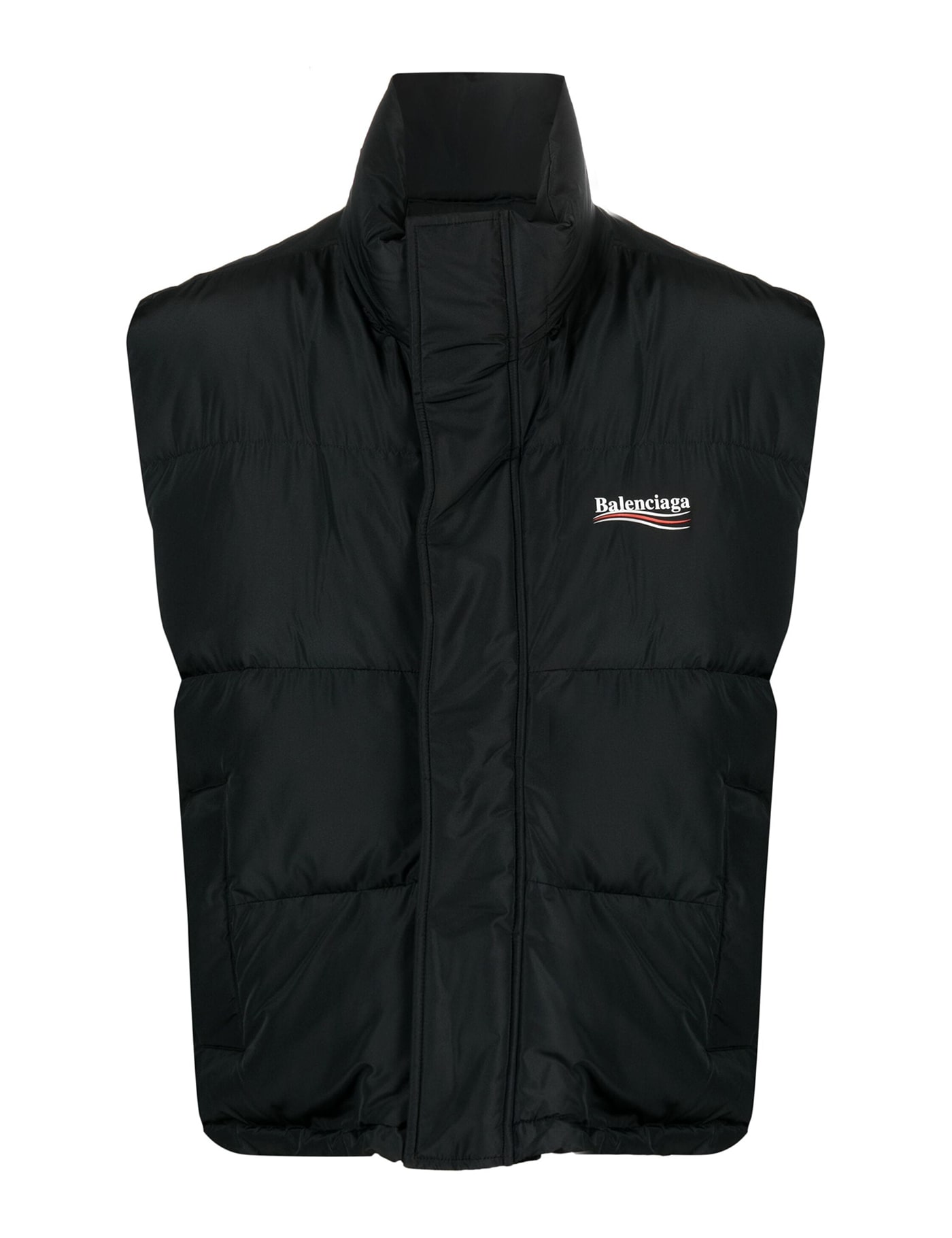 Puffer Cocoon vest in black technical micro faille with Political Campaign motif printed on chest and on the back. It features packable hood with drawstring, stand-up collar, front concealed zip and press-stud closure and two side press-stud pockets. Cocoon fit.
