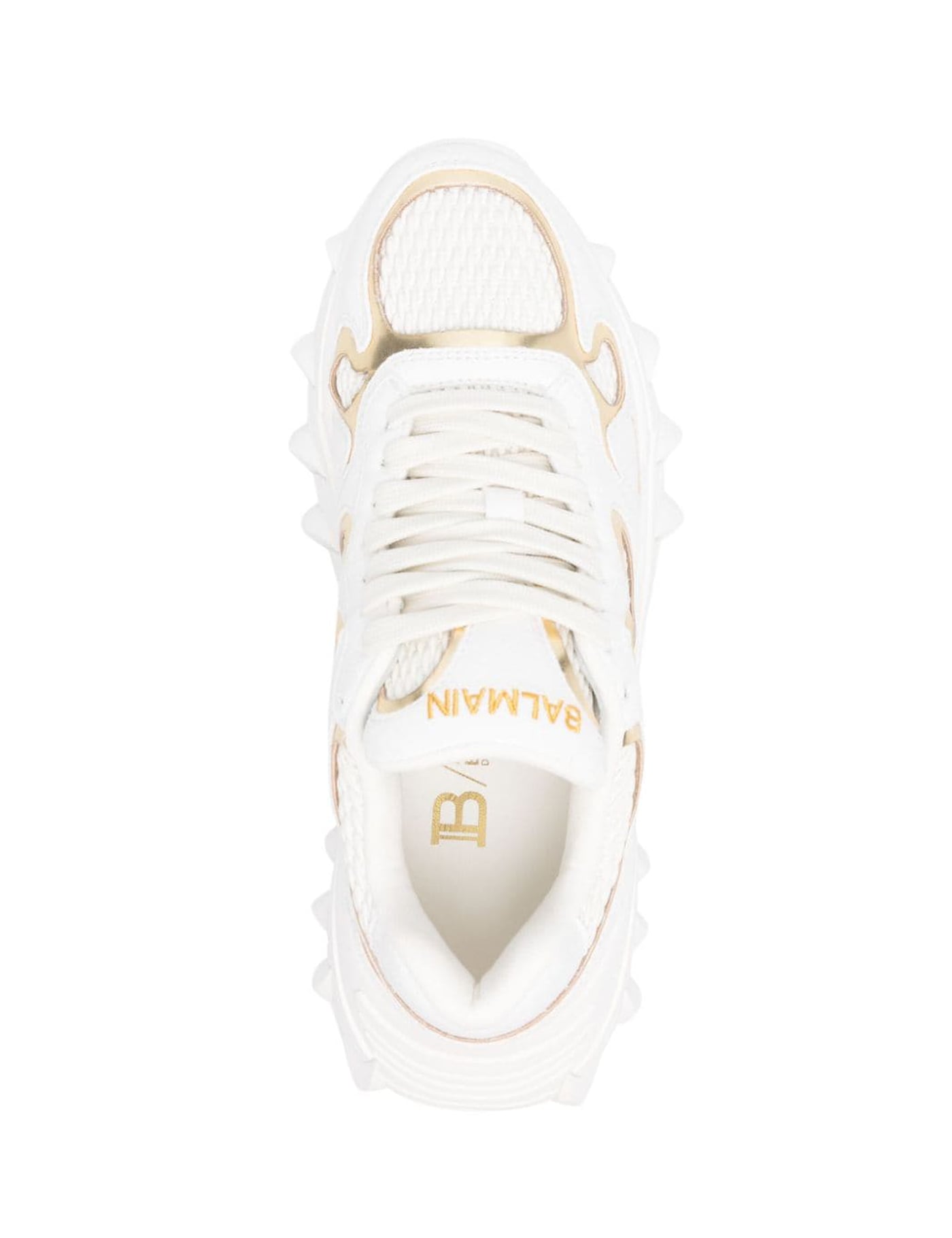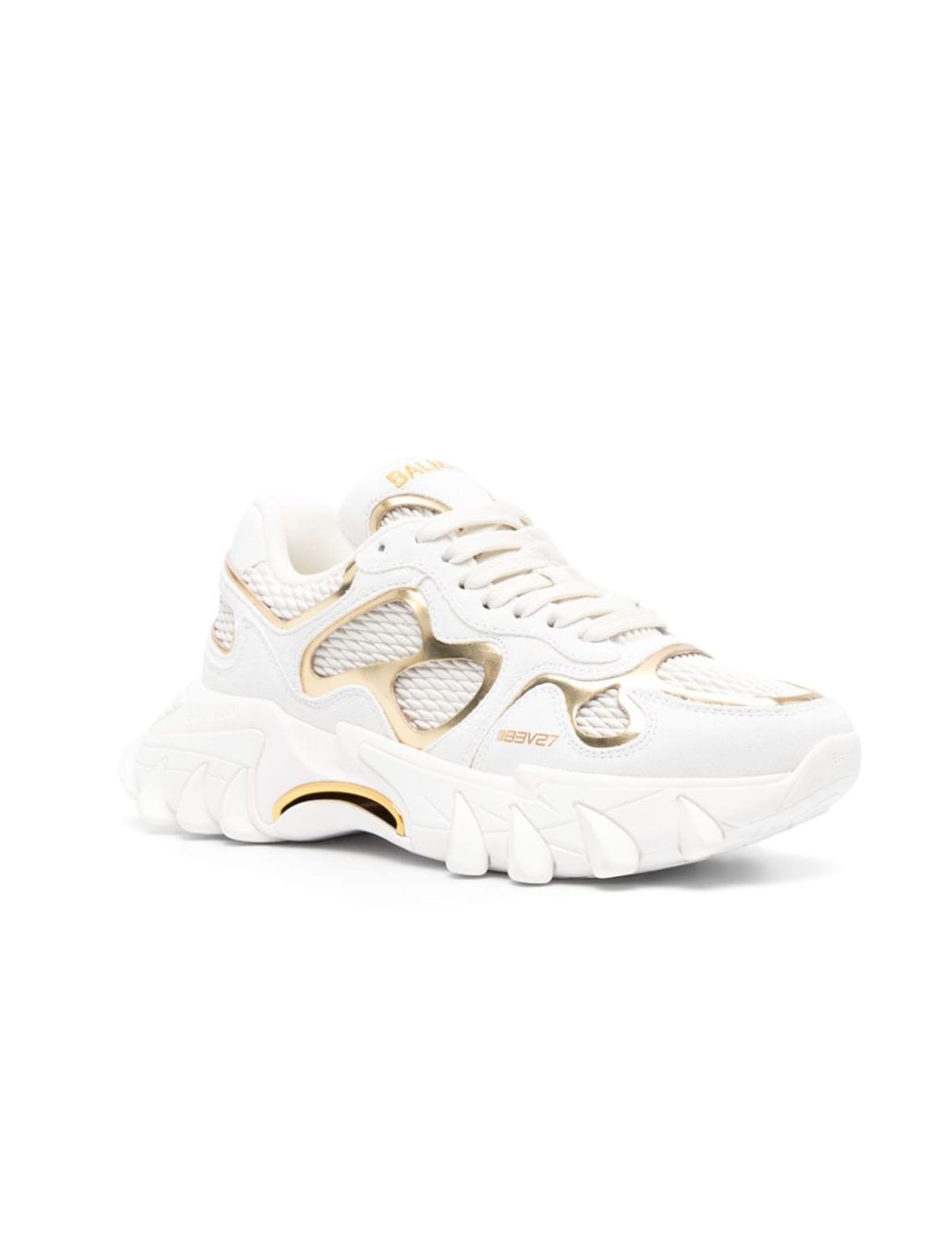 Sneakers in leather, suede and mesh White and gold color Balmain logo Lace closure Rubber sole Thick sole