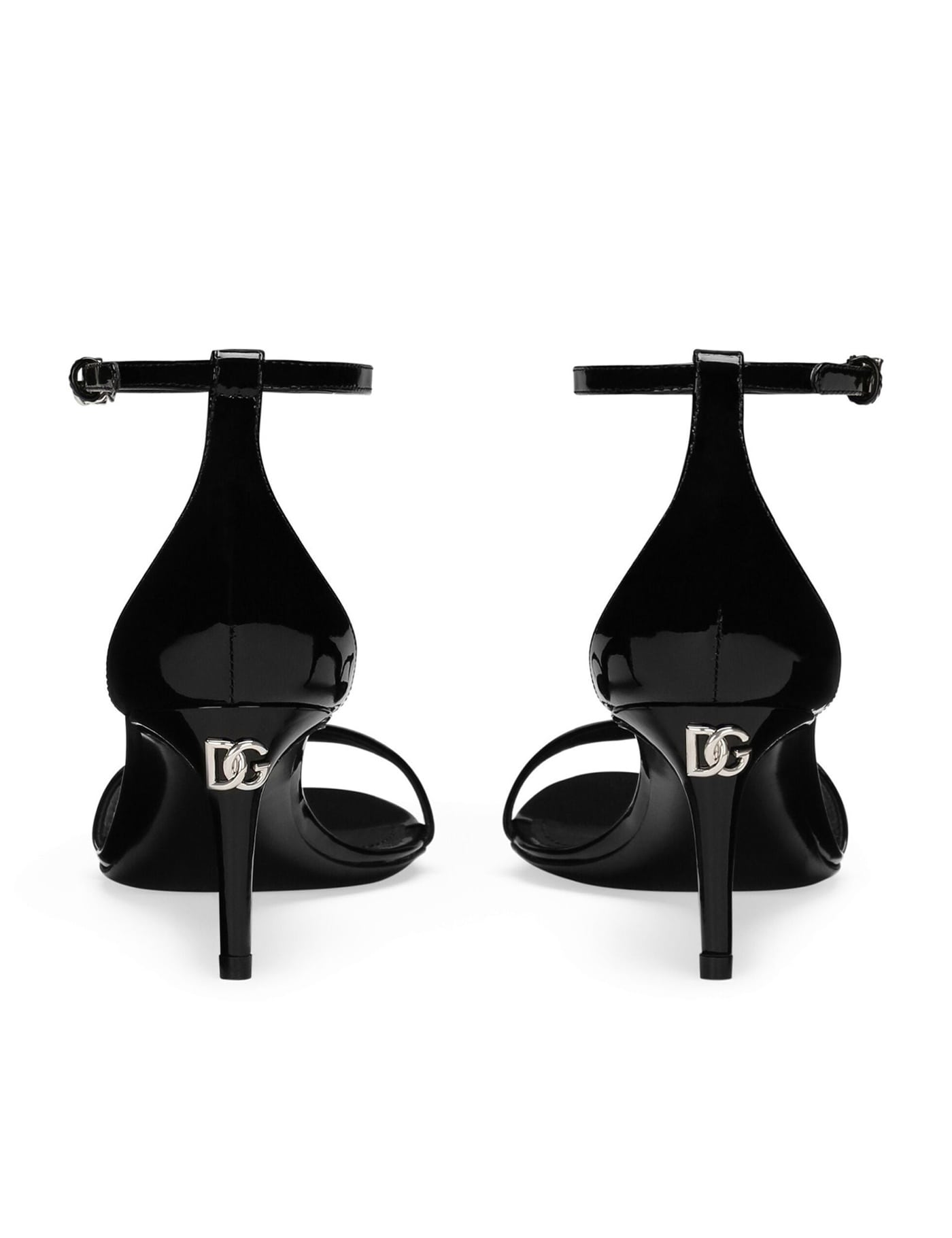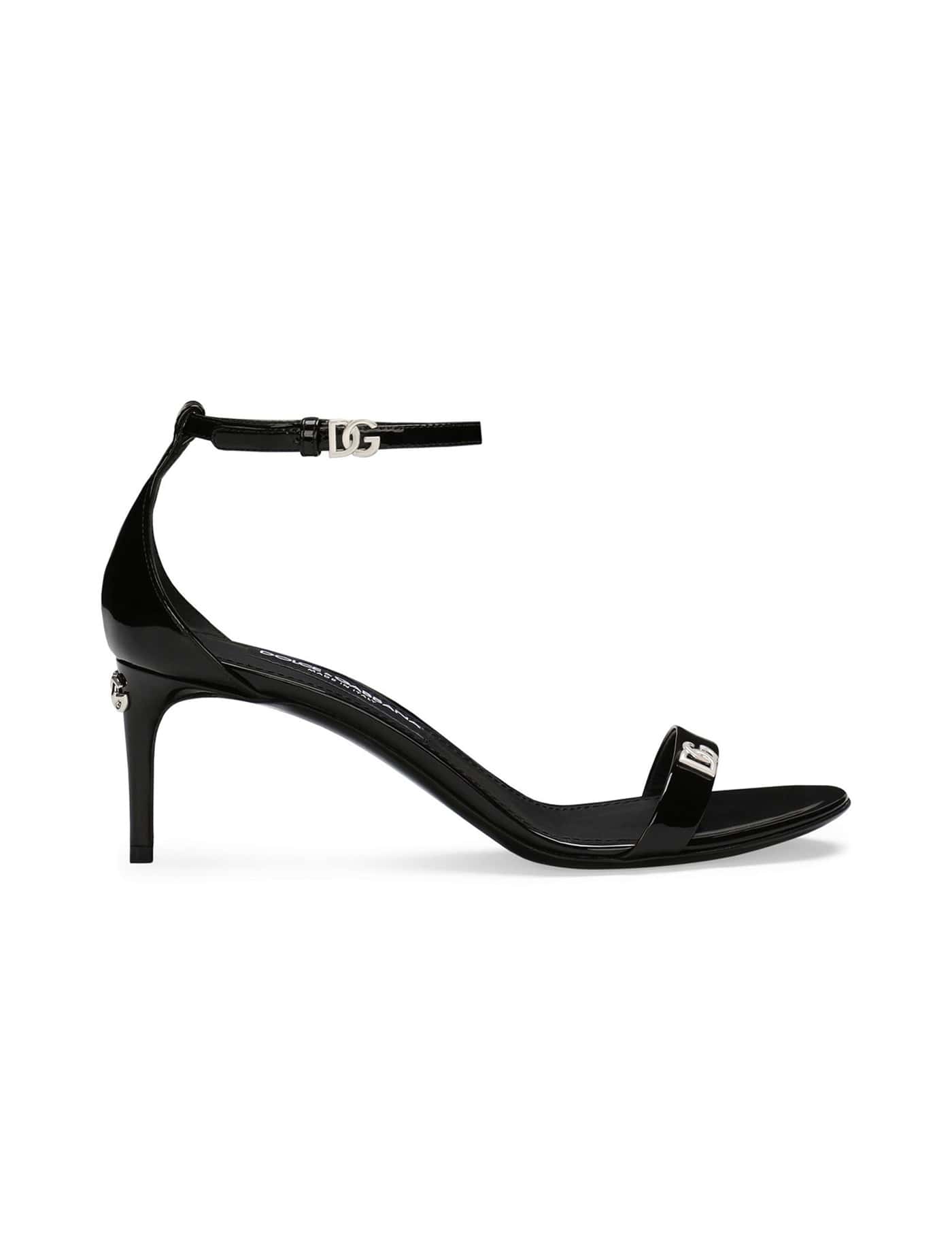 Patent leather sandal Black colour A front band Adjustable ankle strap Closed heel Small metal DG logo details Leather sole Heel height 6 cm
