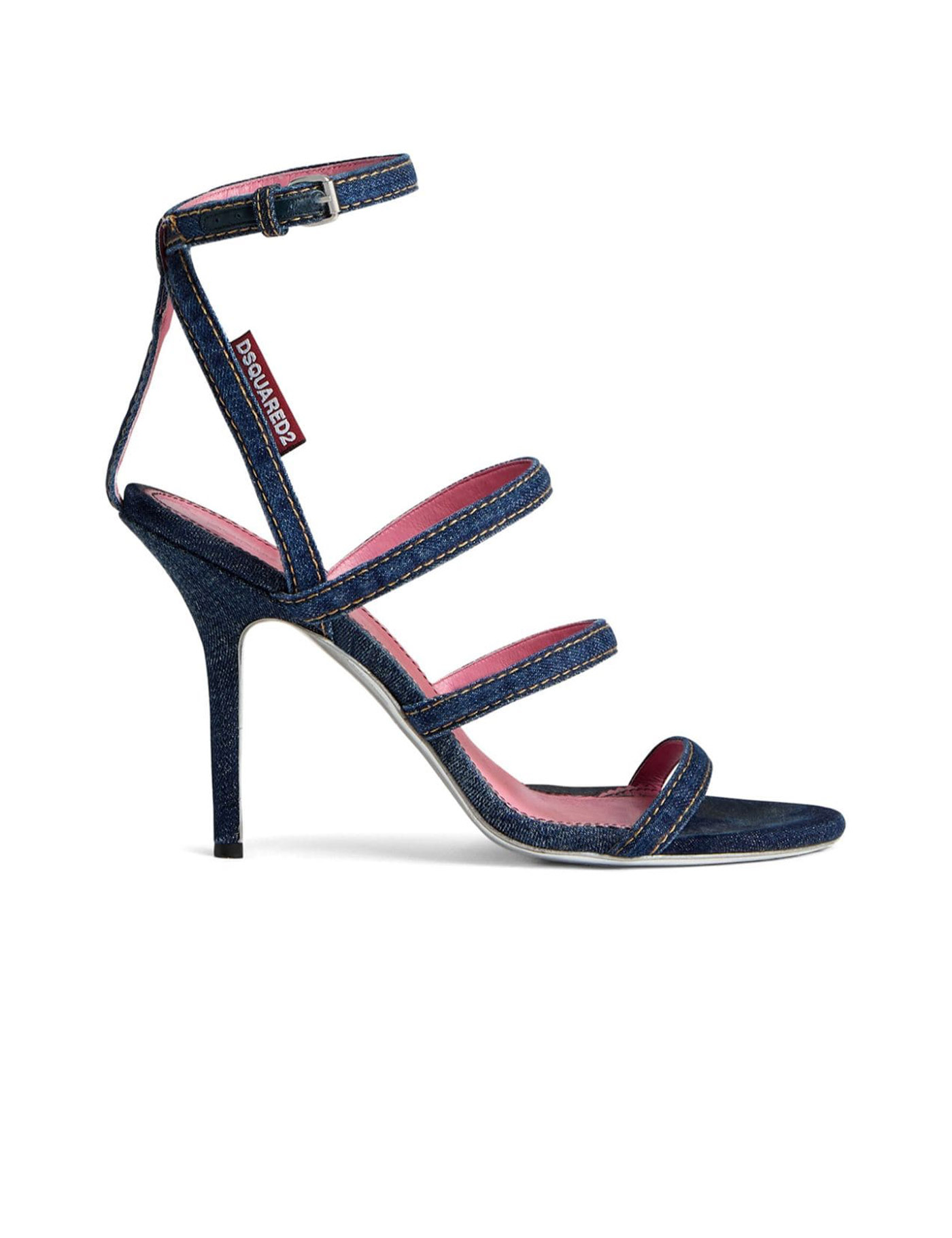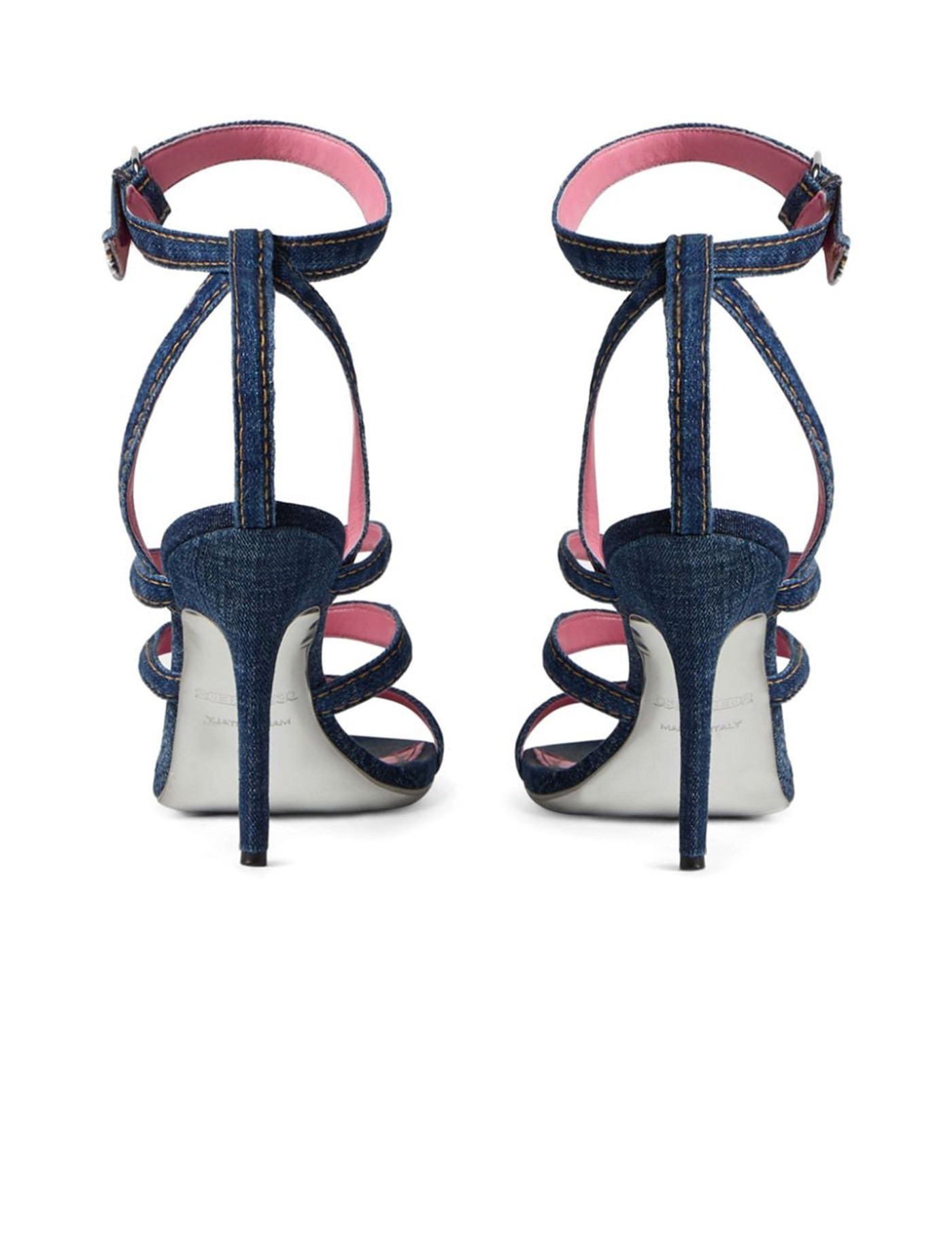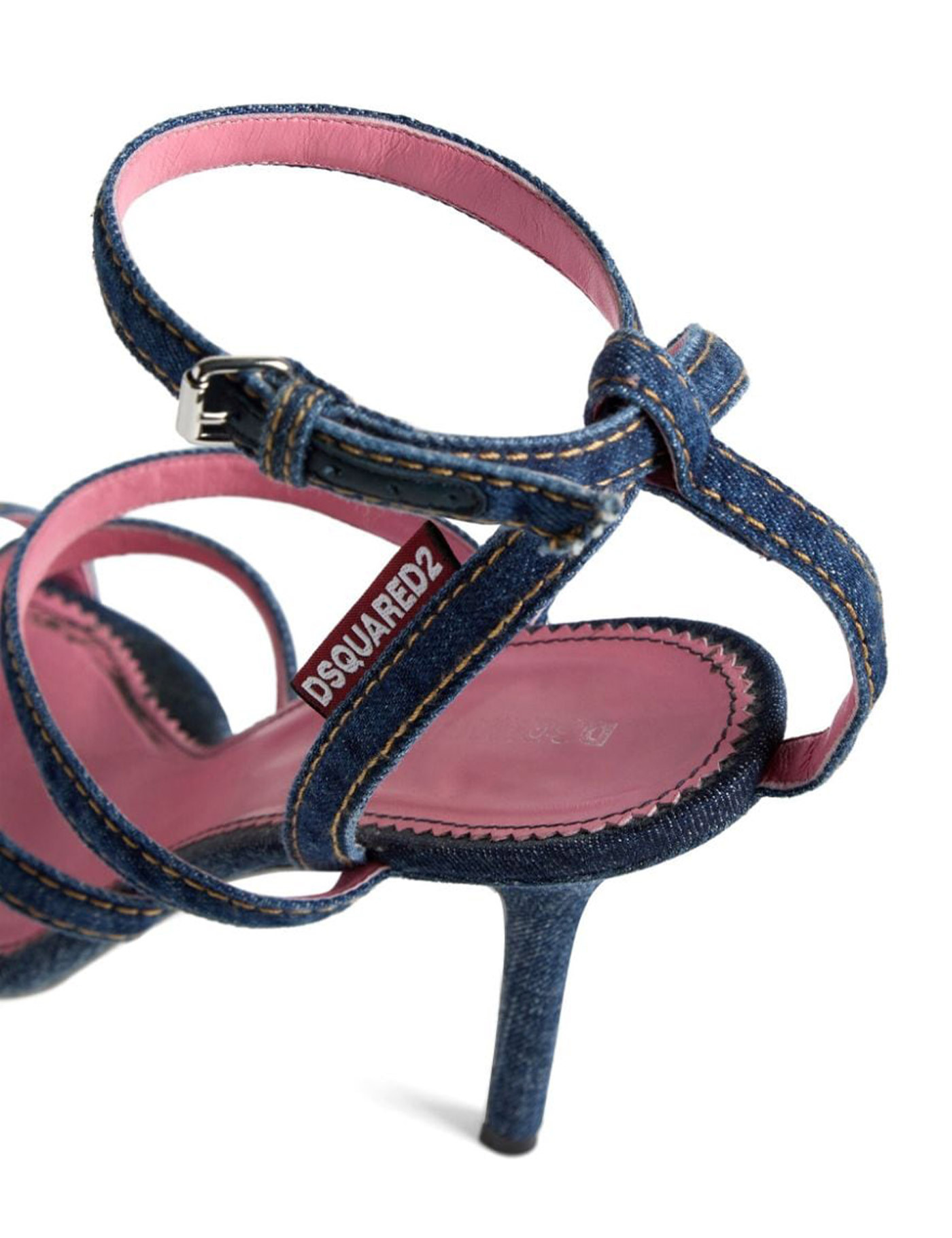 Cotton Sandals by Dsquared2, open front round toe, front ties, adjustable ankle lap strap closure with side buckle fastening, leather stiletto heel, denim design, logo insole.