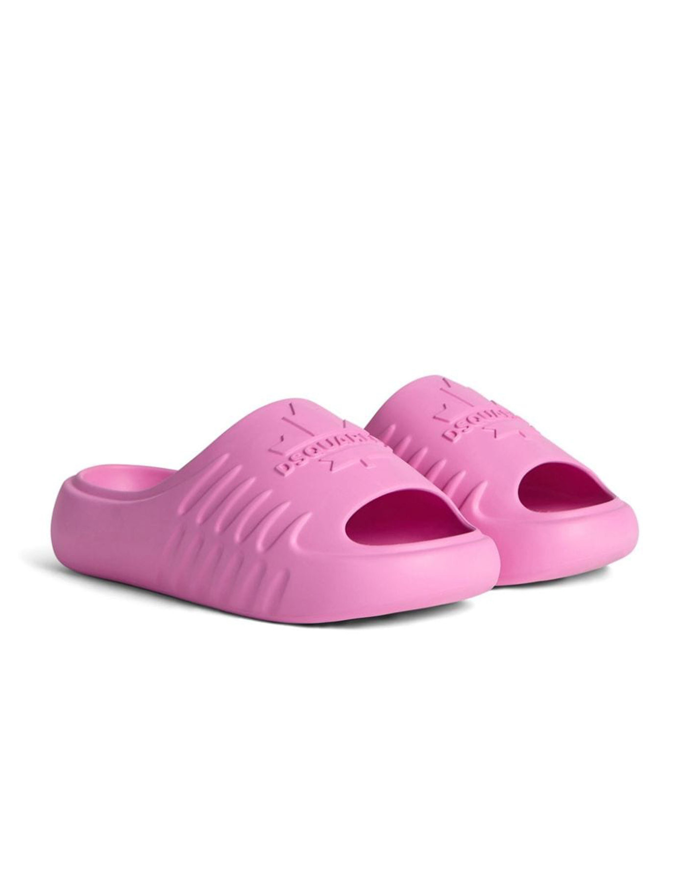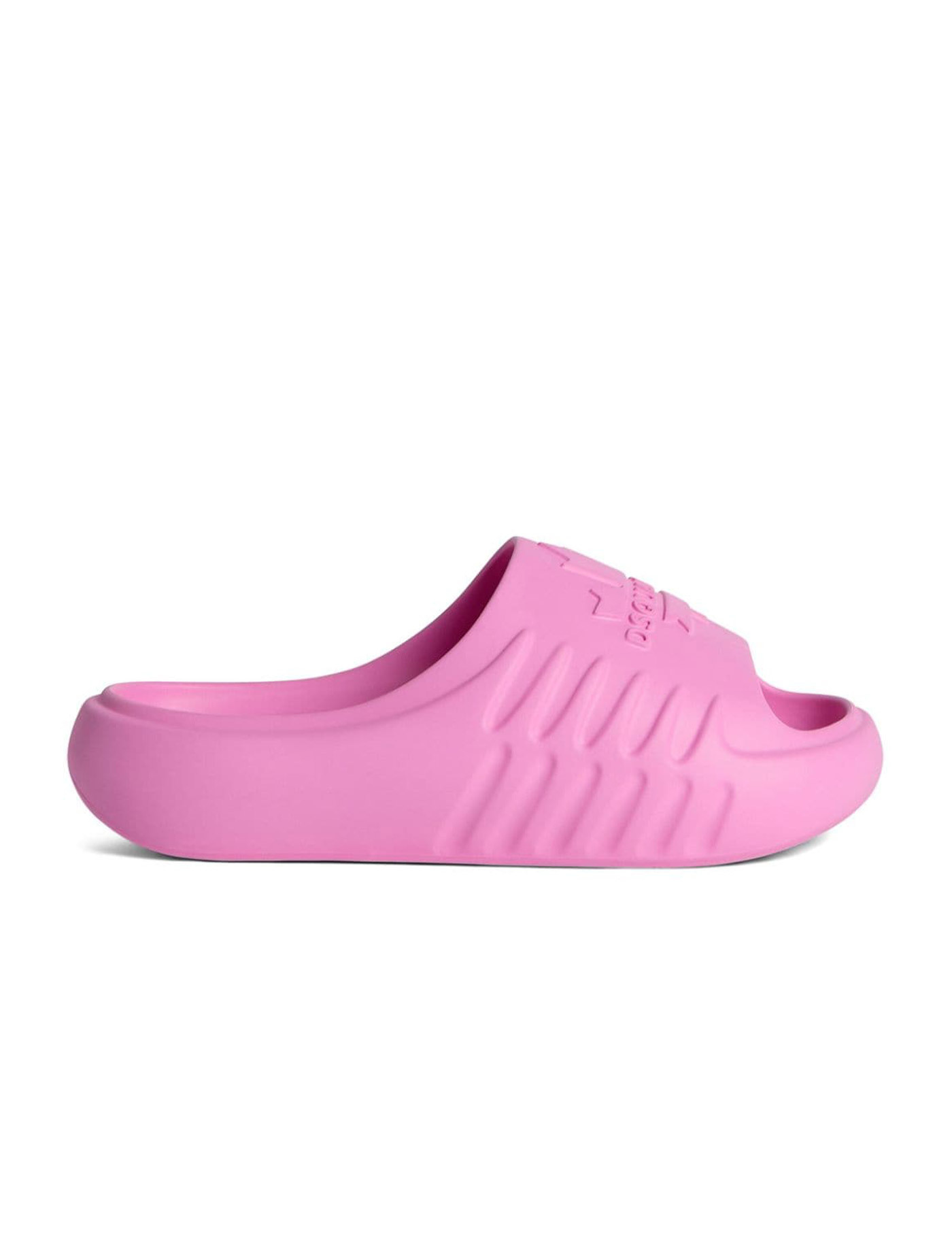 Pink rubber slides. Slip-on. Mask with embossed logo on the front.