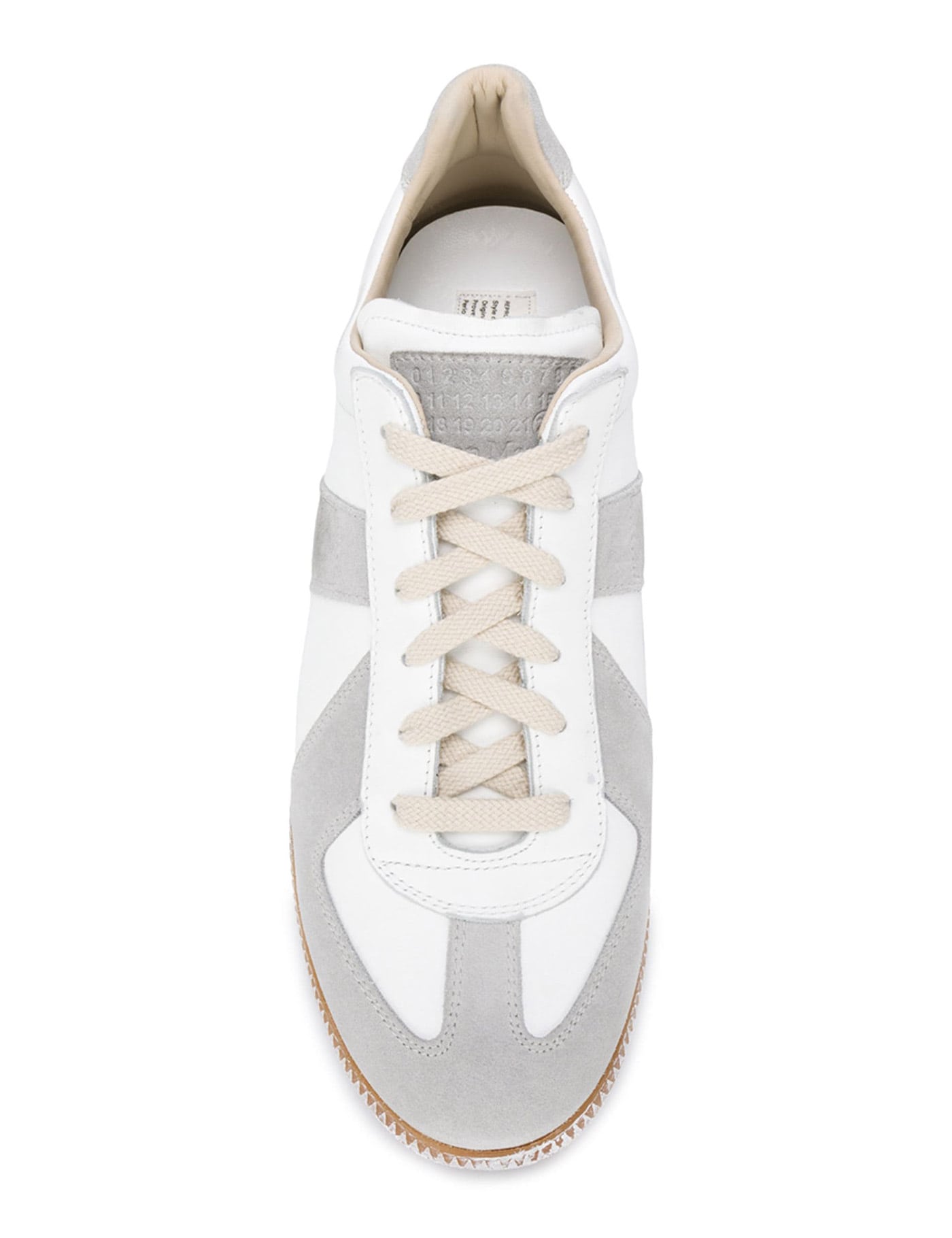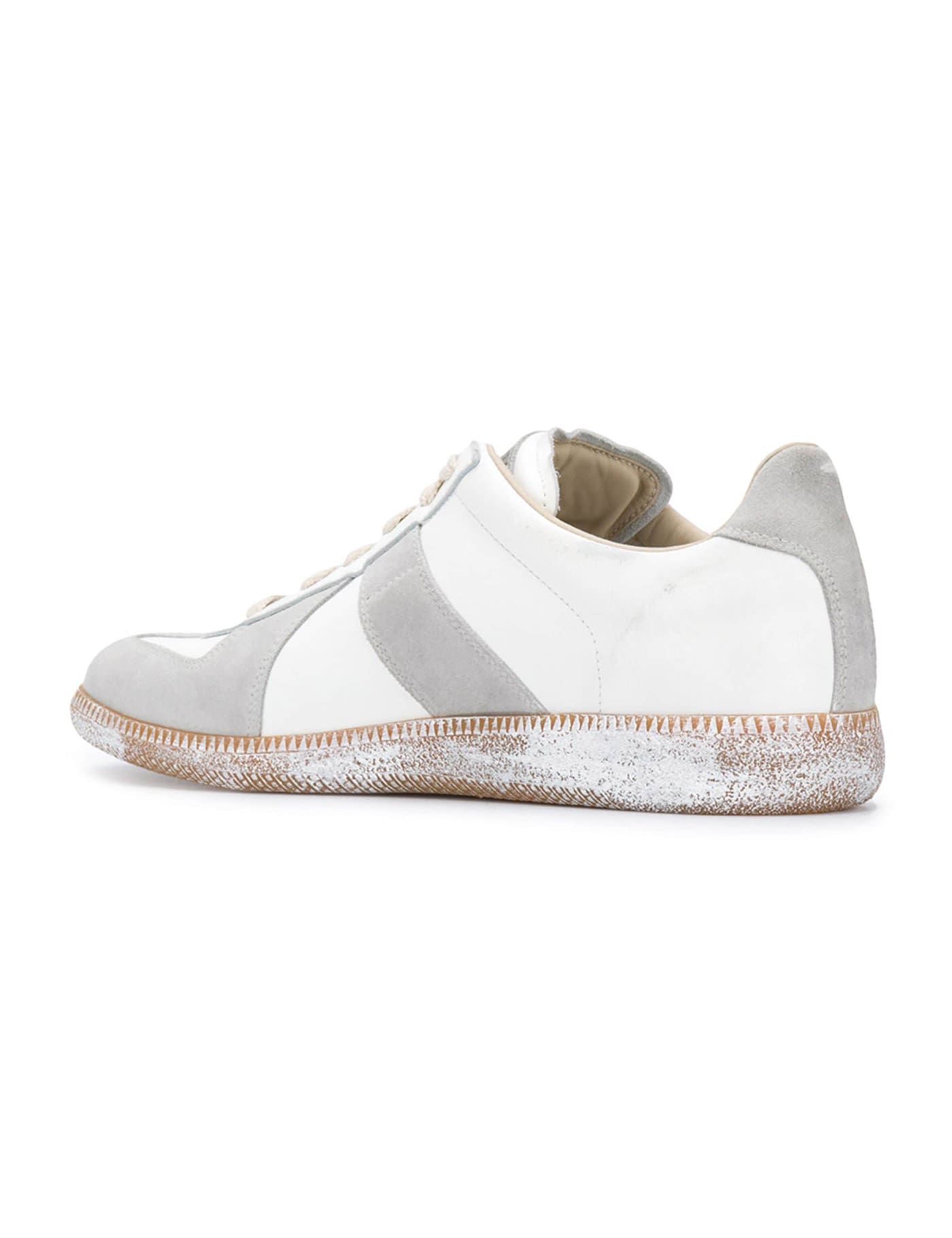Maison Margiela Replica sneakers made of vintage nappa leather with suede leather inserts. Iconic white stitching on the back, fabric interior with removable leather insole and hand-treated glossy rubber sole.